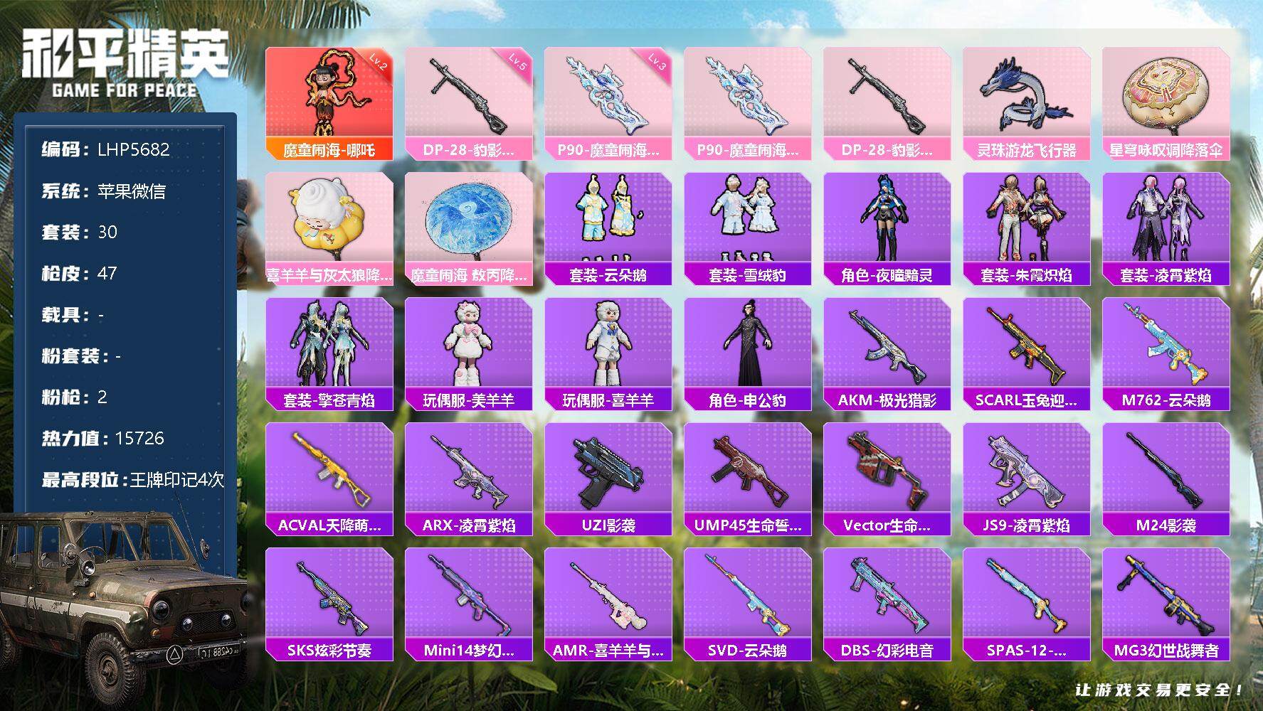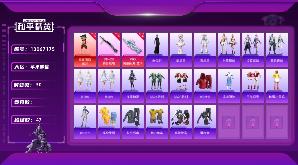[13067175]绝世印记1 苹果 微信-1神装-2特效枪-2粉色飞行器-1.5w热力值-4王牌印记-30套装-47枪皮【红色神装等级】:魔童闹海-哪吒(二级)【粉色枪皮等级】:P90-魔童闹海 敖丙(三级),DP-28-豹影疾电(五级)【粉色飞行器】:灵珠游龙飞行器