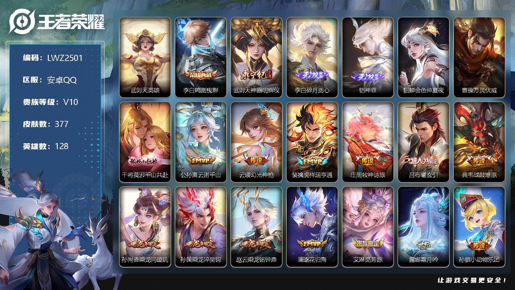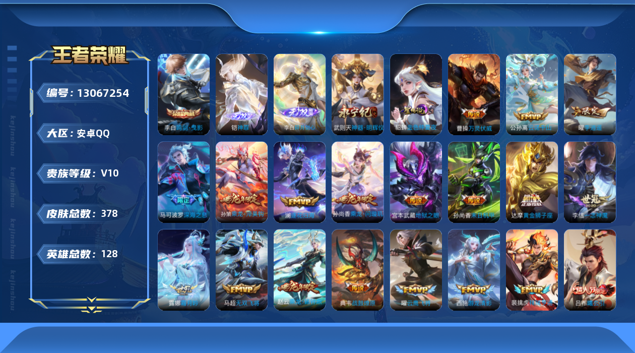 [13067254]安卓Q-V10-至尊星耀V段位-128英雄-377皮肤-1典藏-3无双-45传说-119史诗 【英雄全皮】:刘邦全皮,狂铁全皮,鲁班大师全皮 【荣耀典藏】:武则天英雄,李白鸣剑曳影 【无双皮肤】:武则天神器明辉仪,李白碎月剑心,铠神罪 【传说皮肤】:曹操万灵伏威,干将莫邪千山共赴,公孙离云诺千山,云缨幻光神枪,裴擒虎祥瑞亨通,庄周牧神诗旅,吕布曦玄引,典韦战鼓燎原,孙尚香乘龙问璇玑,孙策乘龙淬吴钩,赵云乘龙铭钟鼎,澜逐花归海,艾琳觅芳踪,露娜霜月吟,孙膑小动物乐团,宫本武藏惊梅引,东皇太一灼幽烈阳,公孙离记忆之芯,吕布怒海麟威,百里守约碎云,马可波罗深海之息,马超无双飞将,孙策挚爱之约,露娜启示之音,孙策末日机甲,赵云淬星耀世,王昭君乞巧织情,西施游龙清影,曜李逍遥 ,周瑜音你心动,李元芳飞鸢探春,铠绛天战甲,虞姬启明星使,曜云鹰飞将,李信一念神魔,张良黄金白羊座,干将莫邪久胜战神,虞姬云霓雀翎,达摩黄金狮子座,花木兰冠军飞将,后羿黄金射手座,貂蝉仲夏夜之梦,孙尚香末日机甲,宫本武藏地狱之眼,孙悟空地狱火 【限定皮肤】:白起狰,虞姬夏日便利店,姜子牙天穹之誓,狄仁杰阴阳师,赵云皇家上将,嬴政优雅恋人,嬴政白昼王子,孙尚香蔷薇恋人,庄周高山流水,阿轲迷踪丽影,钟无艳王者之锤,白起夜都怪侠,芈月重明,芈月幻夜卜梦,吕布猎兽之王,周瑜赤莲之焰,夏侯惇朔风刀,夏侯惇匿光决锋者,甄姬女儿国国王,曹操烛龙,典韦穷奇,马可波罗暗影游猎,马可波罗深海之息,狄仁杰魔术师,狄仁杰万华元夜,达摩沙漠行僧,项羽海滩派对,老夫子醍醐杖,关羽冰锋战神,程咬金演武夺筹,露娜一生所爱,露娜启示之音,刘邦夺宝奇兵,韩信傲雪梅枪,王昭君午后时光,兰陵王驯魔猎人,兰陵王金庭之子,花木兰瑞麟志,孙悟空大圣娶亲,牛魔御旌,后羿如梦令,李元芳云中旅人,虞姬启明星使,钟馗驱傩正仪,杨玉环遇见飞天,杨玉环寅虎心曲,杨戬潮玩骑兵,女娲朔望之晖,蔡文姬繁星吟游,太乙真人饕餮,东皇太一逐梦之光,鬼谷子原初探秘者,鬼谷子五谷丰年,黄忠火炮绅士,苏烈千军破阵,百里玄策原初追逐者,百里守约朱雀志,弈星混沌棋,公孙离玉兔公主,沈梦溪大漠名商,明世隐疑决卦,明世隐吟游魔法,裴擒虎李小龙,裴擒虎擒涛扼浪,狂铁御狮,狂铁电玩高手,米莱狄御霄,米莱狄胡桃异想国,云中君纤云弄巧,盾山御銮,孙策挚爱之约,猪八戒西部大镖客,上官婉儿梁祝,