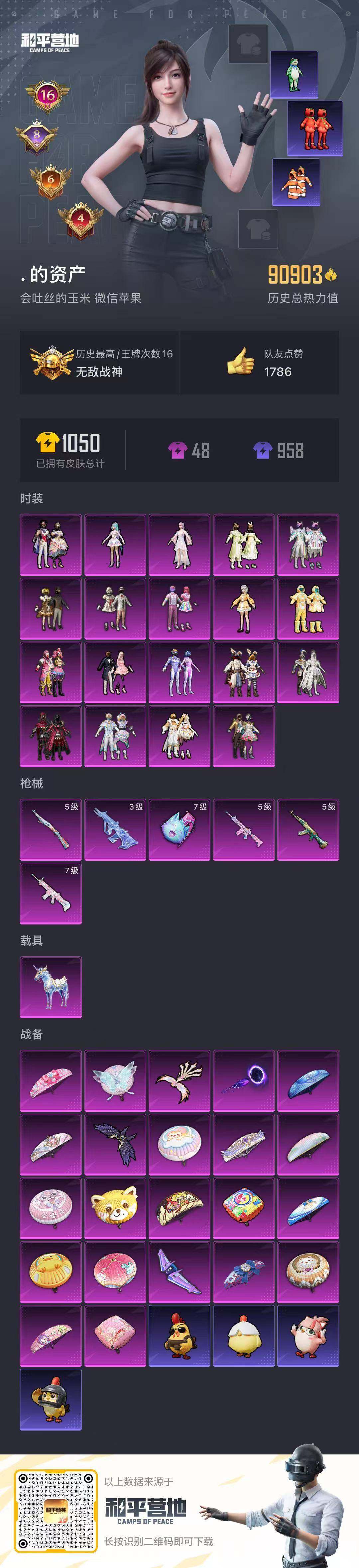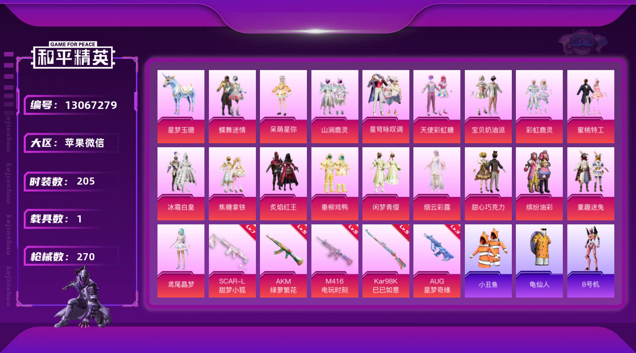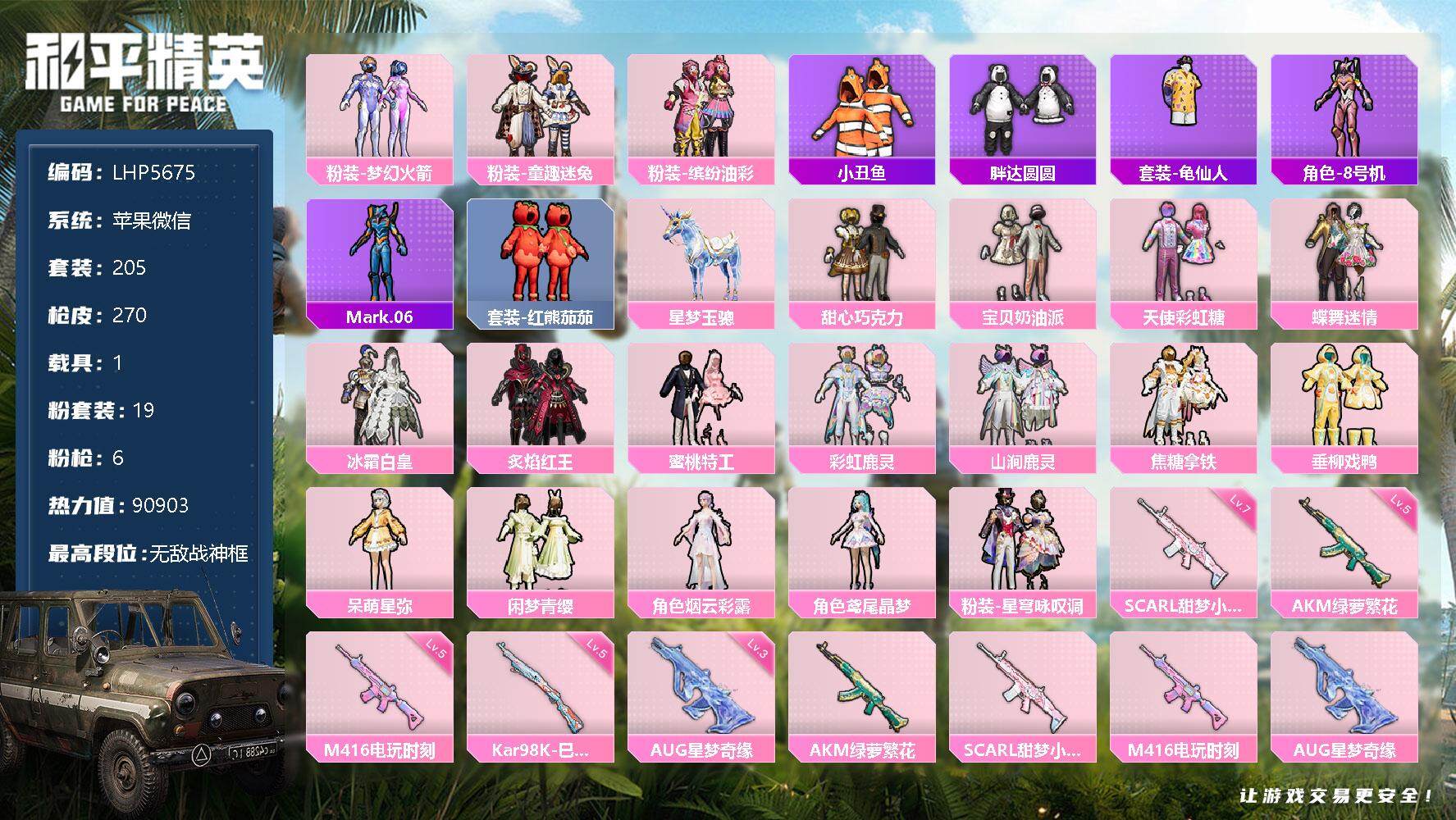 [13067279]苹果 微信-2个无敌战神框-19粉装-6特效枪-1载具-4粉色飞行器-90903热力值-16王牌印记-205套装-270枪皮【热门品类】:粉装-梦幻火箭,粉装-童趣迷兔,粉装-缤纷油彩,套装-小丑鱼,套装-胖达圆圆,套装-龟仙人,角色-8号机,角色-Mark.06,套装-红熊茄茄【粉色载具】:星梦玉骢【粉色套装】:粉装-甜心巧克力,粉装-宝贝奶油派,粉装-天使彩虹糖,粉装-蝶舞迷情,粉装-梦幻火箭,粉装-缤纷油彩,粉装-冰霜白皇,粉装-童趣迷兔,粉装-炙焰红王,粉装-蜜桃特工,粉装-彩虹鹿灵,粉装-山涧鹿灵,粉装-焦糖拿铁,粉装-垂柳戏鸭,角色-呆萌星弥,粉装-闲梦青缨,角色-烟云彩露,角色-鸢尾晶梦,粉装-星穹咏叹调【粉色枪皮等级】:AKM-绿萝繁花(五级),SCAR-L-甜梦小狐(七级),M416-电玩时刻(五级),AUG-星梦奇缘(三级),Kar98K-巳巳如意(五级)【粉色枪皮】:AKM-绿萝繁花,SCAR-L-甜梦小狐,M416-电玩时刻,AUG-星梦奇缘,Kar98K-巳巳如意,破片手榴弹-粉粉猫爪【粉色飞行器】:梦幻火箭飞行器,星夜魔法师飞行翼,深渊漩涡飞行器,凤舞九天飞行器