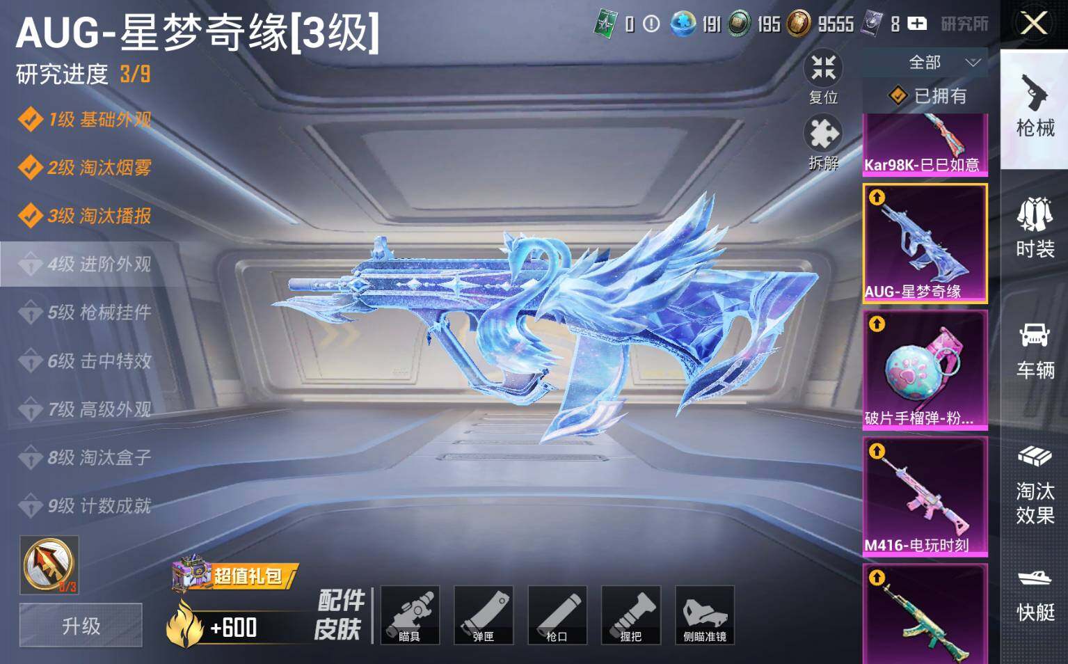 AKM-绿萝繁花,SCAR-L-甜梦小狐,M416-电玩时刻,AUG-星梦奇缘,Kar98K-巳巳如意,破片手榴弹-粉粉猫爪