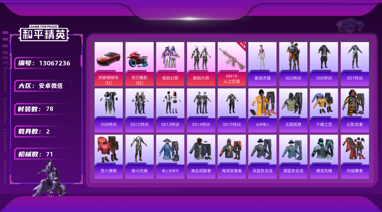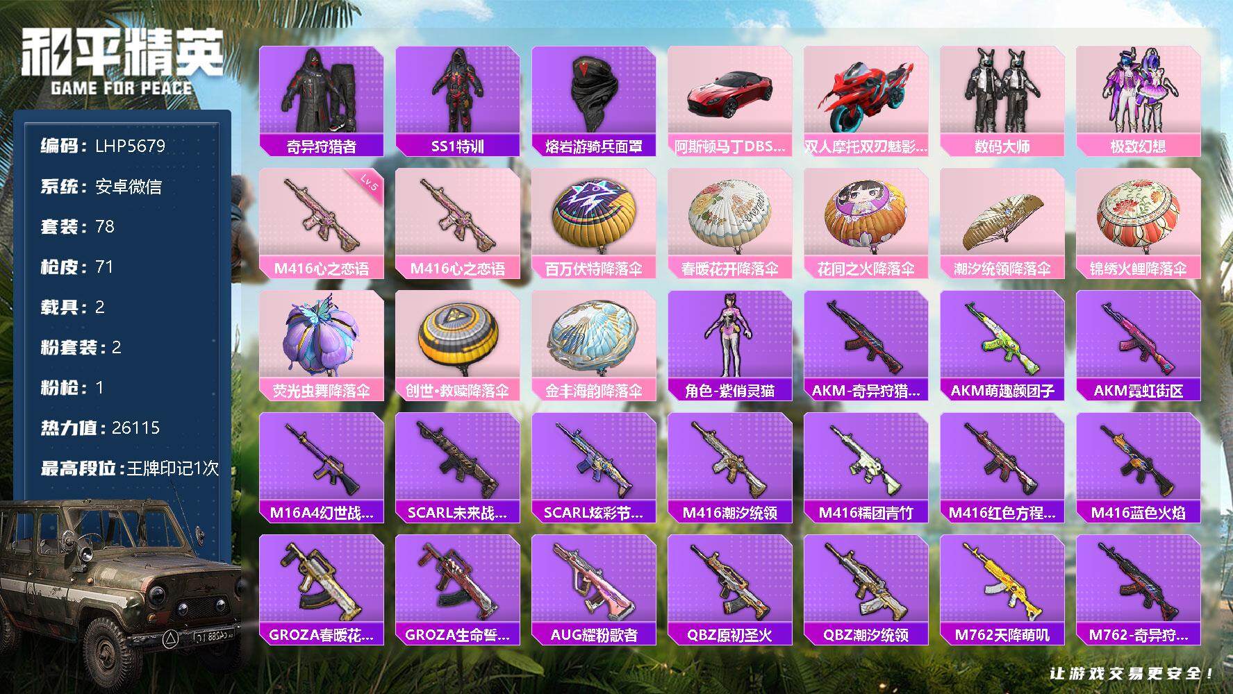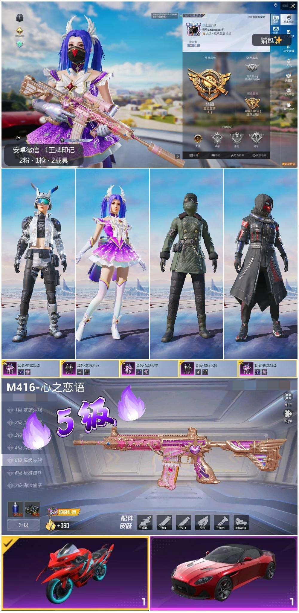 [13067236]安卓 微信-2粉装-1特效枪-2载具-2.6w热力值-1王牌印记-78套装-71枪皮【热门品类】:套装-奇异狩猎者,套装-SS1特训,熔岩游骑兵面罩【粉色载具】:阿斯顿马丁DBS(红),双人摩托-双刃魅影(红)【粉色套装】:粉装-数码大师,粉装-极致幻想【粉色枪皮等级】:M416-心之恋语(五级)