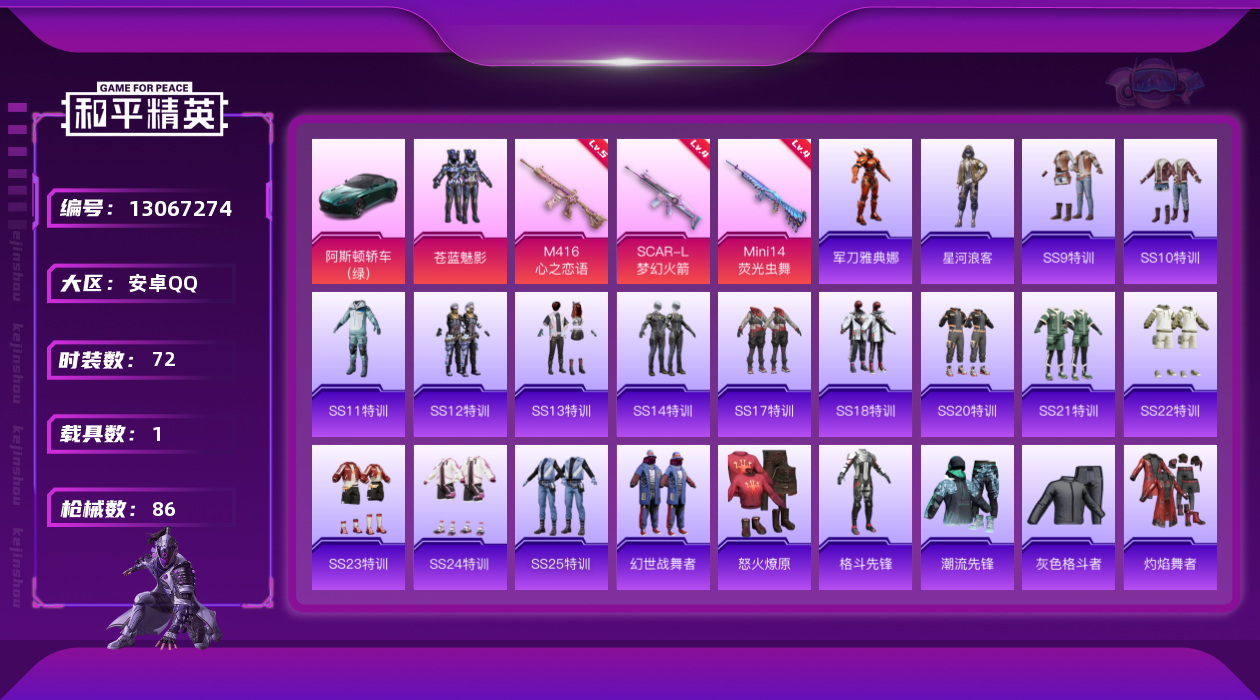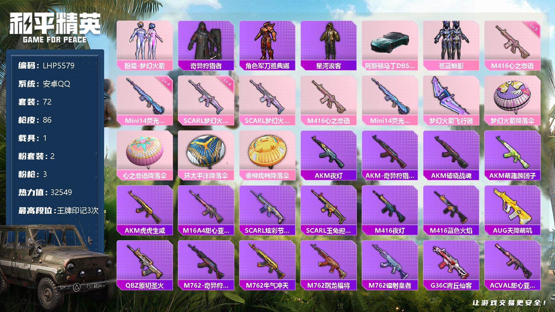 [13067274]安卓 手Q-2粉装-3特效枪-1载具-1粉色飞行器-3.2w热力值-3王牌印记-72套装-86枪皮【热门品类】:粉装-梦幻火箭,套装-奇异狩猎者,角色-军刀雅典娜,套装-星河浪客【粉色载具】:阿斯顿马丁DBS(绿)【粉色套装】:粉装-梦幻火箭,粉装-苍蓝魅影【粉色枪皮等级】:SCAR-L-梦幻火箭(四级),M416-心之恋语(五级),Mini14-荧光虫舞(四级)【粉色飞行器】:梦幻火箭飞行器
