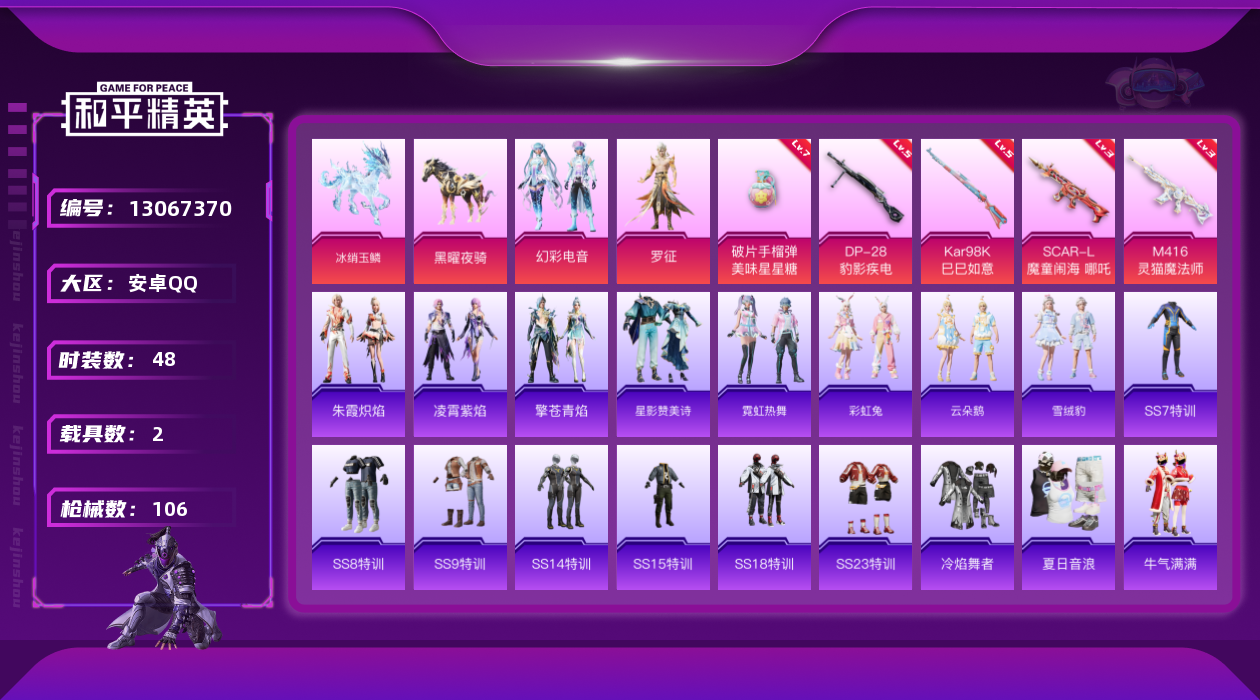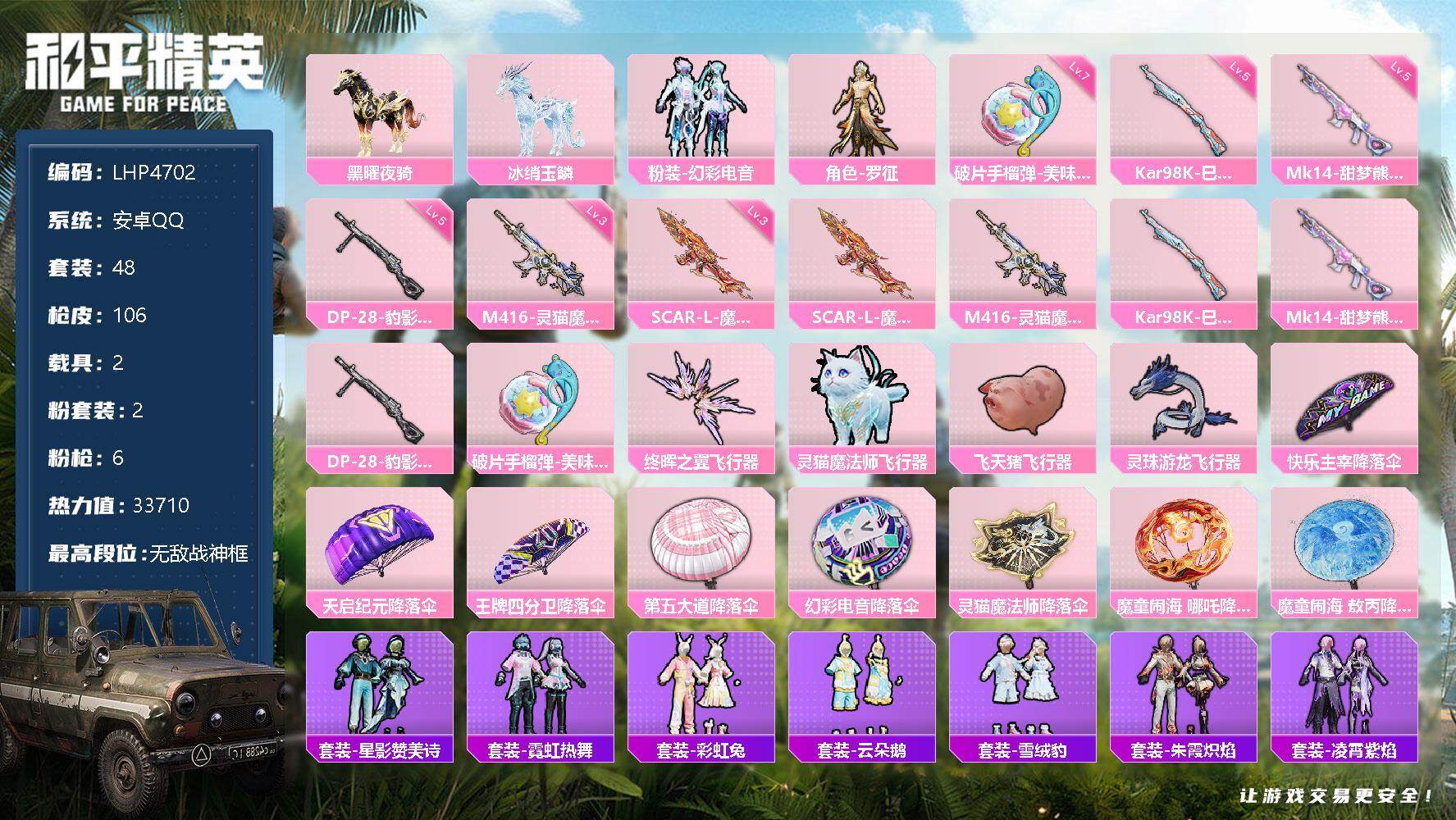 [13067370]素材身法号/无敌战神框1/绝世印记2/璀璨碎片1811/扭蛋碎片452/地铁满天赋【特价急出/详情看图】:安卓 手Q-无敌战神框-2粉装-6特效枪-2载具-4粉色飞行器-3.3w热力值-4王牌印记-48套装-106枪皮【粉色载具】:黑曜夜骑,冰绡玉鳞【粉色套装】:粉装-幻彩电音,角色-罗征【粉色枪皮等级】:SCAR-L-魔童闹海 哪吒(三级),M416-灵猫魔法师(三级),Kar98K-巳巳如意(五级),Mk14-甜梦熊击(五级),DP-28-豹影疾电(五级),破片手榴弹-美味星星糖(七级)【粉色飞行器】:终晖之翼飞行器,灵猫魔法师飞行器,飞天猪飞行器,灵珠游龙飞行器