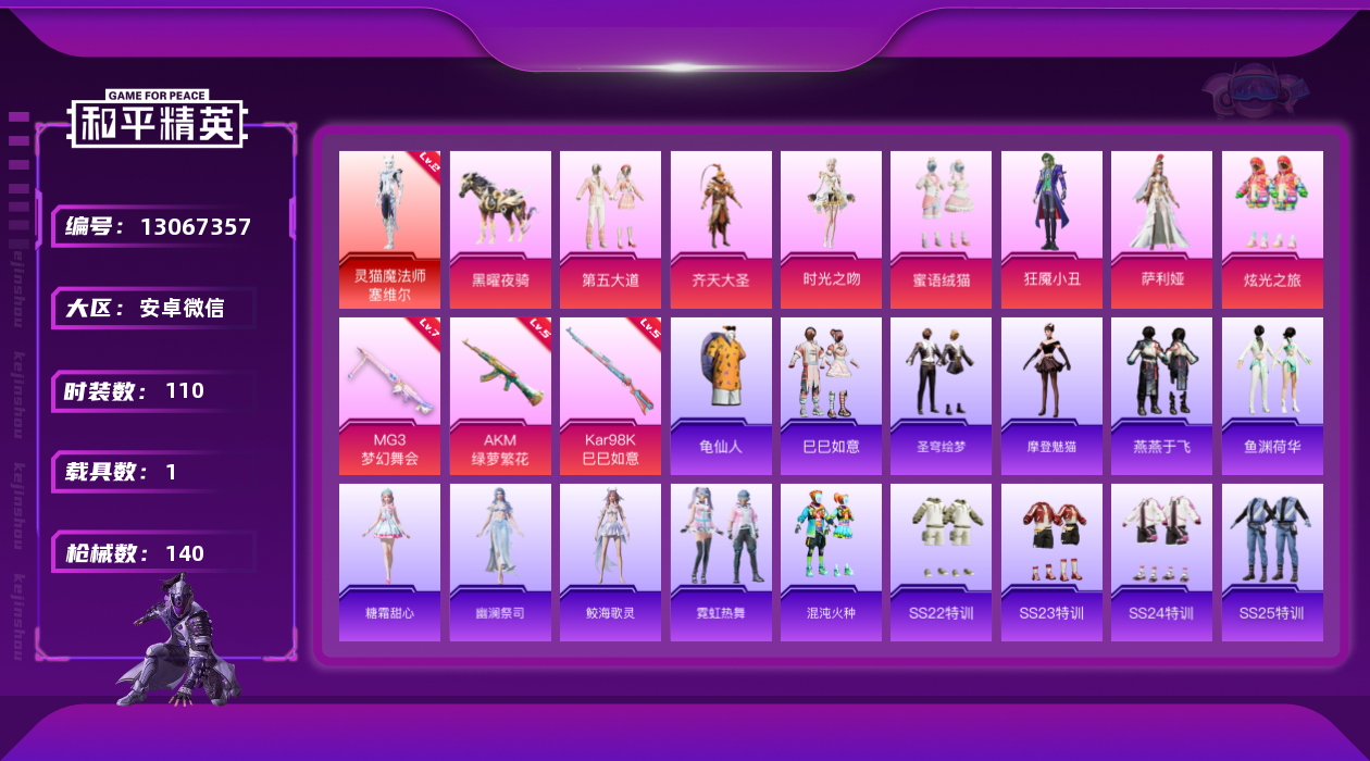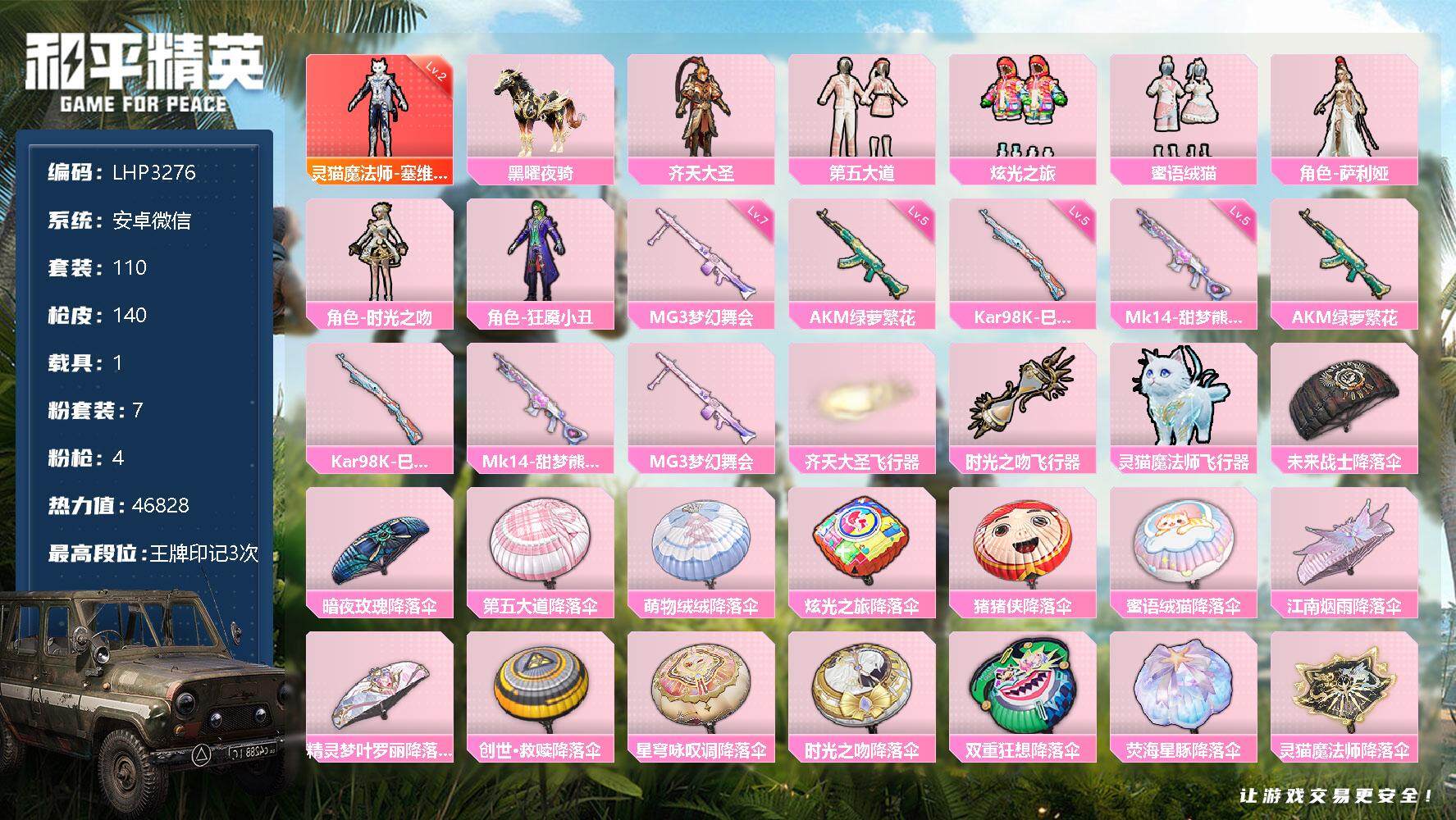[13067357]【暑期末清货/特价急出/永久包赔】:安卓 微信-1红装-7粉装-4特效枪-1载具-46828热力值-3印记-110套装-140枪皮【角色神装等级】:灵猫魔法师-塞维尔(二级)【稀有载具】:黑曜夜骑【特效枪等级】:AKM-绿萝繁花(五级),Kar98K-巳巳如意(五级),MG3-梦幻舞会(七级),MG3-辉羽雀灵(五级Mk14-甜梦熊击)【优质套装】:粉装-齐天大圣,粉装-第五大道,粉装-炫光之旅,粉装-蜜语绒猫,角色-萨利娅,角色-时光之吻,角色-狂魇小丑【优质飞行器】:齐天大圣飞行器,时光之吻飞行器,灵猫魔法师飞行器