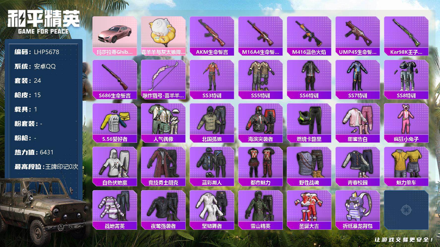 [13067272]安卓 手Q-1载具-6431热力值-1王牌印记-24套装-15枪皮【粉色载具】:玛莎拉蒂Ghibli(粉)