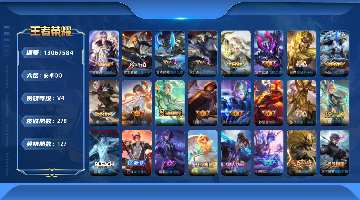[13067584]安卓Q-V4-最强王者段位-127英雄-278皮肤-1典藏-3星传说-1珍品传说-11传说-74史诗