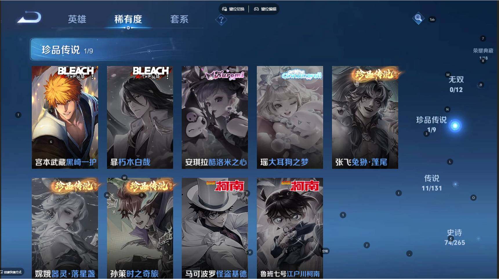 - PX_2080941-09 安卓QQ/永恒钻石/203皮肤/124英雄/2典藏/0珍品无双/0无双/5珍品传说/20传说/58史诗/8稀有英雄 【5 珍品传说】大耳狗之梦 瑶,怪盗基德 马可波罗,时之奇旅 孙策,江户川柯南 鲁班七号,兔狲·蓬尾 张飞, 【2 典藏皮肤】星域神启 诸葛亮,拾光映像 瑶, 【20 传说皮肤】启明星使 虞姬,云霓雀翎 虞姬,碎云 百里守约,飞鸢探春 李元芳,无双飞将 马