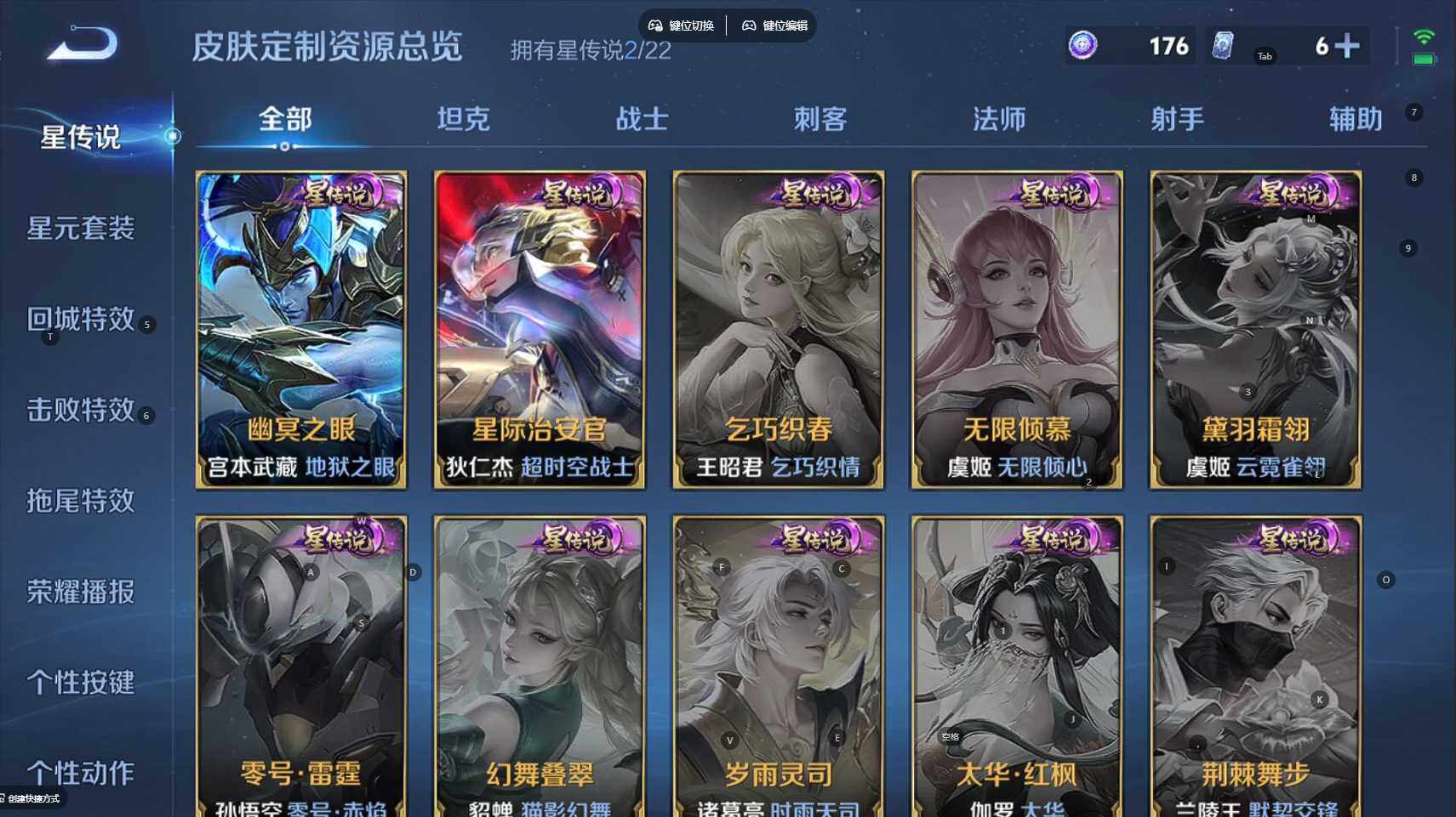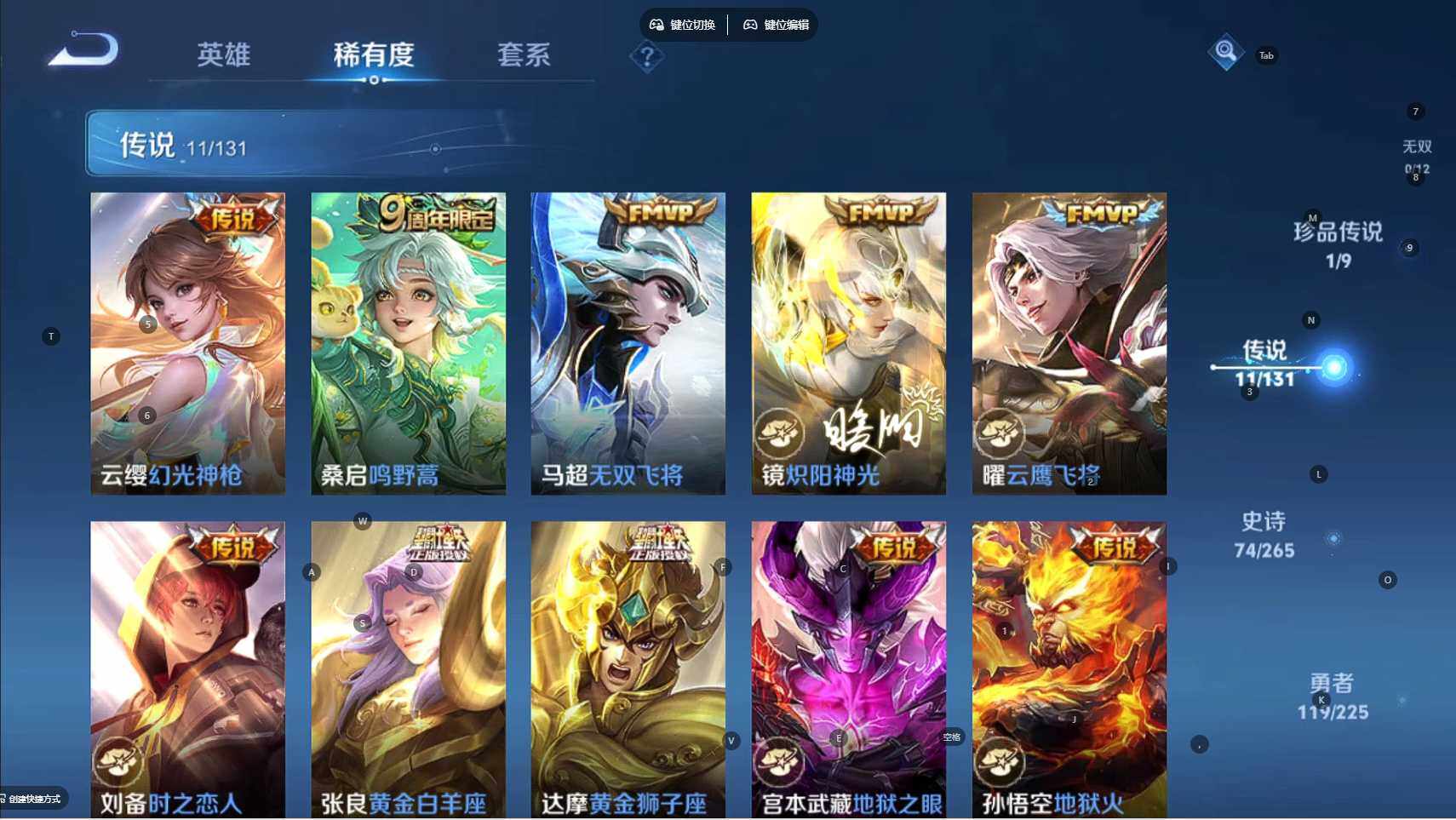 【传说皮肤】:云缨幻光神枪,桑启鸣野蒿,马超无双飞将,镜炽阳神光,曜云鹰飞将,刘备时之恋人,张良黄金白羊座,达摩黄金狮子座,宫本武藏地狱之眼,孙悟空地狱火,狄仁杰超时空战士