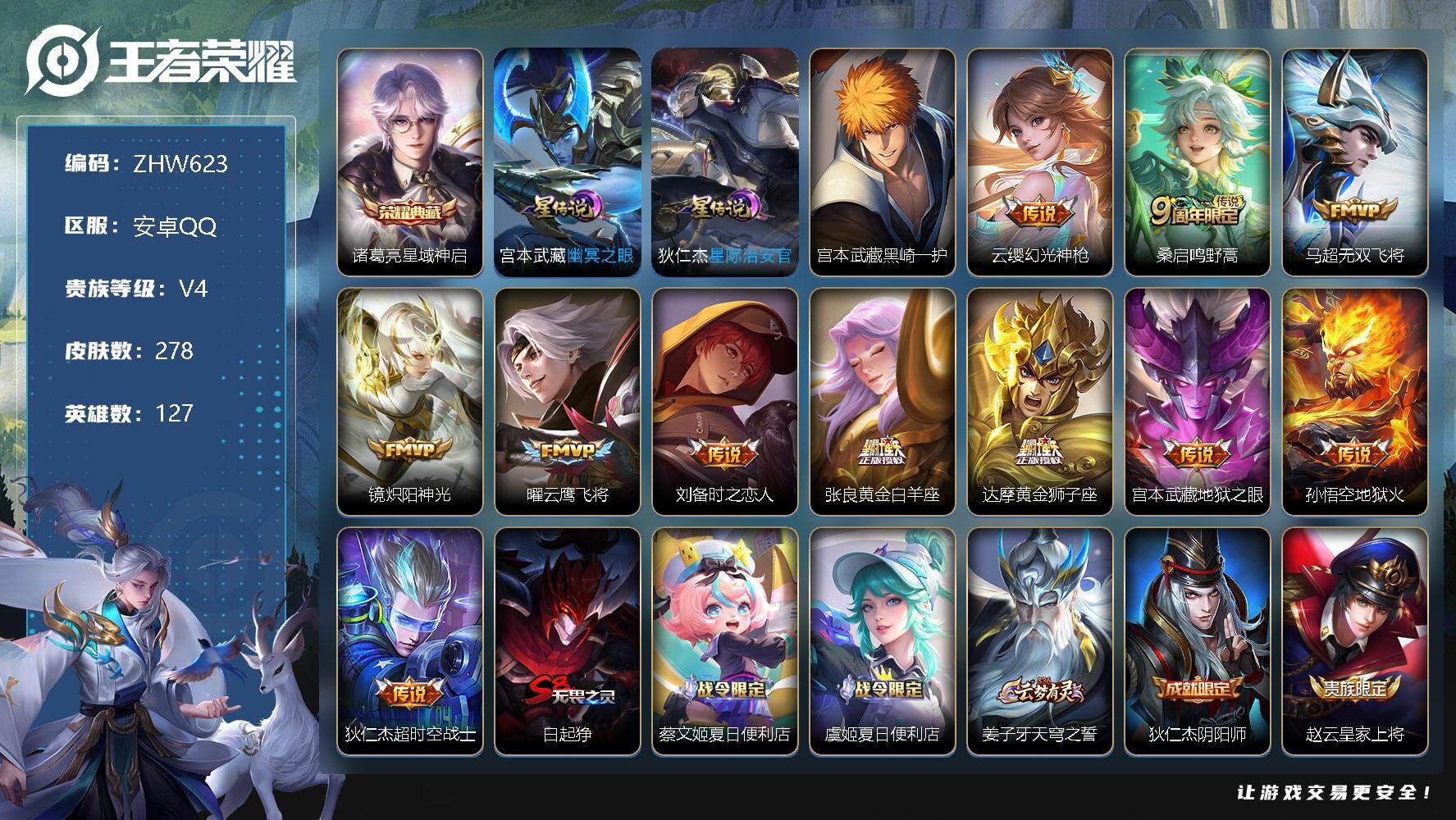 [13067584]安卓Q-V4-最强王者段位-127英雄-278皮肤-1典藏-3星传说-1珍品传说-11传说-74史诗 【英雄全皮】:空空儿全皮,影全皮 【荣耀典藏】:诸葛亮星域神启 【珍品传说】:宫本武藏黑崎一护 【传说皮肤】:云缨幻光神枪,桑启鸣野蒿,马超无双飞将,镜炽阳神光,曜云鹰飞将,刘备时之恋人,张良黄金白羊座,达摩黄金狮子座,宫本武藏地狱之眼,孙悟空地狱火,狄仁杰超时空战士 【限定皮肤】:白起狰,蔡文姬夏日便利店,虞姬夏日便利店,姜子牙天穹之誓,狄仁杰阴阳师,赵云皇家上将,墨子神迹守卫,嬴政白昼王子,庄周高山流水,阿轲迷踪丽影,钟无艳王者之锤,孙膑天狼运算者,芈月重明,吕布猎兽之王,吕布御风骁将,元歌云间偶戏,甄姬游园惊梦,曹操烛龙,典韦穷奇,马可波罗暗影游猎,狄仁杰魔术师,狄仁杰万华元夜,达摩沙漠行僧,项羽海滩派对,项羽霸王别姬,老夫子醍醐杖,程咬金演武夺筹,刘邦夺宝奇兵,兰陵王金庭之子,亚瑟潮玩骑士王,孙悟空至尊宝,牛魔奔雷神使,后羿辉光之辰,后羿如梦令,后羿圣弓游侠,李元芳银河之约,杨玉环遇见飞天,干将莫邪冰霜恋舞曲,干将莫邪真爱魔法,雅典娜单词大作战,雅典娜黎明之约,蔡文姬繁星吟游,太乙真人饕餮,鬼谷子原初探秘者,鬼谷子五谷丰年,苏烈千军破阵,百里玄策原初追逐者,弈星混沌棋,沈梦溪星空之诺,沈梦溪大漠名商,明世隐疑决卦,裴擒虎李小龙,裴擒虎擒涛扼浪,狂铁御狮,云中君纤云弄巧,盾山御銮,猪八戒西部大镖客,上官婉儿梁祝,嫦娥拒霜思,蒙犽狂想玩偶喵,鲁班大师探海日志,桑启海盐诗旅,艾琳女武神,阿古朵江河有灵,张良古海寻踪,鬼谷子天穹祈灯,姬小满妄想食味,沈梦溪龙舞盛年,刘邦剑破天穹,程咬金群星魔术团,周瑜熔金海岸 【年限皮肤】:后羿辉光之辰,吕布御风骁将,牛魔奔雷神使,马超神威 【赛季限定】:白起狰,芈月重明,曹操烛龙,典韦穷奇,狄仁杰万华元夜,达摩沙漠行僧,老夫子醍醐杖,程咬金演武夺筹,兰陵王金庭之子,张良古海寻踪,雅典娜黎明之约,太乙真人饕餮,鬼谷子原初探秘者,苏烈千军破阵,百里玄策原初追逐者,弈星混沌棋,沈梦溪大漠名商,明世隐疑决卦,裴擒虎擒涛扼浪,狂铁御狮,盾山御銮,鲁班大师探海日志,桑启海盐诗旅,鬼谷子天穹祈灯,刘邦剑破天穹,姜子牙天穹之誓 【战令限定】:墨子神迹守卫,蔡文姬夏日便利店,虞姬夏日便利店,嬴政白昼王子,阿轲迷踪丽影,吕布猎兽之王,元歌云间偶戏,