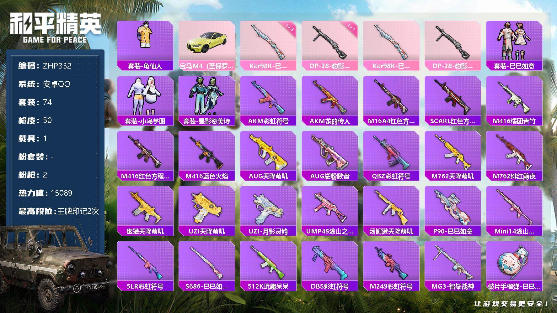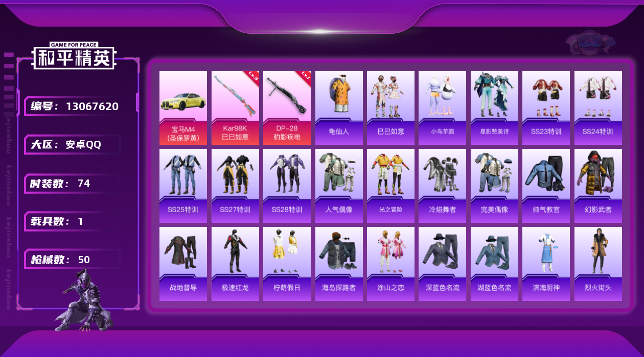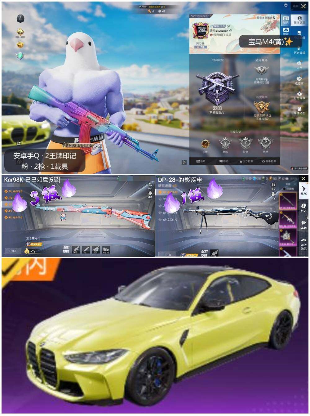 [13067620]地铁满天赋 安卓 手Q-2特效枪-1载具-1.5w热力值-2王牌印记-74套装-50枪皮【热门品类】:套装-龟仙人【粉色载具】:宝马M4(圣保罗黄)【粉色枪皮等级】:Kar98K-巳巳如意(三级),DP-28-豹影疾电(一级)