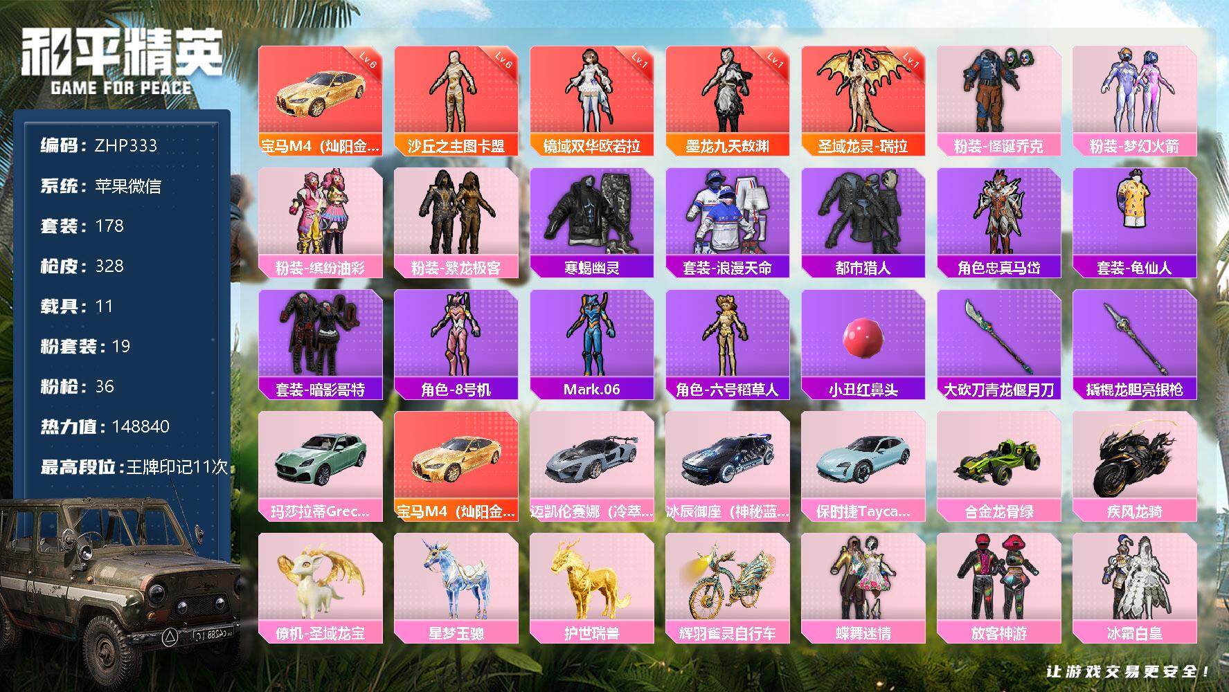 [13067613]素材身法号/沙丘之主-图卡盟(六级)/宝马M4(灿阳金)(六级)/璀璨碎片591 苹果 微信-4神装-19粉装-36特效枪-11载具-23粉色飞行器-14.8w热力值-11王牌印记-178套装-328枪皮【红色载具】:宝马M4(灿阳金)(六级)【红色神装等级】:圣域龙灵-瑞拉(一级),墨龙九天-敖渊(一级),镜域双华-欧若拉(一级),沙丘之主-图卡盟(六级)【热门品类】:粉装-怪诞乔克,粉装-梦幻火箭,粉装-缤纷油彩,粉装-繁龙极客,套装-寒蝎幽灵,套装-浪漫天命,套装-都市猎人,角色-忠真马岱,套装-龟仙人,套装-暗影哥特,角色-8号机,角色-Mark.06,角色-六号稻草人,小丑红鼻头,大砍刀-青龙偃月刀,撬棍-龙胆亮银枪【粉色载具】:玛莎拉蒂Grecale(薄荷绿),宝马M4(灿阳金),迈凯伦塞纳(冷萃蓝),冰辰御座(神秘蓝),保时捷Taycan 旅行版(冰晶蓝),合金龙骨(绿),疾风龙骑,僚机-圣域龙宝,星梦玉骢,护世瑞兽,辉羽雀灵自行车【粉色套装】:粉装-怪诞乔克,粉装-蝶舞迷情,粉装-梦幻火箭,粉装-缤纷油彩,粉装-放客神游,粉装-冰霜白皇,粉装-星之彼岸,粉装-第五大道,粉装-闲梦青缨,角色-圣堂之誓,粉装-繁龙极客,角色-烟云彩露,角色-美雪,粉装-金丰海韵,粉装-英伦信使,角色-月影灵韵,角色-智耀战神,角色-荧海星豚,角色-异瞳寒姬【粉色枪皮等级】:AKM-绿萝繁花(五级),AKM-幻海仙踪(四级),SCAR-L-梦幻火箭(一级),SCAR-L-锦绣绵绵(五级),SCAR-L-金蛇镇世(六级),M416-全功率超战(一级),M416-墨龙九天(一级),M416-灵猫魔法师(六级),GROZA-巴啦啦小魔仙(三级),AUG-星之彼岸(五级),蜜獾-辉耀战甲(三级),蜜獾-荧海星豚(一级),UMP45-量子极限(五级),UMP45-宇宙意志(三级),Vector-最终圣卫者(三级),汤姆逊-星月云朵(二级MK12-雪月幻音),汤姆逊-热量炸弹(五级),AKS-74U-信仰神谕(四级),P90-沙丘之主(三级),Kar98K-巳巳如意(五级),Kar98K-圣域龙灵(三级),M24-镜域双华(三级),AWM-湮灭星辰(四级),Mk14-甜梦熊击(五级),AMR-鸢尾晶梦(四级),M417-第五大道(三级),M200-梦海之灵(二级),DP-28-千金