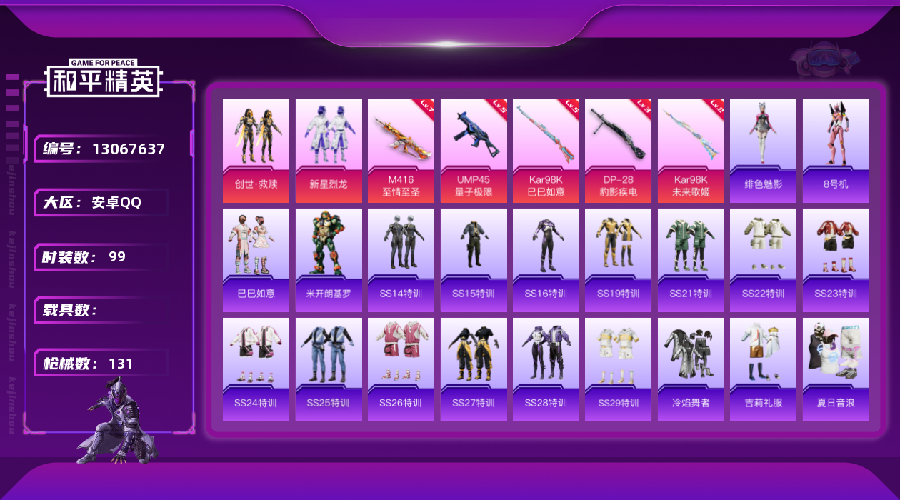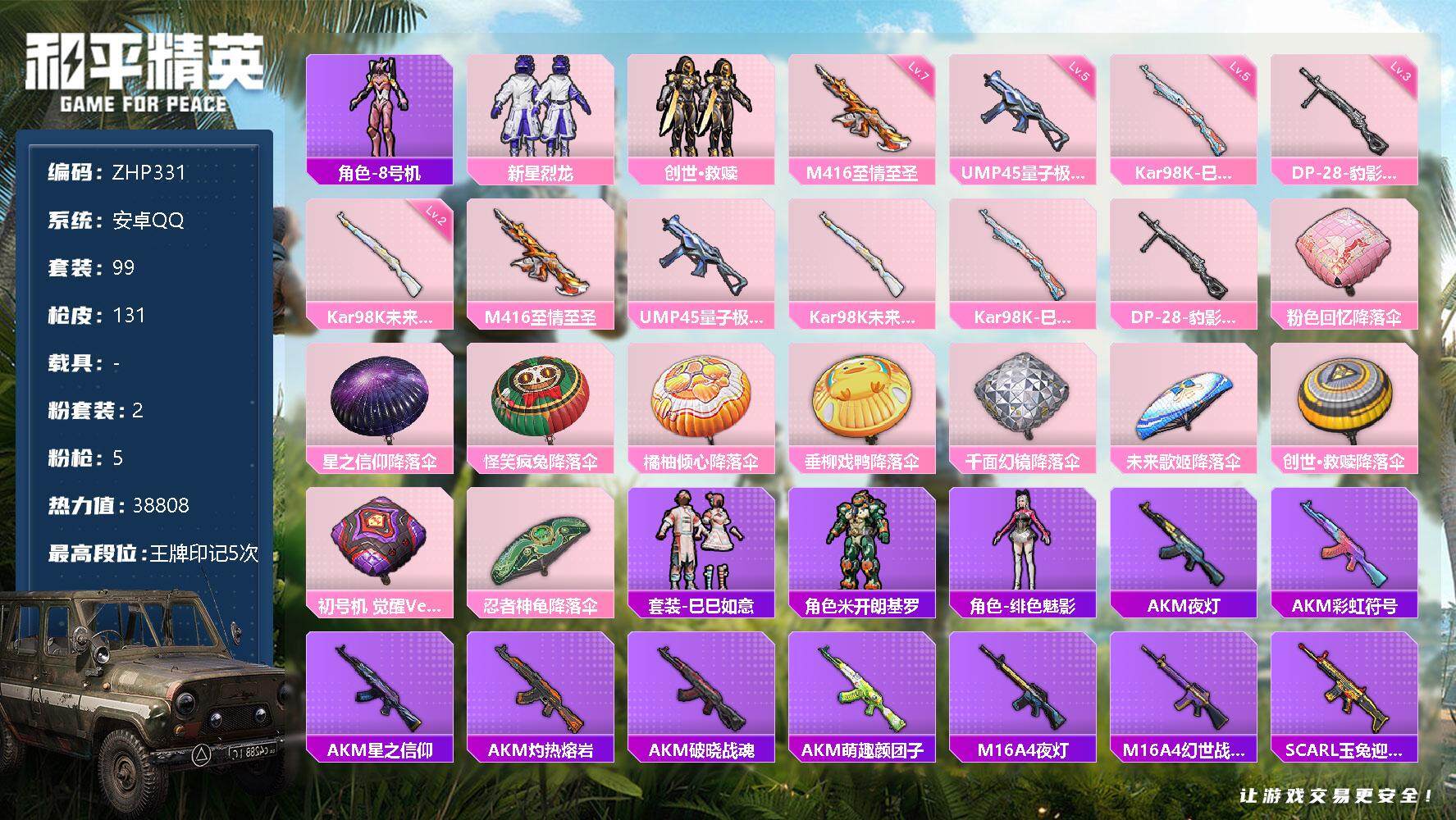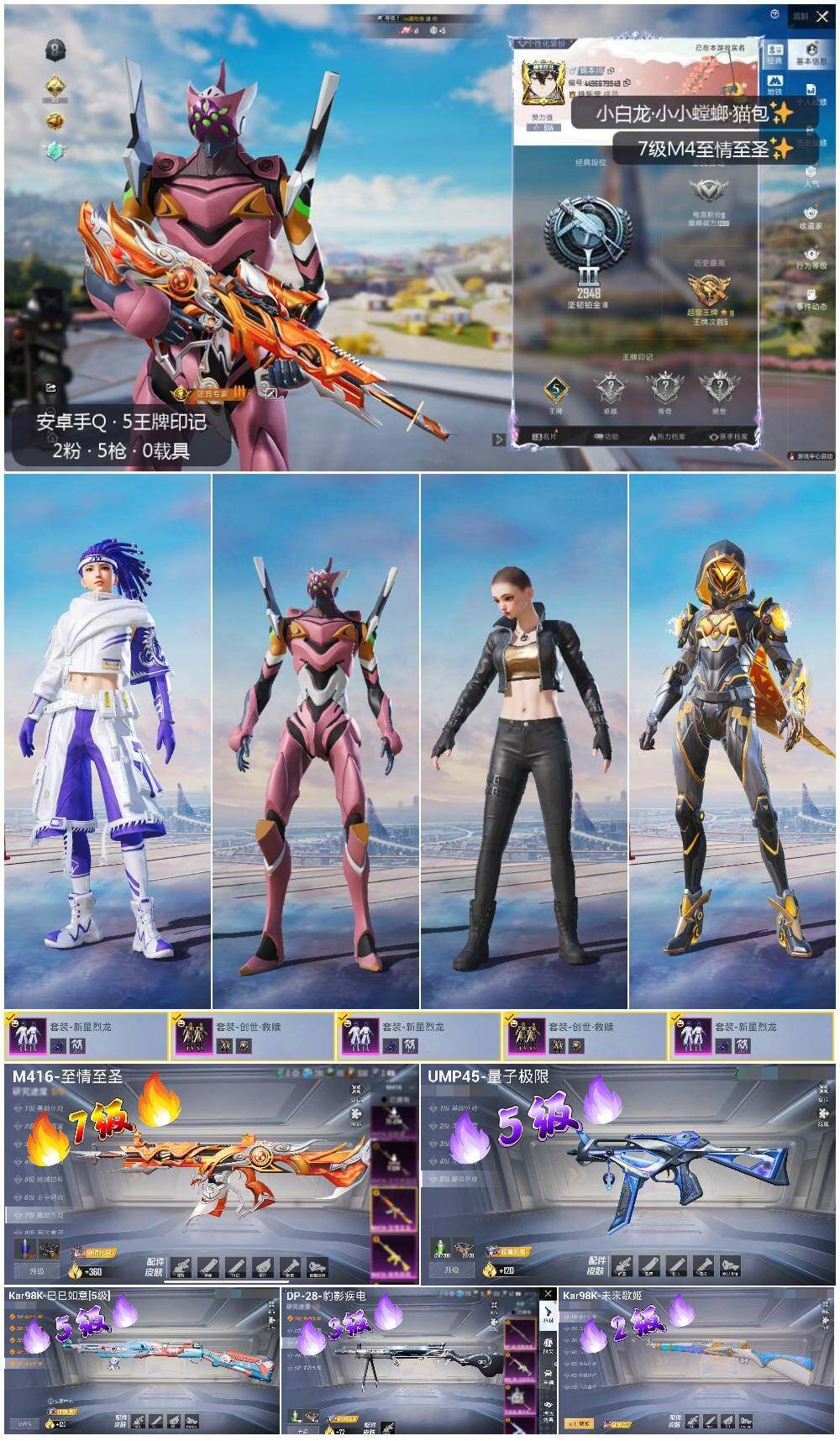 [13067637]安卓 手Q-2粉装-5特效枪-3.8w热力值-5王牌印记-99套装-131枪皮【热门品类】:角色-8号机【粉色套装】:粉装-新星烈龙,套装-创世·救赎【粉色枪皮等级】:M416-至情至圣(七级),UMP45-量子极限(五级),Kar98K-未来歌姬(二级),Kar98K-巳巳如意(五级),DP-28-豹影疾电(三级)
