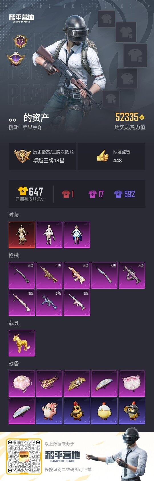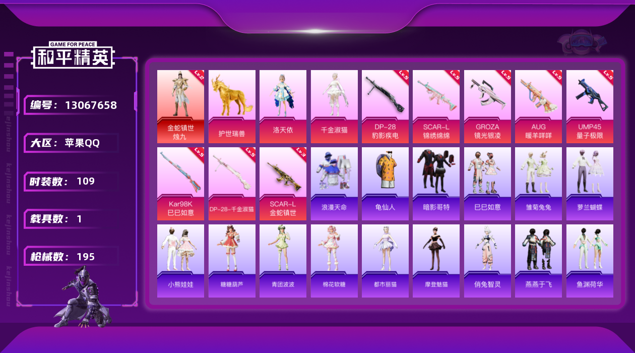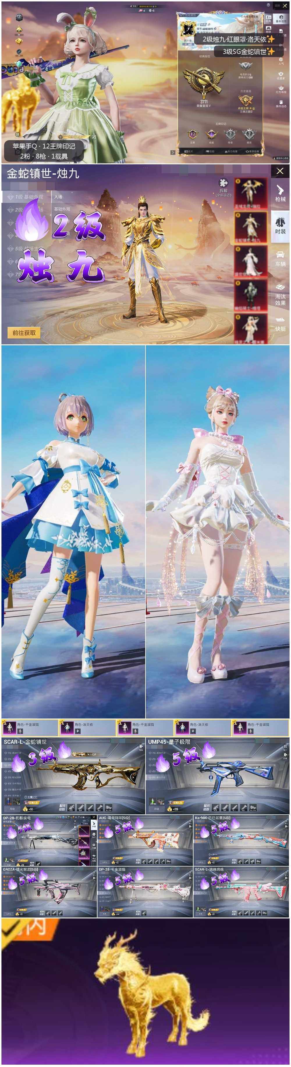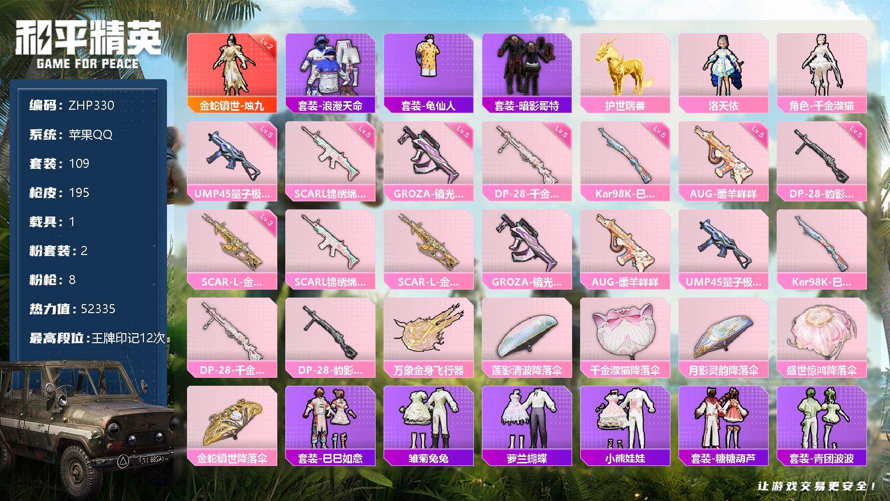 [13067658]素材身法号 苹果 手Q-1神装-2粉装-8特效枪-1载具-1粉色飞行器-5.2w热力值-12王牌印记-109套装-195枪皮【红色神装等级】:金蛇镇世-烛九(二级)【热门品类】:套装-浪漫天命,套装-龟仙人,套装-暗影哥特【粉色载具】:护世瑞兽【粉色套装】:角色-洛天依,角色-千金淑猫【粉色枪皮等级】:SCAR-L-锦绣绵绵(五级),SCAR-L-金蛇镇世(三级),GROZA-镜光银凌(五级),AUG-暖羊咩咩(五级),UMP45-量子极限(五级),Kar98K-巳巳如意(五级),DP-28-千金淑猫(五级),DP-28-豹影疾电(五级)【粉色飞行器】:万象金身飞行器