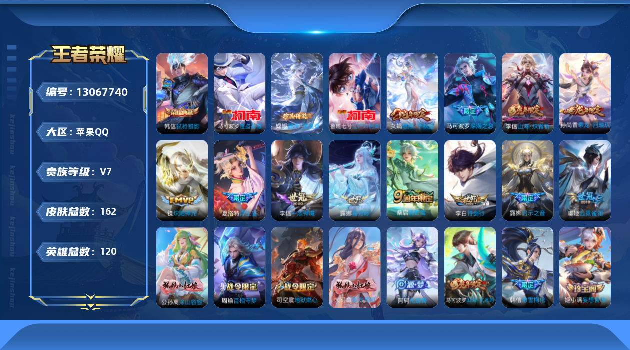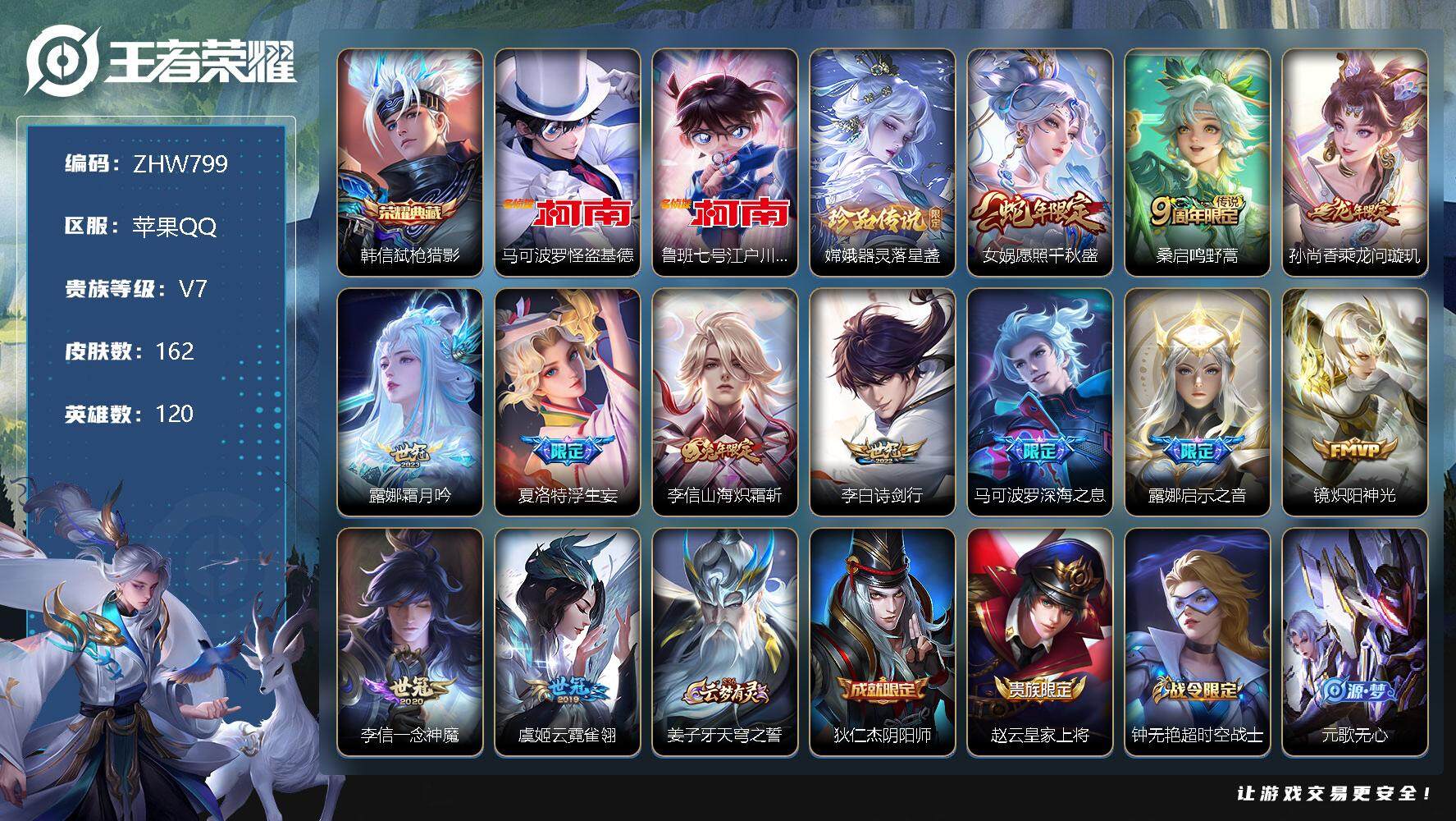 - [11733233]V7 1典藏 1珍品传说 15传说 124英雄 186皮肤 可修改实名 优质装备:九霄神辉(木兰典藏),江户川柯南,云鹰飞将(小将军),炽阳神光,一念神魔,地狱之眼,乞巧织情,超时空战士-狄仁杰,无双飞将,碎云,妄想实况,霜月吟,澜逐花归海,涂山容容 传说皮:落雪白狼,九山相柳 珍宝阁皮:妄想食味,女武神 限定皮:愿照·九州拓(澜年限),陌上桑,鸣野蒿,至尊宝,高山流水,五谷丰年,梁祝,李小龙,逐梦之影 史诗皮:赞萌露比,器灵·浮梦炉,化蝶舞,灵蛊蚀心,星界战将,龙之律动,破空之剑,东方月初,蒙犽顽岩魄,芈月浮光幕影,百相守梦-百里守约,百相守梦-黄忠,紫霞仙子,黄金分割率,千年之狐,永昼,魅语,无限星赏官,冰冠公主,偶像歌手,暗夜猫娘,末日机甲-吕布,乱世虎臣,节奏热浪,修罗,女仆咖啡,摇滚巨星,水果甜心,星夜王子,暗隐猎兽者,鬼剑武藏,天秀·启明,地狱岩魂,拒霜思,缤纷独角兽,乘风破浪,逐浪之夏,月团寄思,水晶猎龙者,热力回旋,金属风暴,原初追逐者,圣诞狂欢,圣诞恋歌,鹰眼统帅,魅力维加斯,黎明之约,赏金猎手,奇遇舞章,无心