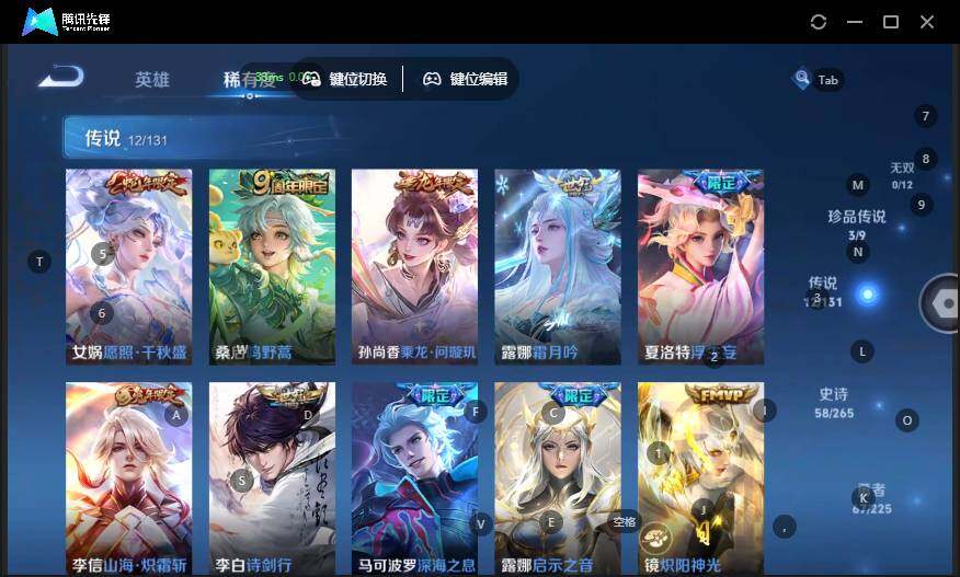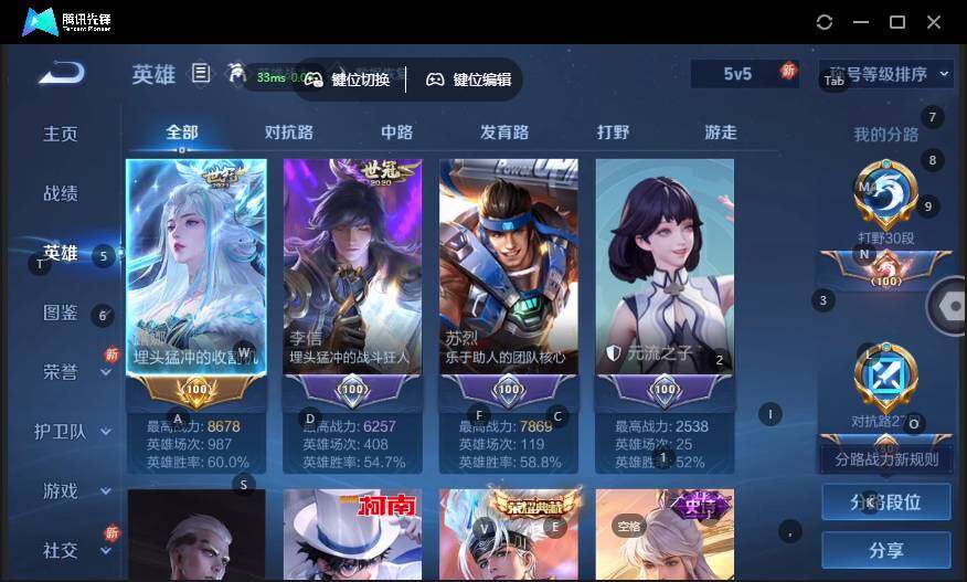 - [11385288]V2 3传说 123英雄 106皮肤 可修改实名 优质装备:久胜战神 传说皮:幻光神枪 珍宝阁皮:玩趣恶龙 限定皮:鸣野蒿,五谷丰年,李小龙 史诗皮:灵蛊蚀心,百相守梦-黄忠,特工魅影,江河有灵,偶像歌手,乱世虎臣,女仆咖啡,摇滚巨星,水果甜心,绅士熊喵,暗隐猎兽者,幽灵船长,鬼剑武藏,心灵战警,地狱岩魂,缤纷独角兽,乘风破浪,金属风暴,鹰眼统帅,魅力维加斯