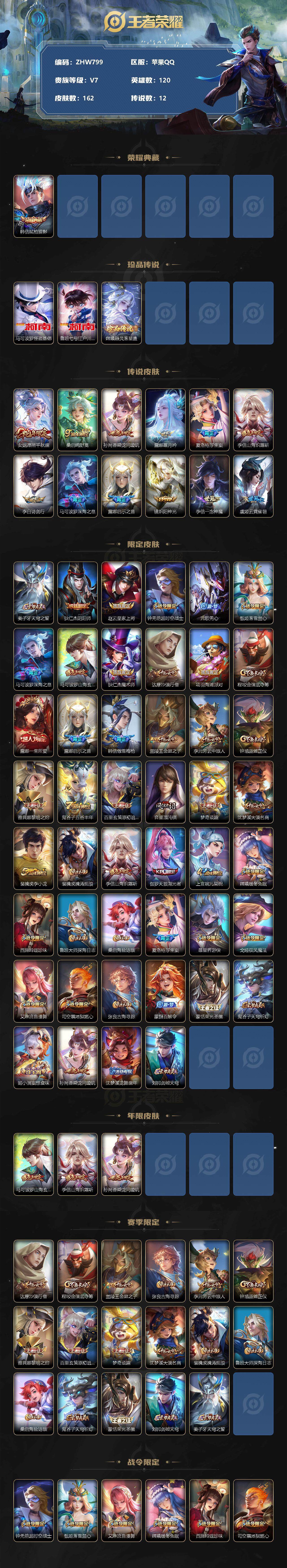 [13067740]【特价急出/详情看图/八千六省100露娜】:苹果Q-V7-最强王者段位-120英雄-162皮肤-1典藏-3珍品传说-12传说-58史诗