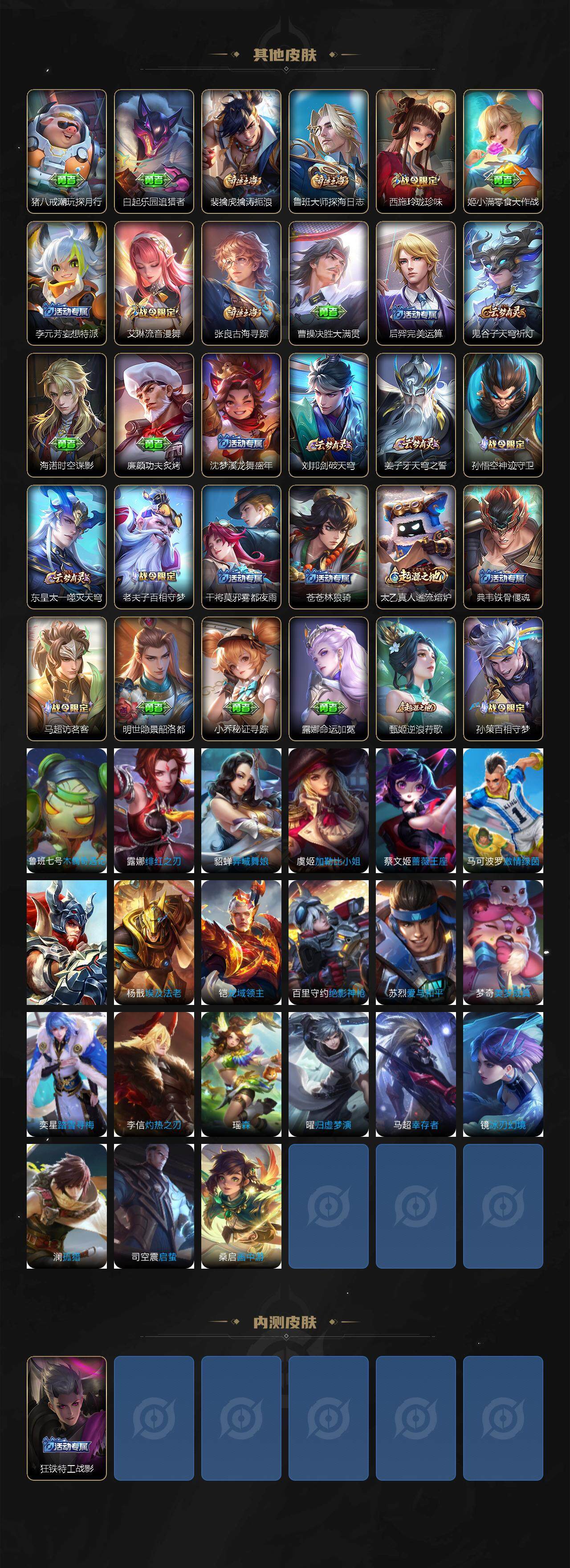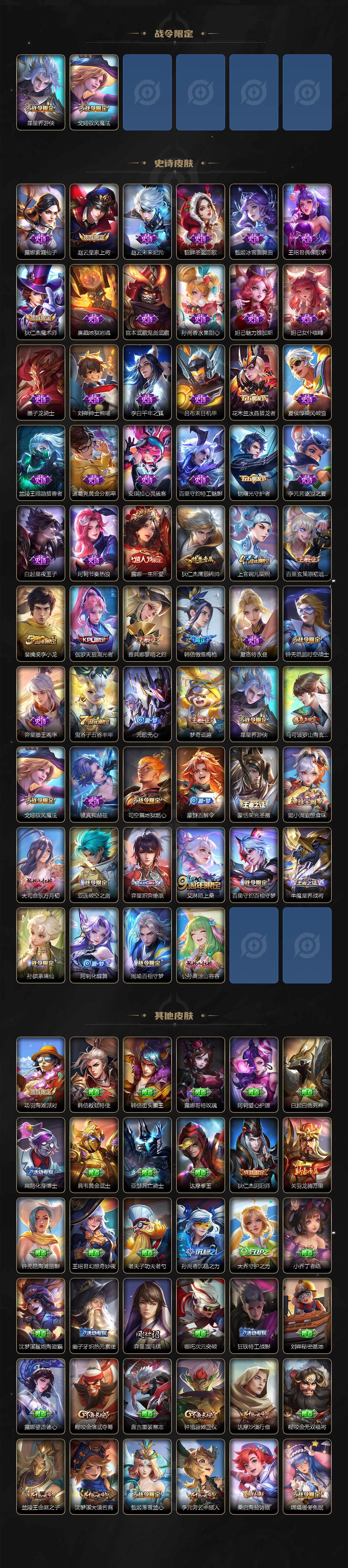 【限定皮肤】:姜子牙天穹之誓,狄仁杰阴阳师,赵云皇家上将,钟无艳超时空战士,元歌无心,甄姬落雪兰心,马可波罗深海之息,马可波罗山海玄木吟,狄仁杰魔术师,达摩沙漠行僧,项羽海滩派对,程咬金演武夺筹,露娜一生所爱,露娜启示之音,韩信傲雪梅枪,兰陵王金庭之子,李元芳云中旅人,钟馗驱傩正仪,雅典娜黎明之约,鬼谷子五谷丰年,百里玄策原初追逐者,弈星混沌棋,梦奇顽趣,沈梦溪大漠名商,裴擒虎李小龙,裴擒虎擒涛扼浪,李信山海炽霜斩,伽罗天狼溯光者,上官婉儿梁祝,嫦娥暖冬兔眠,西施玲珑珍味,鲁班大师探海日志,桑启海盐诗旅,夏洛特浮生妄,暃星界游侠,戈娅驭风魔法,艾琳流音漫舞,司空震地狱燃心,张良古海寻踪,蒙犽百解令,蒙恬荣光圣徽,鬼谷子天穹祈灯,姬小满妄想食味,孙尚香乘龙问璇玑,沈梦溪龙舞盛年,刘邦剑破天穹