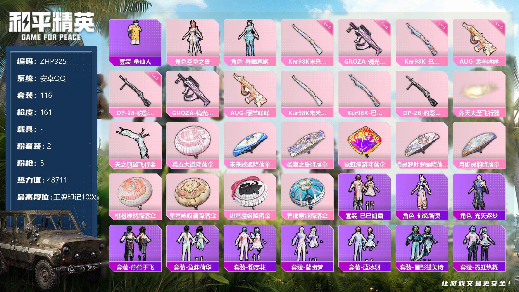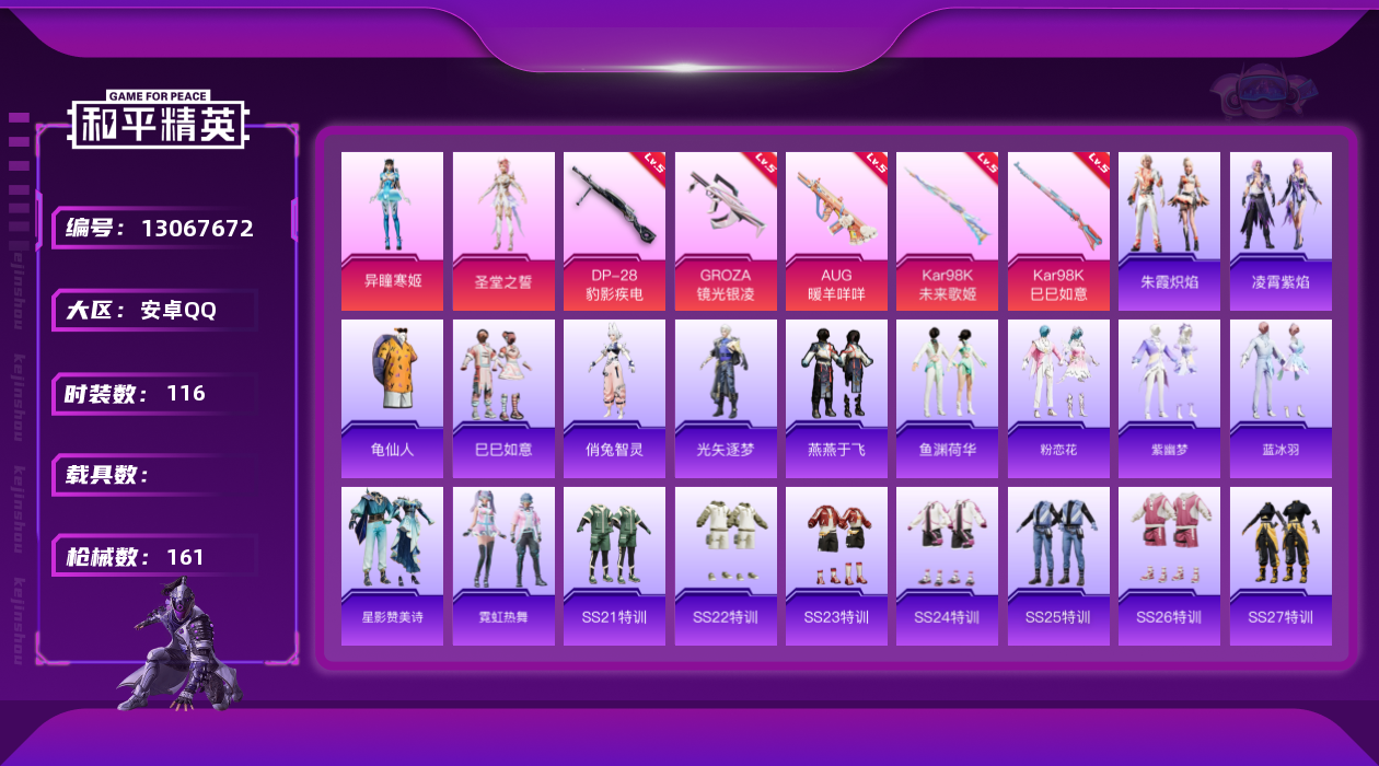 [13067672]地铁满天赋 安卓 手Q-2粉装-5特效枪-2粉色飞行器-4.8w热力值-10王牌印记-116套装-161枪皮【热门品类】:套装-龟仙人【粉色套装】:角色-圣堂之誓,角色-异瞳寒姬【粉色枪皮等级】:GROZA-镜光银凌(五级),AUG-暖羊咩咩(五级),Kar98K-未来歌姬(五级),Kar98K-巳巳如意(五级),DP-28-豹影疾电(五级)【粉色飞行器】:齐天大圣飞行器,天之羽翼飞行器