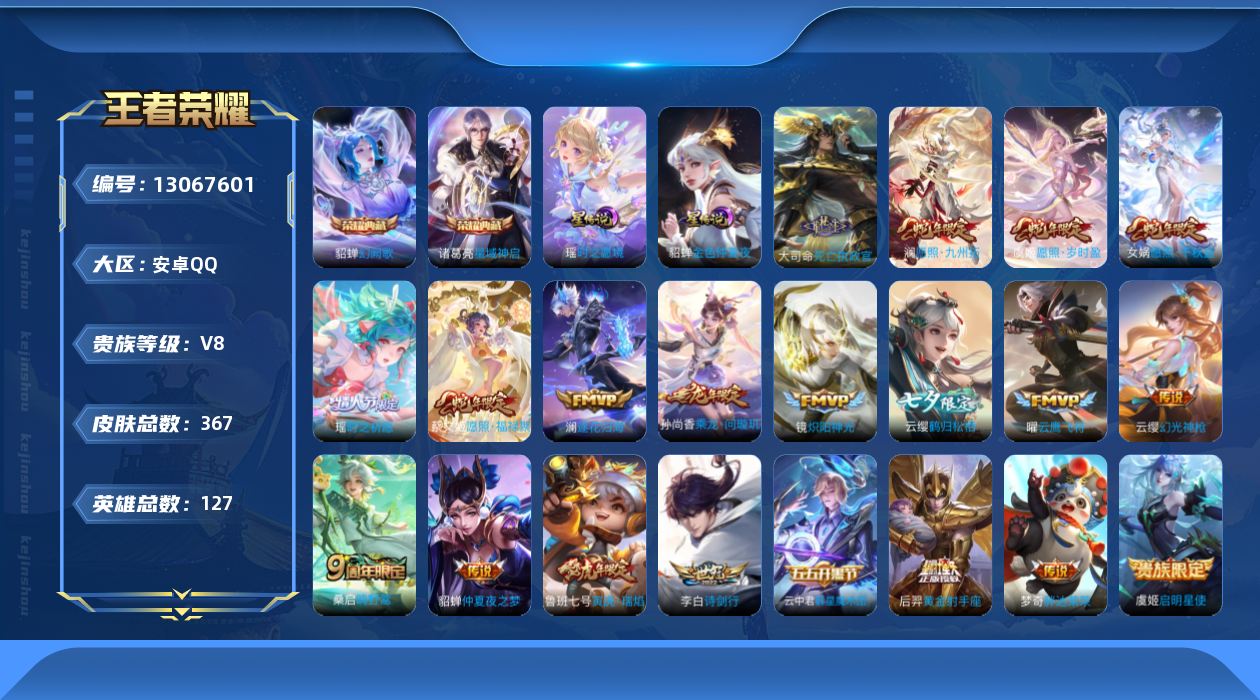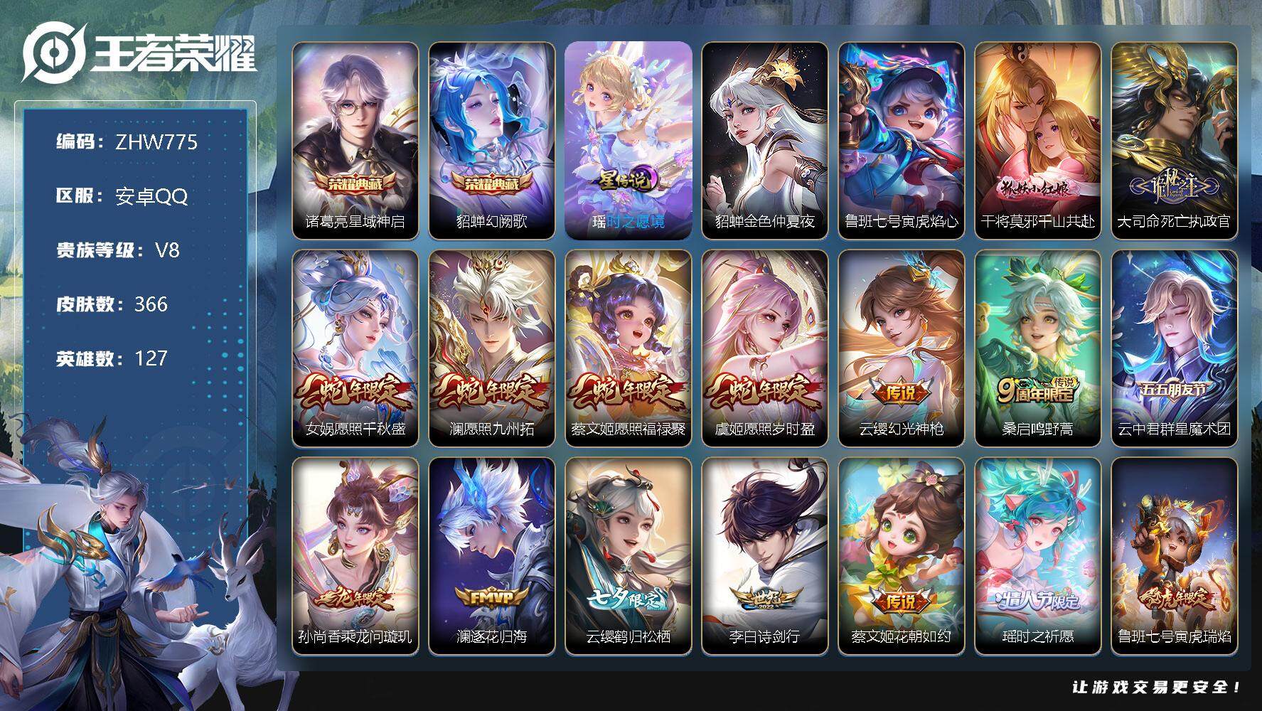 [13067601]安卓Q-V8-最强王者段位-127英雄-366皮肤-2典藏-23传说-117史诗-3星元