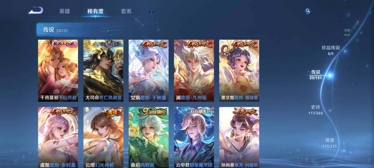 【传说皮肤】:干将莫邪千山共赴,大司命死亡执政官,女娲愿照千秋盛,澜愿照九州拓,蔡文姬愿照福禄聚,虞姬愿照岁时盈,云缨幻光神枪,桑启鸣野蒿,云中君群星魔术团,孙尚香乘龙问璇玑,澜逐花归海,云缨鹤归松栖,李白诗剑行,蔡文姬花朝如约,瑶时之祈愿,鲁班七号寅虎瑞焰,李元芳飞鸢探春,镜炽阳神光,虞姬启明星使,曜云鹰飞将,梦奇胖达荣荣,后羿黄金射手座,貂蝉仲夏夜之梦