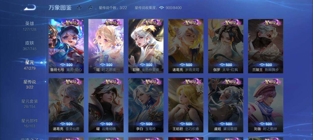 【限定皮肤】:蒙犽顽岩魄,蔡文姬夏日便利店,大乔绒语心约,虞姬夏日便利店,姜子牙天穹之誓,杨戬破阵退雄兵,狄仁杰阴阳师,廉颇寅虎御盾,赵云皇家上将,鲁班七号狮舞东方,鲁班七号寅虎瑞焰,庄周高山流水,高渐离玩趣恶龙,钟无艳超时空战士,孙膑寅虎展翼,扁鹊奇幻香踪,芈月幻夜卜梦,吕布猎兽之王,元歌云间偶戏,元歌无心,甄姬落雪兰心,马可波罗暗影游猎,狄仁杰魔术师,狄仁杰万华元夜,达摩沙漠行僧,项羽海滩派对,老夫子醍醐杖,程咬金演武夺筹,王昭君午后时光,兰陵王金庭之子,孙悟空至尊宝,孙悟空孙行者,后羿圣弓游侠,李元芳银河之约,李元芳云中旅人,虞姬启明星使,钟馗驱傩正仪,杨玉环寅虎心曲,干将莫邪真爱魔法,蔡文姬繁星吟游,鬼谷子原初探秘者,鬼谷子五谷丰年,黄忠火炮绅士,苏烈千军破阵,百里玄策原初追逐者,弈星混沌棋,沈梦溪大漠名商,明世隐疑决卦,裴擒虎李小龙,裴擒虎擒涛扼浪,狂铁电玩高手,瑶时之祈愿,云中君纤云弄巧,云中君时之祈愿,猪八戒西部大镖客,上官婉儿梁祝,嫦娥拒霜思,西施玲珑珍味,蒙犽狂想玩偶喵,鲁班大师匿光启智者,鲁班大师探海日志,镜匿光追影者,桑启海盐诗旅,戈娅驭风魔法,艾琳流音漫舞,赵怀真鹤归松栖,云缨鹤归松栖,司空震地狱燃心,阿古朵江河有灵,张良古海寻踪,蒙犽百解令,高渐离燃音魔法,妲己灵卜魔法,鬼谷子天穹祈灯,伽罗琥珀纪元,姬小满妄想食味,大乔乘龙忆丹青,安琪拉乘龙聚宝船,孙尚香乘龙问璇玑,百里玄策超元猎域,沈梦溪龙舞盛年,鲁班七号蔬乡物语,李元芳蔬乡物语,刘邦剑破天穹,上官婉儿群星魔术团,程咬金群星魔术团,云中君群星魔术团,镜青焰无