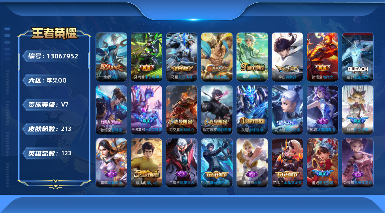 [13067952]苹果Q-V7-永恒钻石I段位-123英雄-213皮肤-0典藏-0珍品无双-0无双-0珍品传说-7传说-52史诗