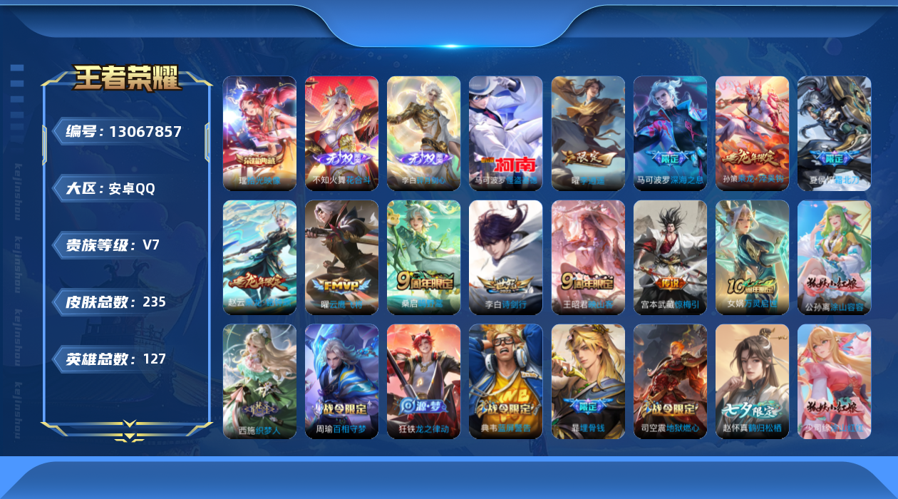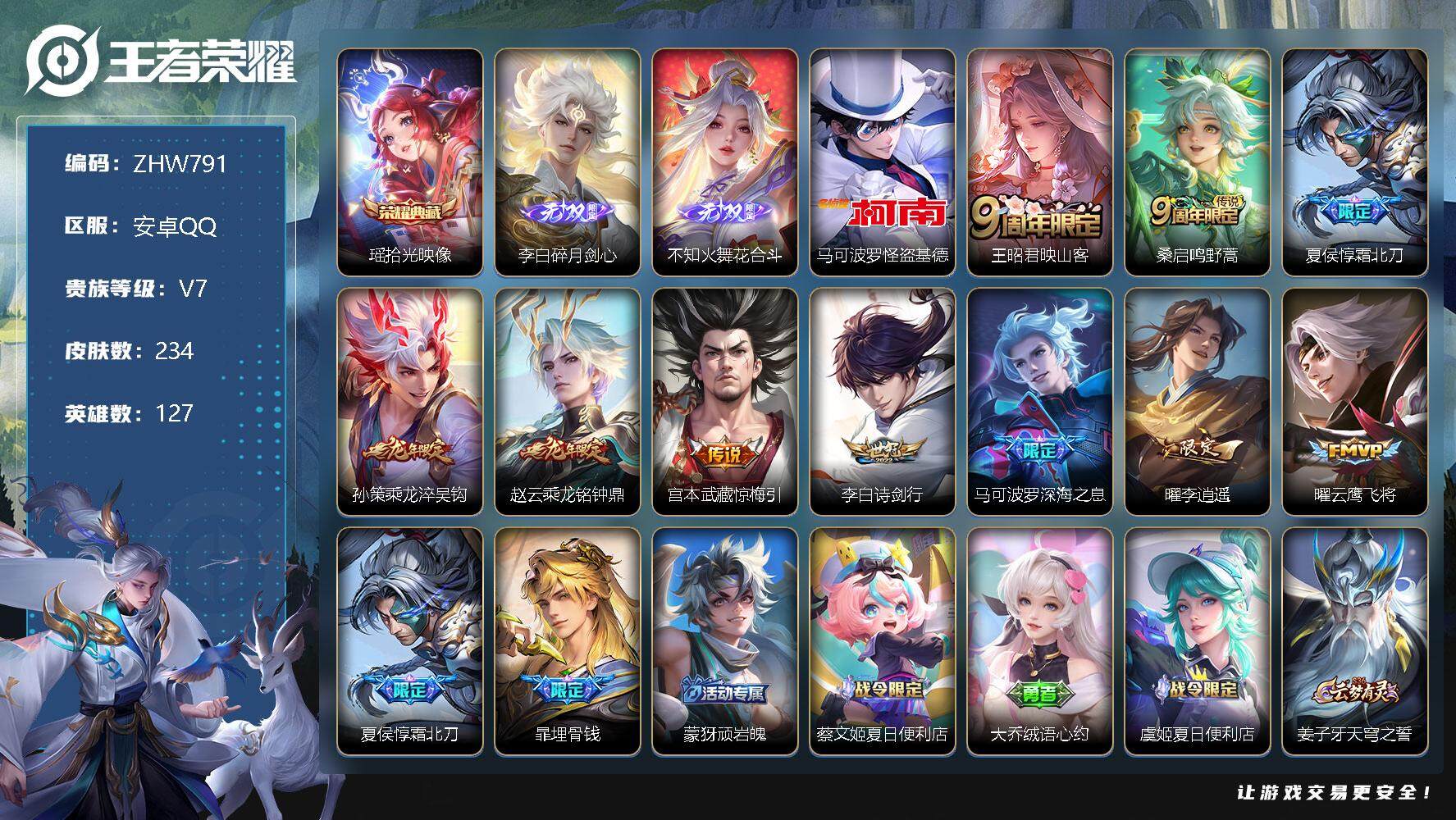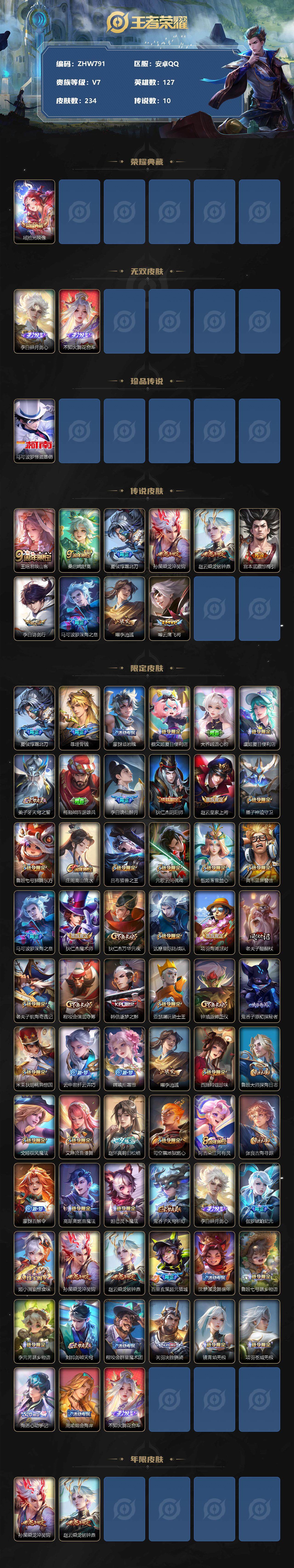 [13067857]安卓Q-V7-至尊星耀I段位-127英雄-234皮肤-1典藏-2无双-1珍品传说-10传说-75史诗