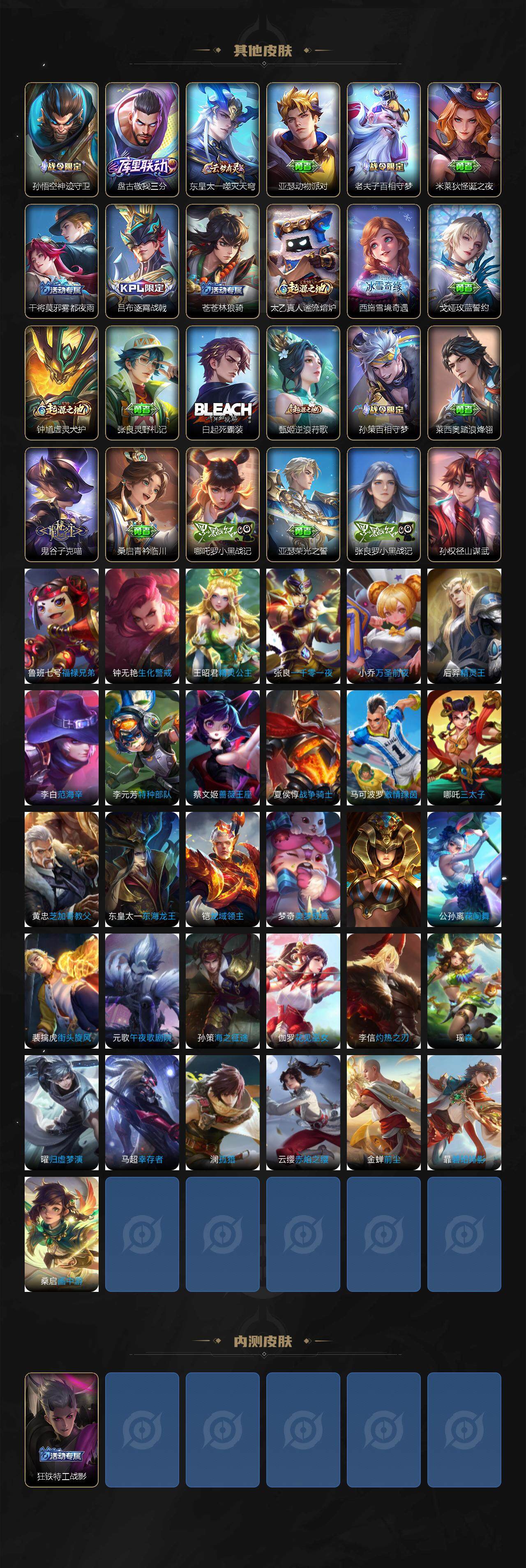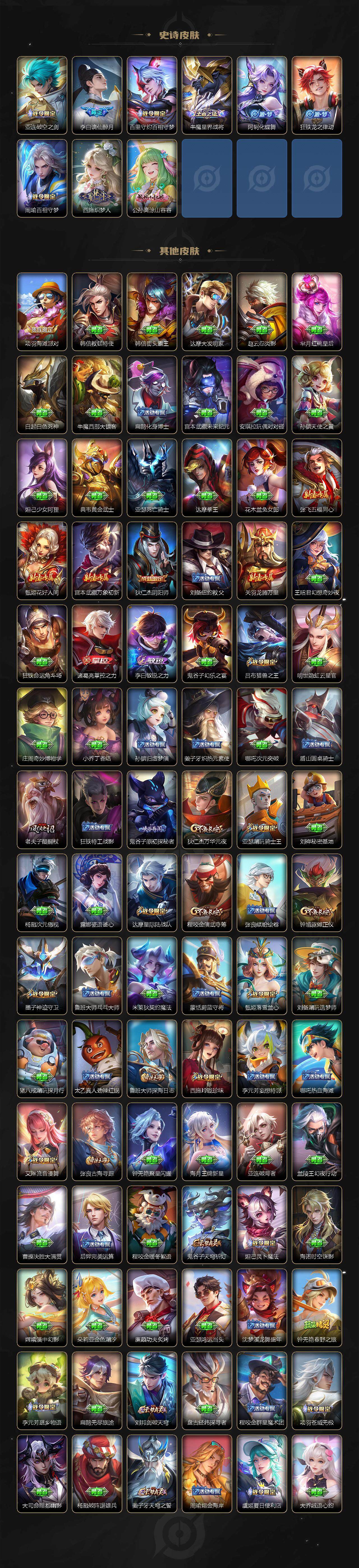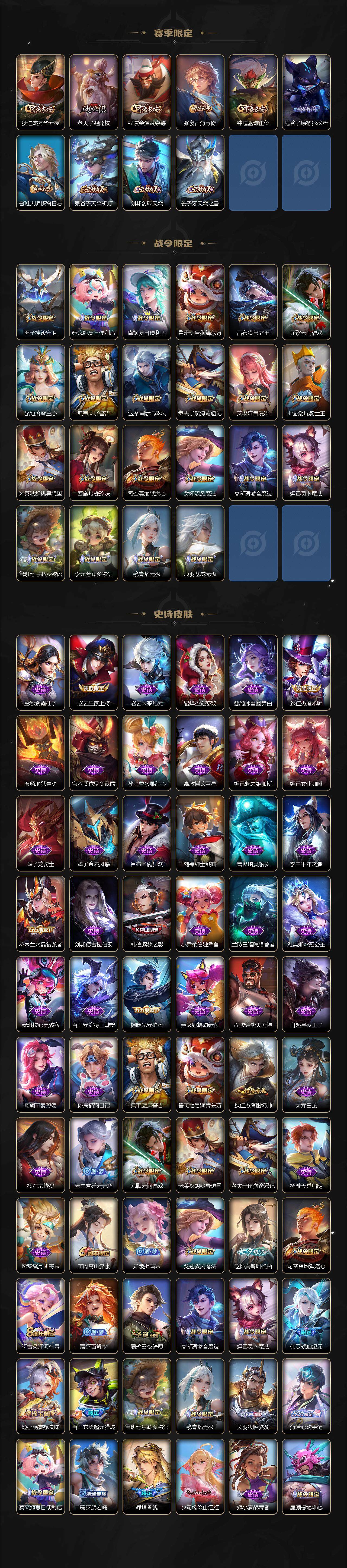 【限定皮肤】:夏侯惇霜北刀,暃埋骨钱,蒙犽顽岩魄,蔡文姬夏日便利店,大乔绒语心约,虞姬夏日便利店,姜子牙天穹之誓,杨戬破阵退雄兵,李白谪仙醉月,狄仁杰阴阳师,赵云皇家上将,墨子神迹守卫,鲁班七号狮舞东方,庄周高山流水,吕布猎兽之王,元歌云间偶戏,甄姬落雪兰心,典韦蓝屏警告,马可波罗深海之息,狄仁杰魔术师,狄仁杰万华元夜,达摩星际陆战队,项羽海滩派对,老夫子醍醐杖,老夫子航海奇遇记,程咬金演武夺筹,韩信逐梦之影,亚瑟潮玩骑士王,钟馗驱傩正仪,鬼谷子原初探秘者,米莱狄胡桃异想国,云中君纤云弄巧,嫦娥拒霜思,曜李逍遥 ,西施玲珑珍味,鲁班大师探海日志,戈娅驭风魔法,艾琳流音漫舞,赵怀真鹤归松栖,司空震地狱燃心,阿古朵江河有灵,张良古海寻踪,蒙犽百解令,高渐离燃音魔法,妲己灵卜魔法,鬼谷子天穹祈灯,李白碎月剑心,伽罗琥珀纪元,姬小满妄想食味,孙策乘龙淬吴钩,赵云乘龙铭钟鼎,百里玄策超元猎域,沈梦溪龙舞盛年,鲁班七号蔬乡物语,李元芳蔬乡物语,刘邦剑破天穹,程咬金群星魔术团,关羽决胜骁骑,镜青焰无极,项羽苍威无极,海诺心动手记,周瑜熔金海岸,不知火舞花合斗