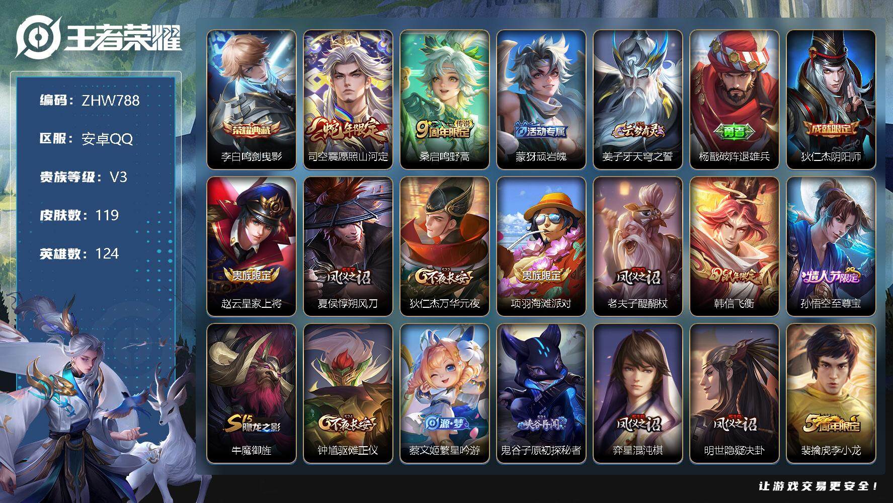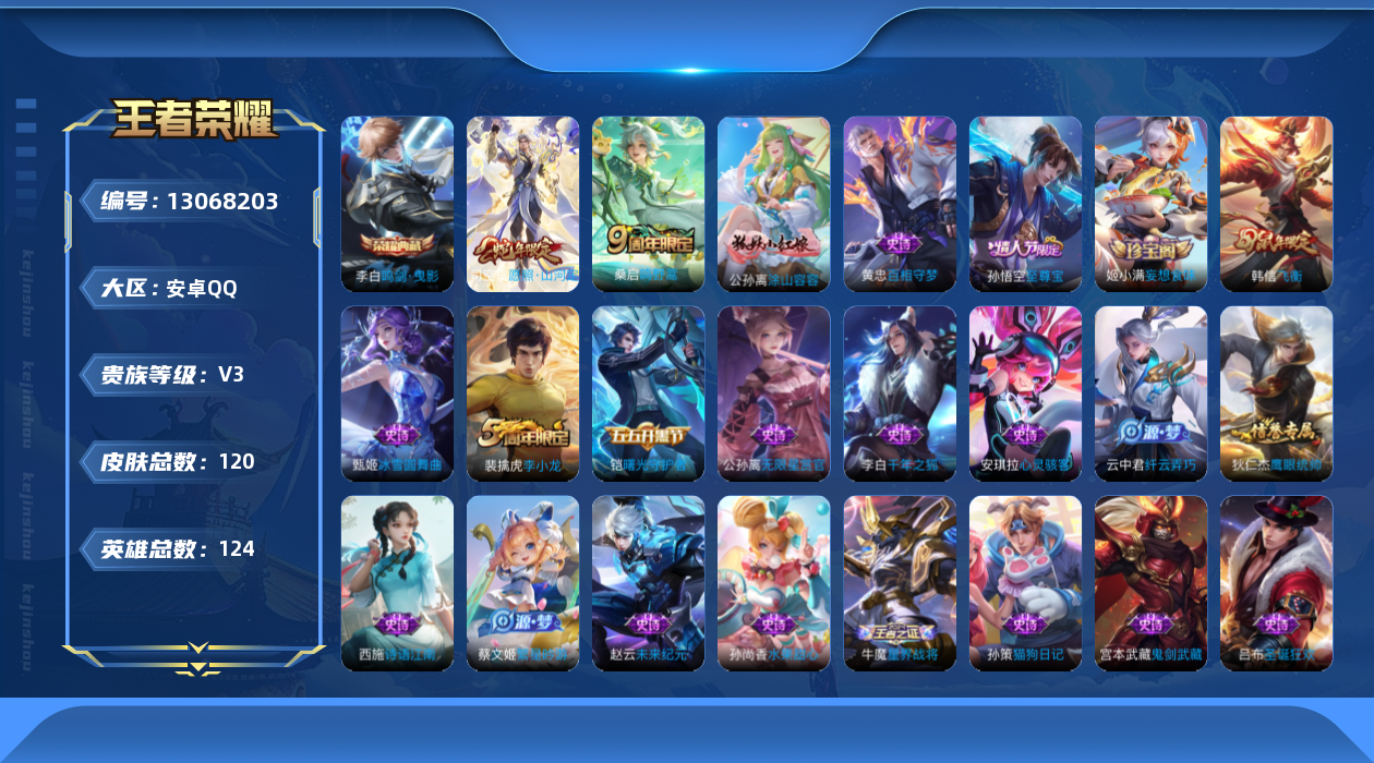 [13068203]安卓Q-V3-永恒钻石I段位-124英雄-119皮肤-1典藏-2传说-25史诗 【荣耀典藏】:李白鸣剑曳影 【传说皮肤】:司空震愿照山河定,桑启鸣野蒿 【限定皮肤】:蒙犽顽岩魄,姜子牙天穹之誓,杨戬破阵退雄兵,狄仁杰阴阳师,赵云皇家上将,夏侯惇朔风刀,狄仁杰万华元夜,项羽海滩派对,老夫子醍醐杖,韩信飞衡,孙悟空至尊宝,牛魔御旌,钟馗驱傩正仪,蔡文姬繁星吟游,鬼谷子原初探秘者,弈星混沌棋,明世隐疑决卦,裴擒虎李小龙,云中君纤云弄巧,鬼谷子天穹祈灯,姬小满妄想食味,刘邦剑破天穹,程咬金群星魔术团,周瑜熔金海岸 【年限皮肤】:韩信飞衡 【赛季限定】:夏侯惇朔风刀,狄仁杰万华元夜,老夫子醍醐杖,牛魔御旌,钟馗驱傩正仪,鬼谷子原初探秘者,弈星混沌棋,明世隐疑决卦,鬼谷子天穹祈灯,刘邦剑破天穹,姜子牙天穹之誓 【史诗皮肤】:赵云皇家上将,赵云未来纪元,貂蝉圣诞恋歌,甄姬冰雪圆舞曲,宫本武藏鬼剑武藏,孙尚香水果甜心,吕布圣诞狂欢,李白千年之狐,孙悟空至尊宝,小乔缤纷独角兽,安琪拉心灵骇客,铠曙光守护者,孙策猫狗日记,狄仁杰鹰眼统帅,公孙离无限星赏官,蔡文姬繁星吟游,韩信飞衡,裴擒虎李小龙,云中君纤云弄巧,西施诗语江南,姬小满妄想食味,蒙犽顽岩魄,牛魔星界战将,黄忠百相守梦,公孙离涂山容容 【其他皮肤】:项羽海滩派对,韩信教廷特使,韩信街头霸王,露娜哥特玫瑰,赵云白执事,赵云忍炎影,芈月红桃皇后,白起白色死神,牛魔西部大镖客,扁鹊救世之瞳,安琪拉玩偶对对碰,孙膑天使之翼,姜子牙时尚教父,妲己少女阿狸,典韦黄金武士,达摩拳王,甄姬花好人间,狄仁杰阴阳师,刘备汉昭烈帝,关羽龙腾万里,宫本武藏霸王丸,孙尚香沉稳之力,诸葛亮掌控之力,李白敏锐之力,牛魔御旌,小乔丁香结,姜子牙炽热元素使,夏侯惇朔风刀,弈星混沌棋,鲁班七号黑桃队长,明世隐疑决卦,盾山圆桌骑士,老夫子醍醐杖,廉颇无尽征程,鬼谷子原初探秘者,狄仁杰万华元夜,钟馗驱傩正仪,鲁班大师乓乓大师,蒙恬蔚蓝守将,海月幻泉雾影,猪八戒潮玩探月行,亚连破局者,鬼谷子天穹祈灯,刘邦剑破天穹,程咬金群星魔术团,杨戬破阵退雄兵,姜子牙天穹之誓,周瑜熔金海岸,盘古敬我三分,东皇太一噬灭天穹,干将莫邪雾都夜雨,苍苍林狼骑,太乙真人谧流熔炉,典韦铁骨偃魂,西施雪境奇遇,明世隐景韶洛都,戈娅玫蓝誓约,钟馗虚灵犬护,苏烈春野闲踪,张良灵野札记,阿古朵布丁狗