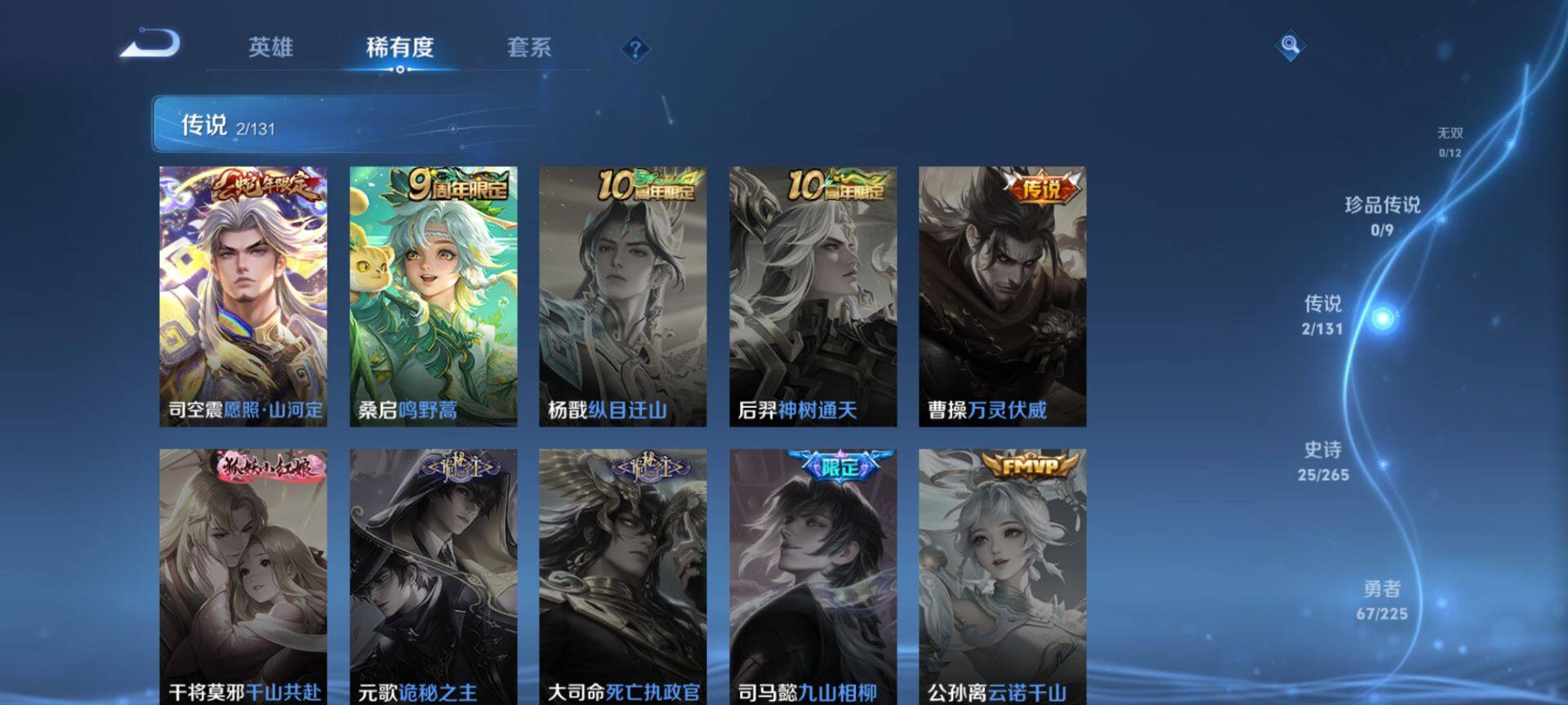 【限定皮肤】:蒙犽顽岩魄,姜子牙天穹之誓,杨戬破阵退雄兵,狄仁杰阴阳师,赵云皇家上将,夏侯惇朔风刀,狄仁杰万华元夜,项羽海滩派对,老夫子醍醐杖,韩信飞衡,孙悟空至尊宝,牛魔御旌,钟馗驱傩正仪,蔡文姬繁星吟游,鬼谷子原初探秘者,弈星混沌棋,明世隐疑决卦,裴擒虎李小龙,云中君纤云弄巧,鬼谷子天穹祈灯,姬小满妄想食味,刘邦剑破天穹,程咬金群星魔术团,周瑜熔金海岸