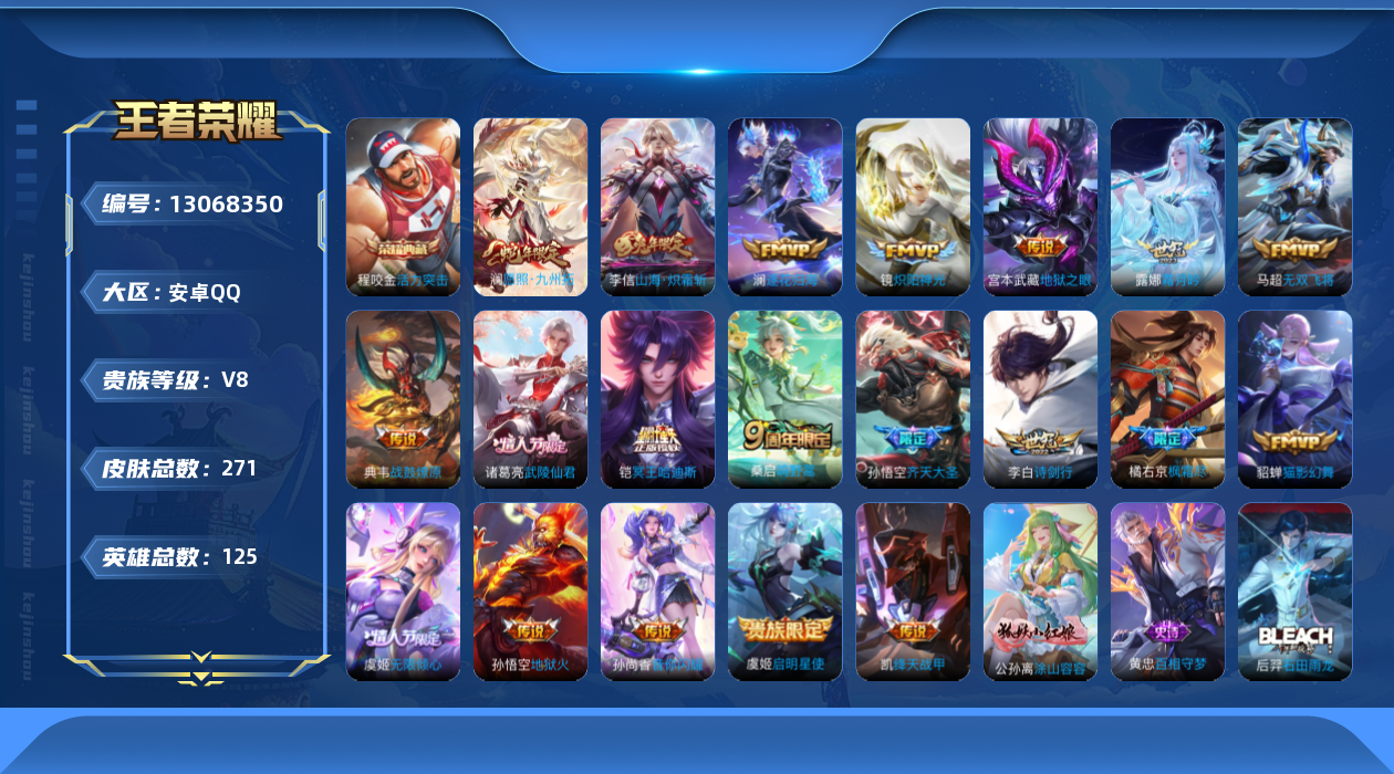 [13068350]安卓Q-V8-尊贵铂金I段位-125英雄-271皮肤-1典藏-21传说-57史诗 【英雄全皮】:橘右京全皮,影全皮 【荣耀典藏】:程咬金活力突击 【传说皮肤】:后羿神树通天,澜愿照九州拓,桑启鸣野蒿,铠冥王哈迪斯,典韦战鼓燎原,澜逐花归海,露娜霜月吟,虞姬无限倾心,孙悟空齐天大圣,李信山海炽霜斩,李白诗剑行,橘右京枫霜尽,孙尚香音你闪耀,马超无双飞将,铠绛天战甲,镜炽阳神光,虞姬启明星使,貂蝉猫影幻舞,诸葛亮武陵仙君,宫本武藏地狱之眼,孙悟空地狱火 【限定皮肤】:铠冥王哈迪斯,蔡文姬夏日便利店,大乔绒语心约,虞姬夏日便利店,姜子牙天穹之誓,狄仁杰阴阳师,赵云皇家上将,孙尚香蔷薇恋人,鲁班七号狮舞东方,高渐离玩趣恶龙,吕布猎兽之王,周瑜赤莲之焰,夏侯惇朔风刀,典韦蓝屏警告,典韦岱宗,马可波罗暗影游猎,狄仁杰魔术师,达摩沙漠行僧,项羽海滩派对,老夫子醍醐杖,程咬金演武夺筹,韩信飞衡,兰陵王驯魔猎人,兰陵王金庭之子,花木兰青春决赛季,橘右京枫霜尽,孙悟空大圣娶亲,孙悟空孙行者,孙悟空齐天大圣,牛魔御旌,李元芳匿光侦查者,李元芳云中旅人,虞姬霸王别姬,虞姬启明星使,虞姬无限倾心,钟馗神迹守卫,钟馗驱傩正仪,女娲朔望之晖,蔡文姬繁星吟游,鬼谷子原初探秘者,鬼谷子五谷丰年,诸葛亮武陵仙君,苏烈千军破阵,沈梦溪大漠名商,裴擒虎天狼狩猎者,裴擒虎李小龙,米莱狄御霄,云中君纤云弄巧,李信山海炽霜斩,盾山御銮,猪八戒西部大镖客,上官婉儿梁祝,西施玲珑珍味,鲁班大师探海日志,镜匿光追影者,桑启海盐诗旅,艾琳流音漫舞,司空震地狱燃心,阿古朵江河有灵,张良古海寻踪,鬼谷子天穹祈灯,李元芳蔬乡物语,周瑜熔金海岸 【年限皮肤】:韩信飞衡,典韦岱宗,马超神威,李信山海炽霜斩 【赛季限定】:夏侯惇朔风刀,达摩沙漠行僧,老夫子醍醐杖,程咬金演武夺筹,兰陵王金庭之子,张良古海寻踪,牛魔御旌,李元芳云中旅人,钟馗驱傩正仪,鬼谷子原初探秘者,苏烈千军破阵,沈梦溪大漠名商,米莱狄御霄,盾山御銮,鲁班大师探海日志,桑启海盐诗旅,鬼谷子天穹祈灯,姜子牙天穹之誓 【战令限定】:蔡文姬夏日便利店,虞姬夏日便利店,鲁班七号狮舞东方,吕布猎兽之王,周瑜赤莲之焰,典韦蓝屏警告,马可波罗暗影游猎,兰陵王驯魔猎人,艾琳流音漫舞,钟馗神迹守卫,女娲朔望之晖,猪八戒西部大镖客,西施玲珑珍味,司空震地狱燃心,李元芳蔬乡物语 【史诗