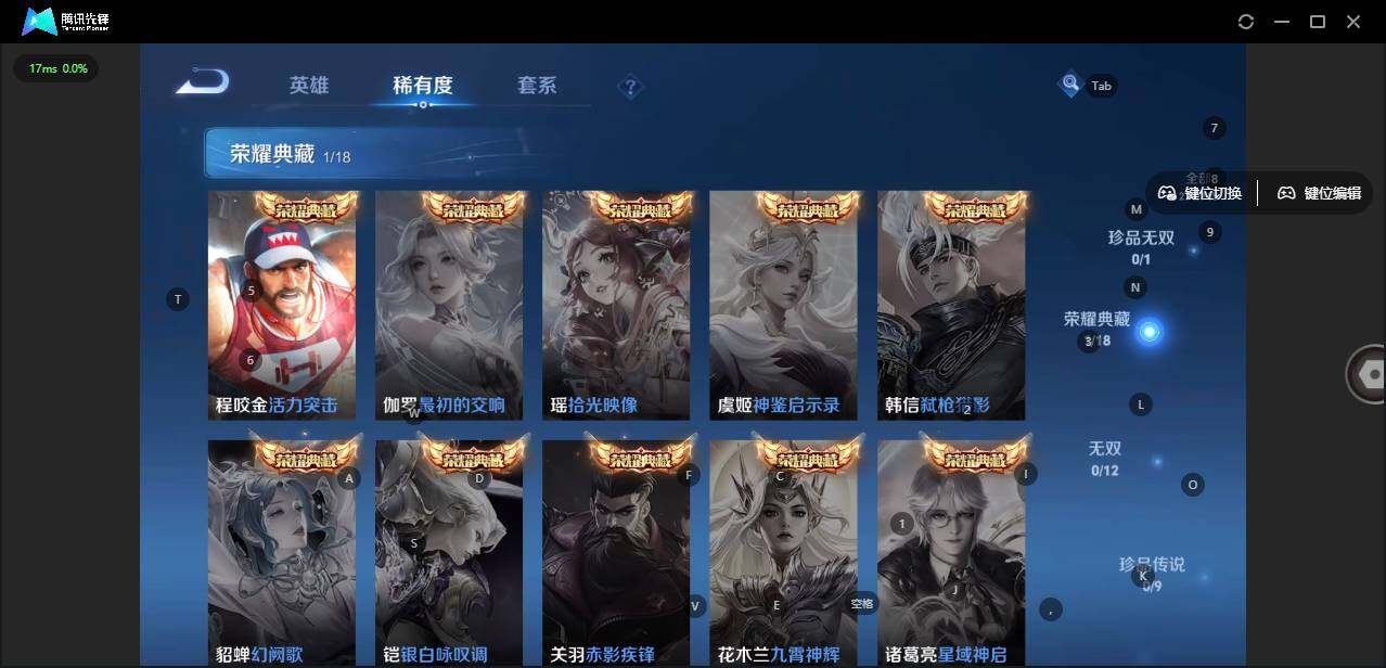 裴擒虎李小龙,上官婉儿梁祝,马超神威,典韦岱宗,韩信飞衡,裴擒虎天狼狩猎者,虞姬霸王别姬,孙悟空大圣娶亲,花木兰青春决赛季,孙悟空孙行者,镜匿光追影者,橘右京枫霜尽,李白诗剑行,桑启鸣野蒿,澜愿照·九州拓