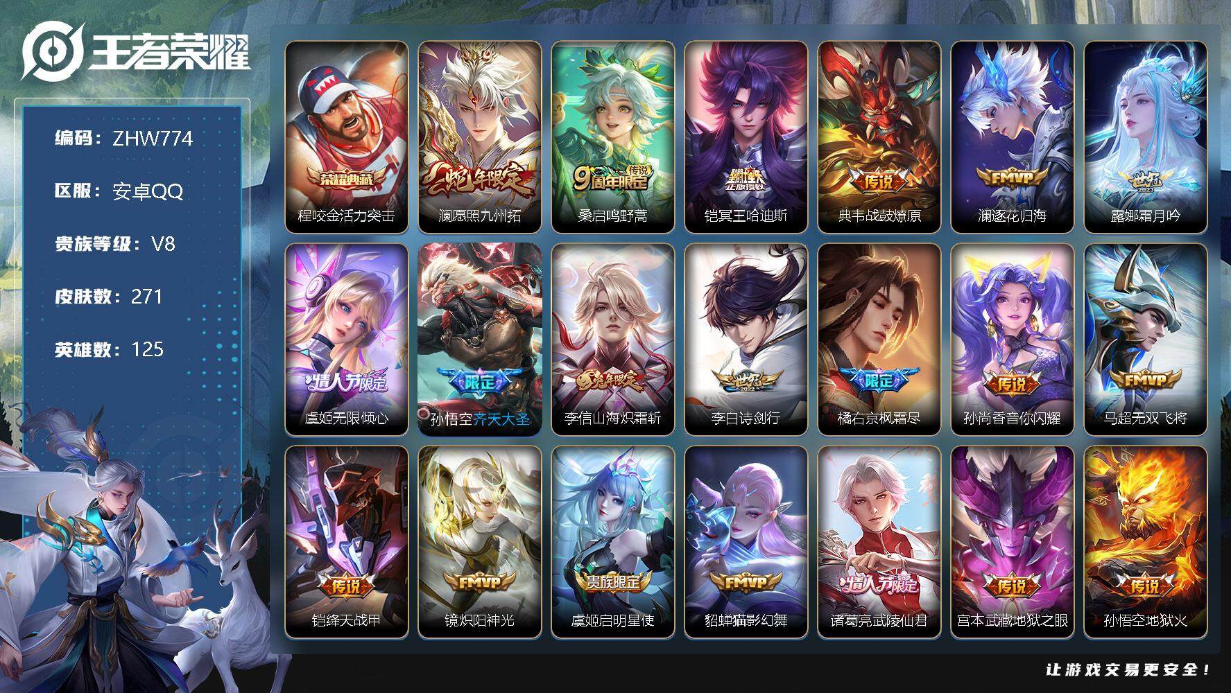 [13068350]安卓Q-V8-尊贵铂金I段位-125英雄-271皮肤-1典藏-21传说-57史诗
