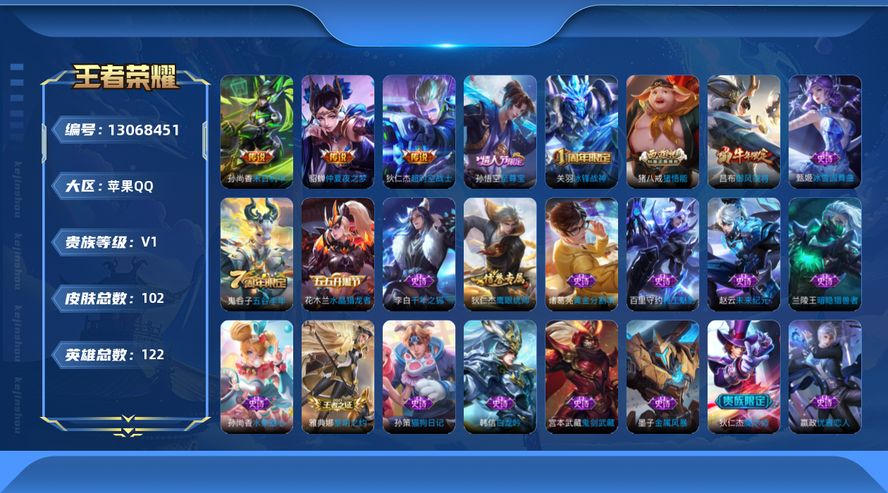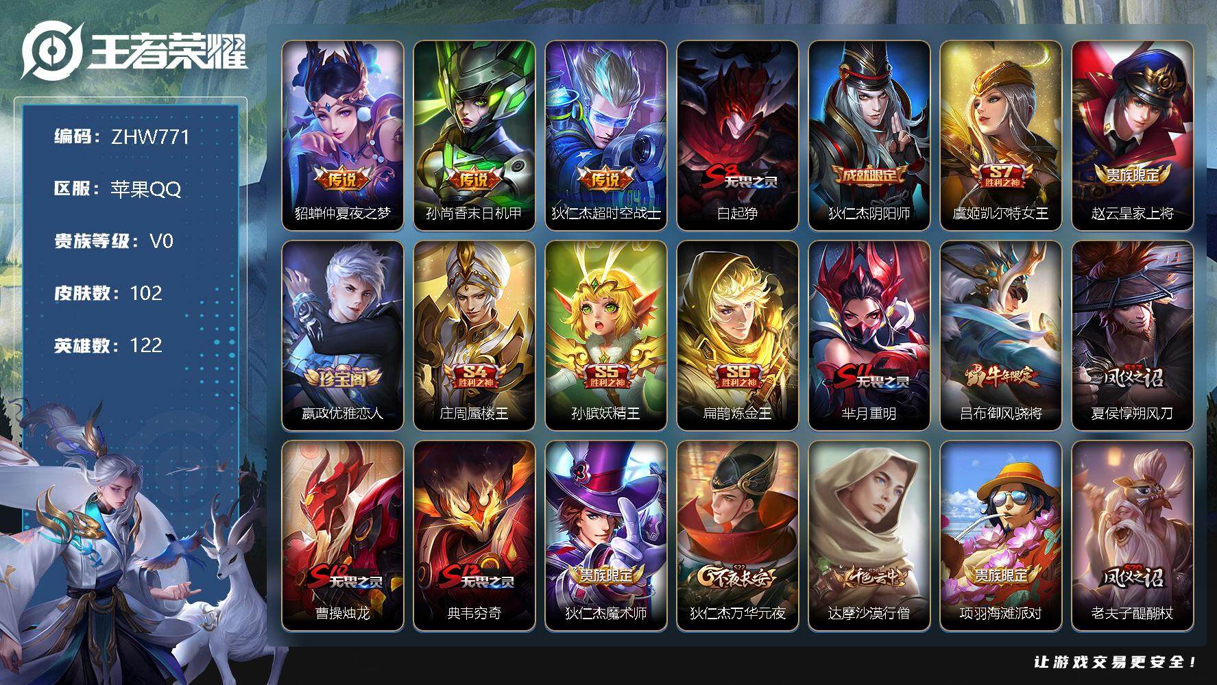 [13068451]苹果Q-V0-永恒钻石III段位-122英雄-102皮肤--3传说-25史诗 【传说皮肤】:貂蝉仲夏夜之梦,孙尚香末日机甲,狄仁杰超时空战士 【限定皮肤】:白起狰,狄仁杰阴阳师,虞姬凯尔特女王,赵云皇家上将,嬴政优雅恋人,庄周蜃楼王,孙膑妖精王,扁鹊炼金王,芈月重明,吕布御风骁将,夏侯惇朔风刀,曹操烛龙,典韦穷奇,狄仁杰魔术师,狄仁杰万华元夜,达摩沙漠行僧,项羽海滩派对,老夫子醍醐杖,关羽冰锋战神,程咬金演武夺筹,兰陵王金庭之子,孙悟空至尊宝,牛魔御旌,李元芳云中旅人,钟馗驱傩正仪,雅典娜黎明之约,太乙真人饕餮,鬼谷子原初探秘者,鬼谷子五谷丰年,苏烈千军破阵,弈星混沌棋,沈梦溪大漠名商,明世隐疑决卦,狂铁御狮,米莱狄御霄,盾山御銮,猪八戒猪悟能 【年限皮肤】:吕布御风骁将 【赛季限定】:庄周蜃楼王,孙膑妖精王,扁鹊炼金王,白起狰,芈月重明,夏侯惇朔风刀,曹操烛龙,典韦穷奇,狄仁杰万华元夜,达摩沙漠行僧,老夫子醍醐杖,程咬金演武夺筹,兰陵王金庭之子,牛魔御旌,李元芳云中旅人,虞姬凯尔特女王,钟馗驱傩正仪,雅典娜黎明之约,太乙真人饕餮,鬼谷子原初探秘者,苏烈千军破阵,弈星混沌棋,沈梦溪大漠名商,明世隐疑决卦,狂铁御狮,米莱狄御霄,盾山御銮 【史诗皮肤】:赵云皇家上将,赵云未来纪元,甄姬冰雪圆舞曲,狄仁杰魔术师,宫本武藏鬼剑武藏,孙尚香水果甜心,嬴政优雅恋人,嬴政摇滚巨星,妲己魅力维加斯,墨子金属风暴,李白千年之狐,韩信白龙吟,关羽冰锋战神,孙悟空至尊宝,花木兰水晶猎龙者,兰陵王暗隐猎兽者,诸葛亮黄金分割率,百里守约特工魅影,刘禅天才门将,孙策猫狗日记,狄仁杰鹰眼统帅,吕布御风骁将,猪八戒猪悟能,雅典娜黎明之约,鬼谷子五谷丰年 【其他皮肤】:项羽海滩派对,韩信教廷特使,韩信街头霸王,达摩大发明家,程咬金星际陆战队,扁鹊化身博士,安琪拉玩偶对对碰,妲己少女阿狸,亚瑟死亡骑士,甄姬花好人间,狄仁杰阴阳师,庄周蜃楼王,刘备纽约教父,孙膑妖精王,扁鹊炼金王,虞姬凯尔特女王,白起狰,钟无艳海滩丽影,太乙真人饕餮,宫本武藏霸王丸,曹操烛龙,芈月重明,典韦穷奇,狂铁御狮,米莱狄御霄,明世隐虹云星官,牛魔御旌,小乔丁香结,盾山御銮,孙膑归虚梦演,夏侯惇朔风刀,弈星混沌棋,哪吒次元突破,明世隐疑决卦,盾山圆桌骑士,老夫子醍醐杖,狂铁特工战影,鬼谷子原初探秘者,狄仁杰万华元夜,程咬金演武夺