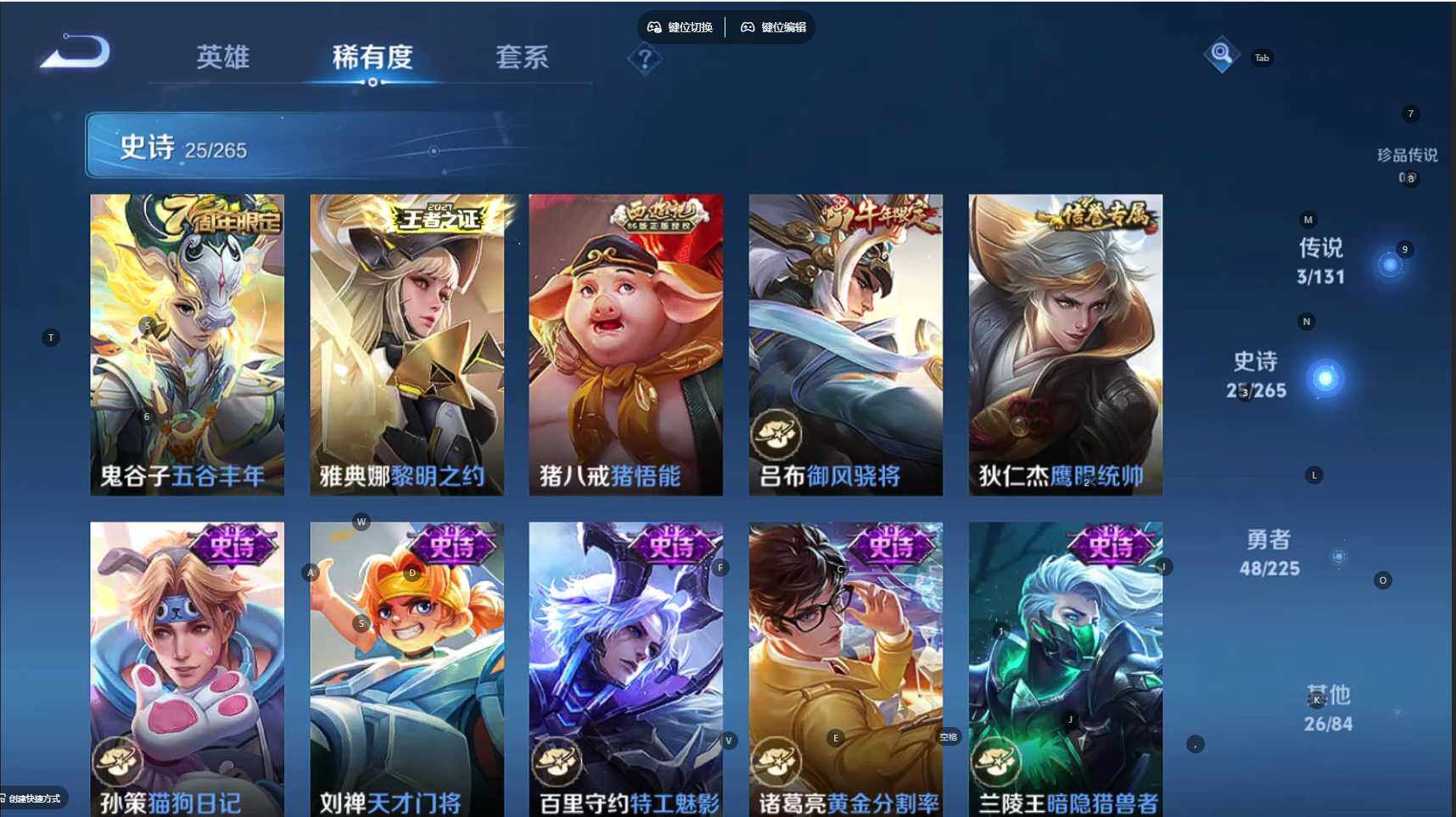 【史诗皮肤】:赵云皇家上将,赵云未来纪元,甄姬冰雪圆舞曲,狄仁杰魔术师,宫本武藏鬼剑武藏,孙尚香水果甜心,嬴政优雅恋人,嬴政摇滚巨星,妲己魅力维加斯,墨子金属风暴,李白千年之狐,韩信白龙吟,关羽冰锋战神,孙悟空至尊宝,花木兰水晶猎龙者,兰陵王暗隐猎兽者,诸葛亮黄金分割率,百里守约特工魅影,刘禅天才门将,孙策猫狗日记,狄仁杰鹰眼统帅,吕布御风骁将,猪八戒猪悟能,雅典娜黎明之约,鬼谷子五谷丰年