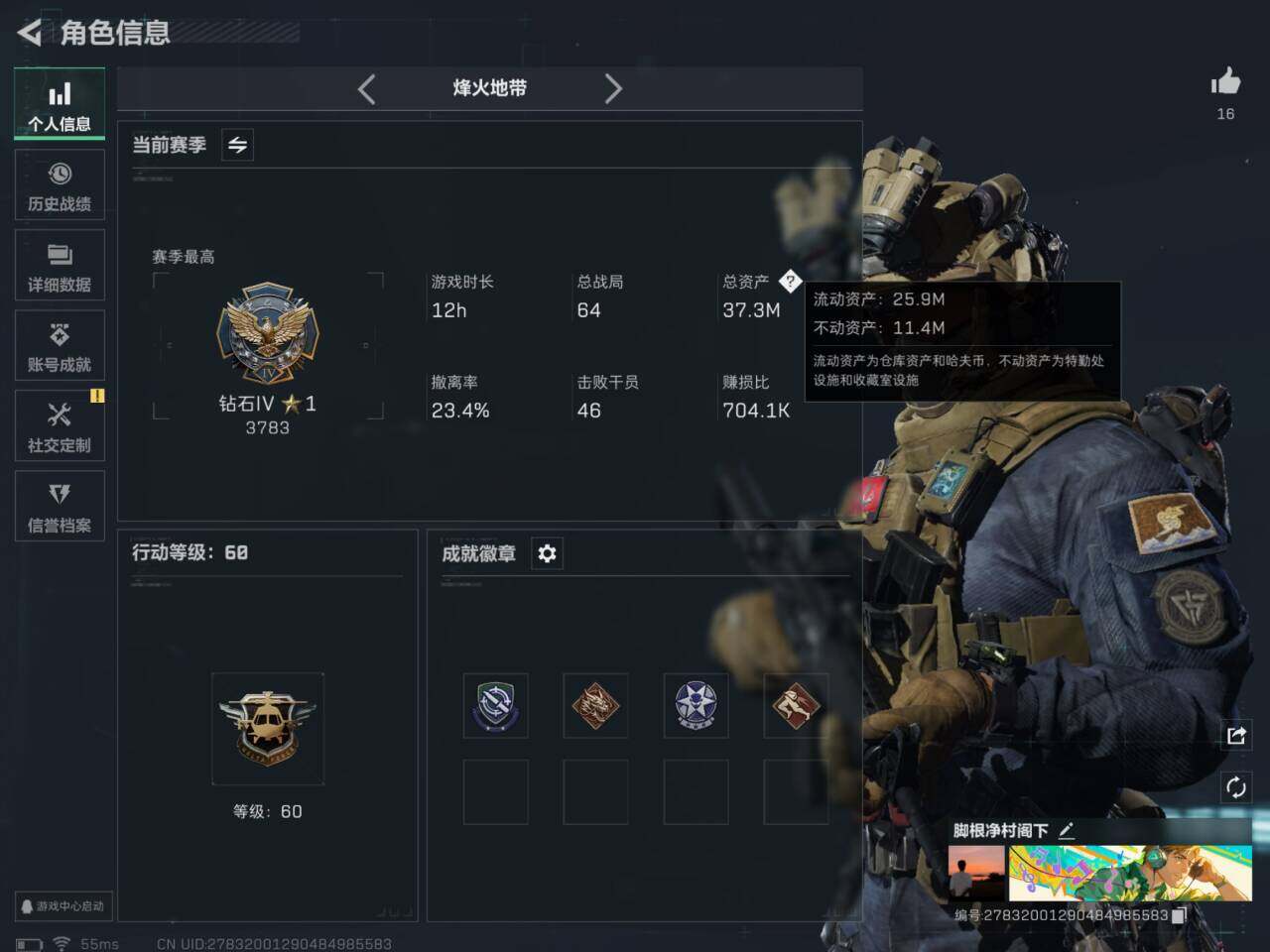 [13068561]总资产37m 18619k哈伏币-25m流动资产-60烽火等级-钻石-1战场等级-无军衔
