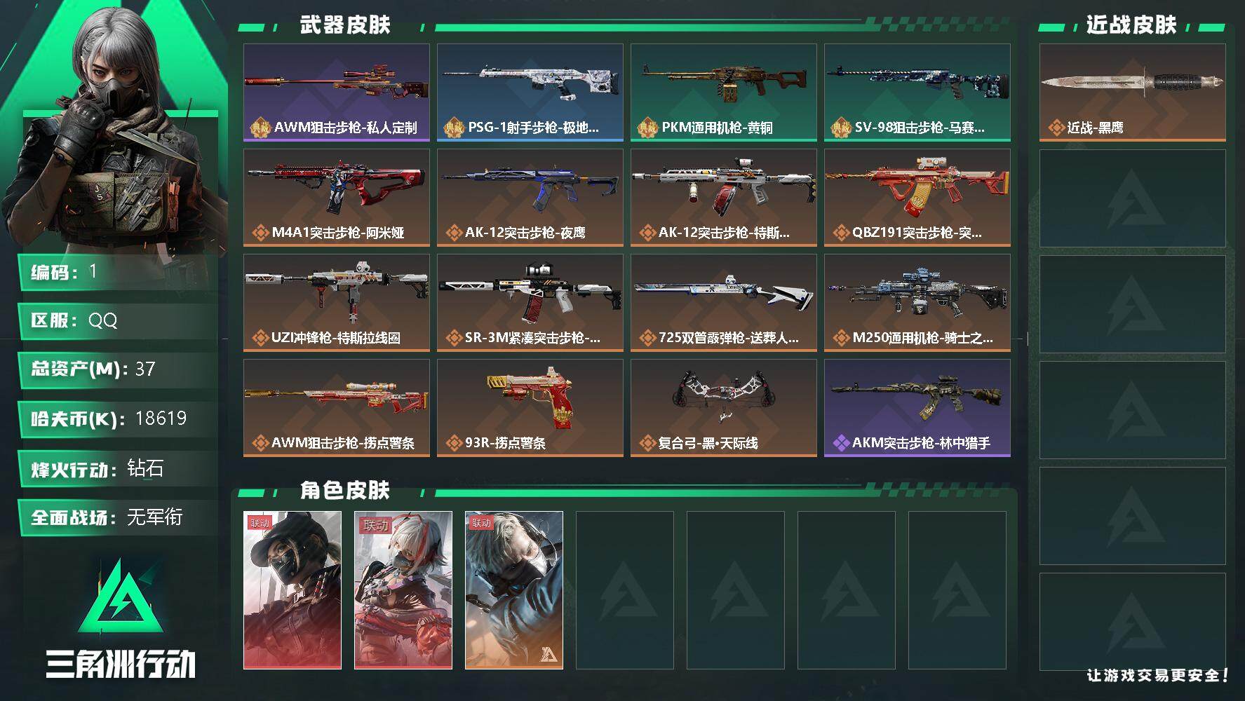 - [12292950]总资产:305.7M 6干员外观 1近战传说 19传说枪械 哈夫币:9.955K 可二次 可修改实名 优质装备:近战-黑海,顶级安全箱(3x3) 烽火地带段位:三角洲巅峰 全面战场段位:上等兵 传说武器皮肤:AS Val突击步枪-蛇年祥瑞,SR-25射手步枪-水墨云图,AK-12突击步枪-夜鹰,SMG45冲锋枪-骑士,M4A1突击步枪-阿米娅,CAR-15突击步枪-阿米娅,复合弓-黑-天际线,AWM狙击步枪-捞点薯条,腾龙突击步枪-捞点薯条,93R-捞点薯条,勇士冲锋枪-能天使-午夜邮差,725双管霰弹枪-送葬人-无题密令,MP5冲锋枪-黑海,QJB201轻机枪-黑海,M7战斗步枪-维京,M4A1突击步枪-蚀金玫瑰,QBZ95-1突击步枪-破军,CAR-15突击步枪-黑鹰坠落 史诗武器皮肤:SR-3M紧凑突击步枪-英雄,M700狙击步枪-蝮蛇,G3战斗步枪-战场英杰,PKM通用机枪-守夜人,AS Val突击步枪-尖端治疗,M700狙击步枪-守夜人,SG552突击步枪-尖端治疗,SR-25射手步枪-尖端治疗,PKM通用机枪-荒野求生,勇士冲锋枪-深海恐惧,AKM突击步枪-林中猎手,.357左轮-幸运时刻,SR-3M紧凑突击步枪-荒野求生,M1014霰弹枪-林中猎手,SV-98狙击步枪-林中猎手,PTR-32突击步枪-英雄,SVD狙击步枪-荒野求生,M250通用机枪-囚徒,SV-98狙击步枪-囚徒,腾龙突击步枪-无垢,PSG-1射手步枪-无垢,M700狙击步枪-阿萨拉工艺,M14射手步枪-黑鹰坠落,沙漠之鹰-曙光,Vector冲锋枪-阿萨拉文明,SVD狙击步枪-阿萨拉工艺,PKM通用机枪-英雄,M700狙击步枪-竞技风,93R-博士 干员外观:威龙-铁面判官,红狼-蚀金玫瑰,牧羊人-街头之王,无名-夜鹰,蜂医-送葬人·无题密令(S5),露娜-黑·天际线