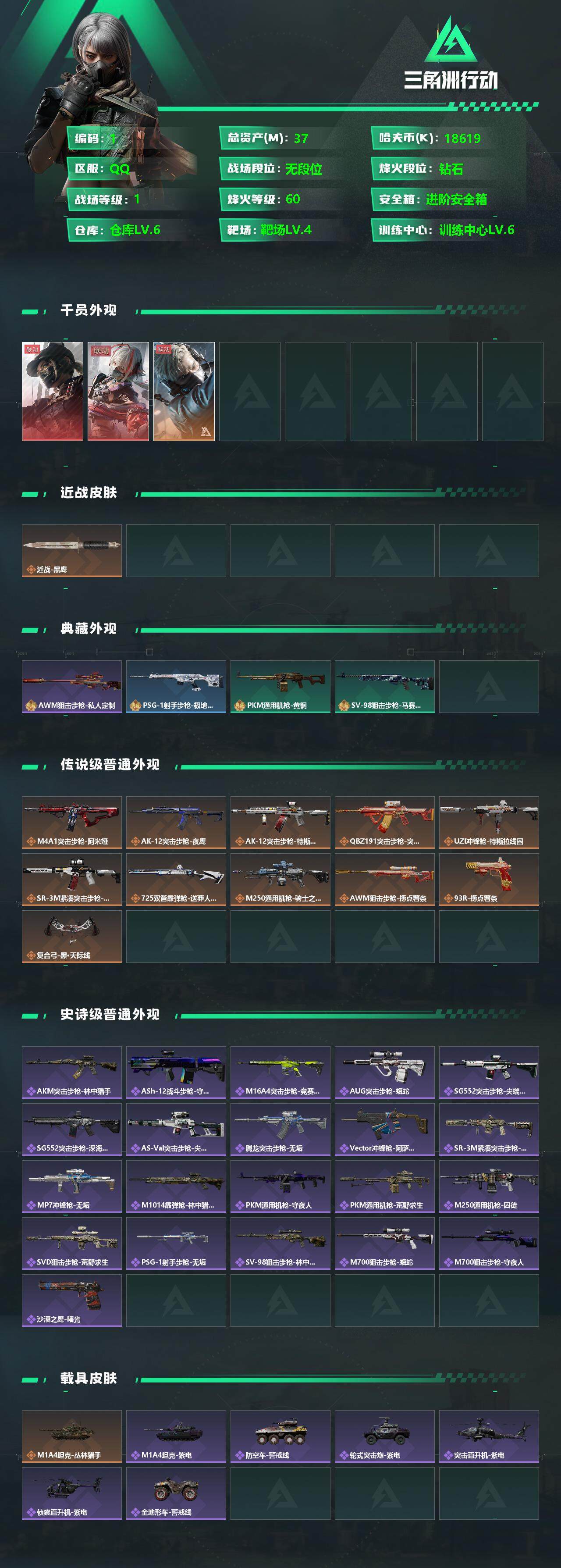 [13068561]总资产37m 18619k哈伏币-25m流动资产-60烽火等级-钻石-1战场等级-无军衔 【干员外观】:露娜-黑·天际线,骇爪-维什戴尔,蜂医-送葬人·无题密令 【近战皮肤】:近战-黑鹰 【典藏外观】:AWM狙击步枪-私人定制,PSG-1射手步枪-极地勘察队,PKM通用机枪-黄铜,SV-98狙击步枪-马赛克涂装 【传说级普通外观】:M4A1突击步枪-阿米娅,AK-12突击步枪-夜鹰,AK-12突击步枪-特斯拉线圈,腾龙突击步枪-捞点薯条,UZI冲锋枪-特斯拉线圈,SR-3M紧凑突击步枪-特斯拉线圈,725双管霰弹枪-送葬人-无题密令,M250通用机枪-骑士之心,AWM狙击步枪-捞点薯条,93R-捞点薯条,复合弓-黑·天际线 【史诗级普通外观】:AKM突击步枪-林中猎手,ASh-12战斗步枪-守夜人,M16A4突击步枪-竞赛选手,AUG突击步枪-蝮蛇,SG552突击步枪-尖端治疗,SG552突击步枪-深海恐惧,AS Val突击步枪-尖端治疗,腾龙突击步枪-无垢,Vector冲锋枪-阿萨拉文明,SR-3M紧凑突击步枪-荒野求生,MP7冲锋枪-无垢,M1014霰弹枪-林中猎手,PKM通用机枪-守夜人,PKM通用机枪-荒野求生,M250通用机枪-囚徒,SVD狙击步枪-荒野求生,PSG-1射手步枪-无垢,SV-98狙击步枪-林中猎手,M700狙击步枪-蝮蛇,M700狙击步枪-守夜人,沙漠之鹰-曙光 【稀有级普通外观】:K416突击步枪-黑骑士,K416突击步枪-虎啸,M16A4突击步枪-远航,SCAR-H战斗步枪-童趣,SCAR-H战斗步枪-远航,SCAR-H战斗步枪-荣耀列队,PTR-32突击步枪-天网,PTR-32突击步枪-英雄,CAR-15突击步枪-前沿科技,腾龙突击步枪-雪崩,K437突击步枪-天狼星,MP5冲锋枪-弄臣,MP5冲锋枪-虎啸,P90冲锋枪-浅鲨小队,P90冲锋枪-新生,Vector冲锋枪-先锋,野牛冲锋枪-新生,SMG-45-行动开启,SMG-45冲锋枪-幻影结构,SMG-45冲锋枪-天网,SR-3M紧凑突击步枪-雪崩,M1014霰弹枪-幻影结构,M250通用机枪-虎啸,M250通用机枪-天网,QJB201轻机枪-远航,Mini-14射手步枪-荣耀列队,SKS射手步枪-雪崩,SR-25射手步枪-开拓,SR-9射手步枪-街头涂鸦,SV-98狙击步枪-星