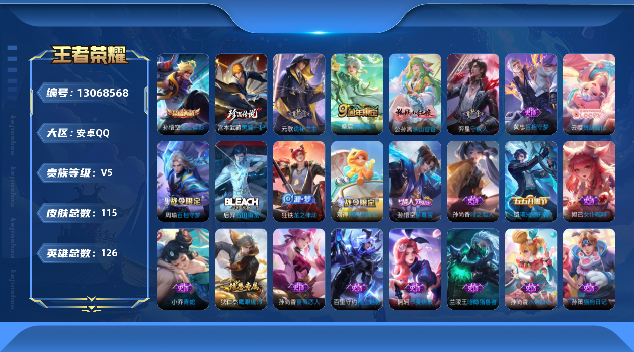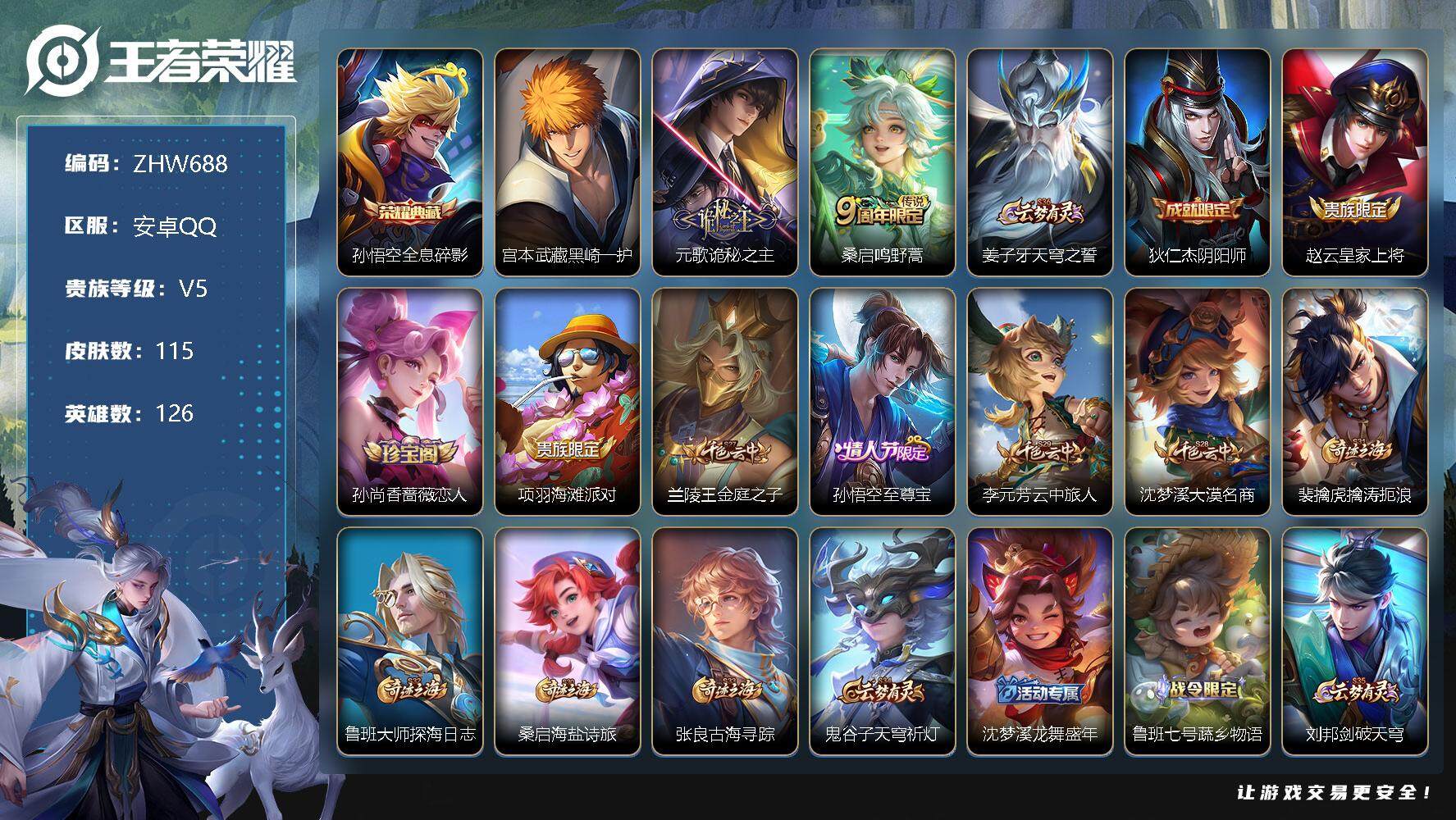 [13068568]安卓Q-V5-永恒钻石II段位-126英雄-115皮肤-1典藏--1珍品传说-2传说-29史诗 【英雄全皮】:孙权全皮 【荣耀典藏】:孙悟空全息碎影 【珍品传说】:宫本武藏黑崎一护 【传说皮肤】:元歌诡秘之主,桑启鸣野蒿 【限定皮肤】:姜子牙天穹之誓,狄仁杰阴阳师,赵云皇家上将,孙尚香蔷薇恋人,项羽海滩派对,兰陵王金庭之子,孙悟空至尊宝,李元芳云中旅人,沈梦溪大漠名商,裴擒虎擒涛扼浪,鲁班大师探海日志,桑启海盐诗旅,张良古海寻踪,鬼谷子天穹祈灯,沈梦溪龙舞盛年,鲁班七号蔬乡物语,刘邦剑破天穹,刘备异域游侠,周瑜熔金海岸 【赛季限定】:兰陵王金庭之子,张良古海寻踪,李元芳云中旅人,沈梦溪大漠名商,裴擒虎擒涛扼浪,鲁班大师探海日志,桑启海盐诗旅,鬼谷子天穹祈灯,刘邦剑破天穹,姜子牙天穹之誓 【战令限定】:鲁班七号蔬乡物语 【史诗皮肤】:赵云皇家上将,貂蝉圣诞恋歌,宫本武藏鬼剑武藏,孙尚香蔷薇恋人,孙尚香水果甜心,嬴政摇滚巨星,妲己魅力维加斯,妲己女仆咖啡,张飞乱世虎臣,孙悟空至尊宝,兰陵王暗隐猎兽者,百里守约特工魅影,铠曙光守护者,刘禅天才门将,阿轲节奏热浪,孙策猫狗日记,伽罗箭羽风息,狄仁杰鹰眼统帅,小乔青蛇,孙尚香时之恋人,鲁班七号蔬乡物语,刘禅鸭鸭历险记,狂铁龙之律动,后羿石田雨龙,周瑜百相守梦,云缨赞萌露比,黄忠百相守梦,弈星守夜人,公孙离涂山容容 【其他皮肤】:项羽海滩派对,韩信街头霸王,达摩大发明家,赵云忍炎影,白起白色死神,扁鹊化身博士,孙膑天使之翼,典韦黄金武士,亚瑟死亡骑士,达摩拳王,花木兰兔女郎,甄姬花好人间,刘备万事如意,狄仁杰阴阳师,关羽龙腾万里,孙尚香沉稳之力,李白敏锐之力,苏烈坚韧之力,吕布野性能量,沈梦溪鲨炮海盗猫,鲁班七号黑桃队长,狂铁特工战影,杨戬次元傲视,盘古重装意志,马可波罗潮玩牛仔,程咬金无双福将,兰陵王金庭之子,沈梦溪大漠名商,蒙恬蔚蓝守将,李元芳云中旅人,桑启海盐诗旅,海月幻泉雾影,猪八戒潮玩探月行,裴擒虎擒涛扼浪,太乙真人劲辣红锅,鲁班大师探海日志,姬小满零食大作战,李元芳妄想特派,张良古海寻踪,后羿完美运算,鬼谷子天穹祈灯,沈梦溪龙舞盛年,刘邦剑破天穹,刘备异域游侠,姜子牙天穹之誓,周瑜熔金海岸,盘古敬我三分,东皇太一噬灭天穹,米莱狄怪诞之夜,钟馗虚灵犬护,沈梦溪鸭鸭历险记,阿古朵布丁狗之约,露娜命运加冕,雅典娜潮玩士官
