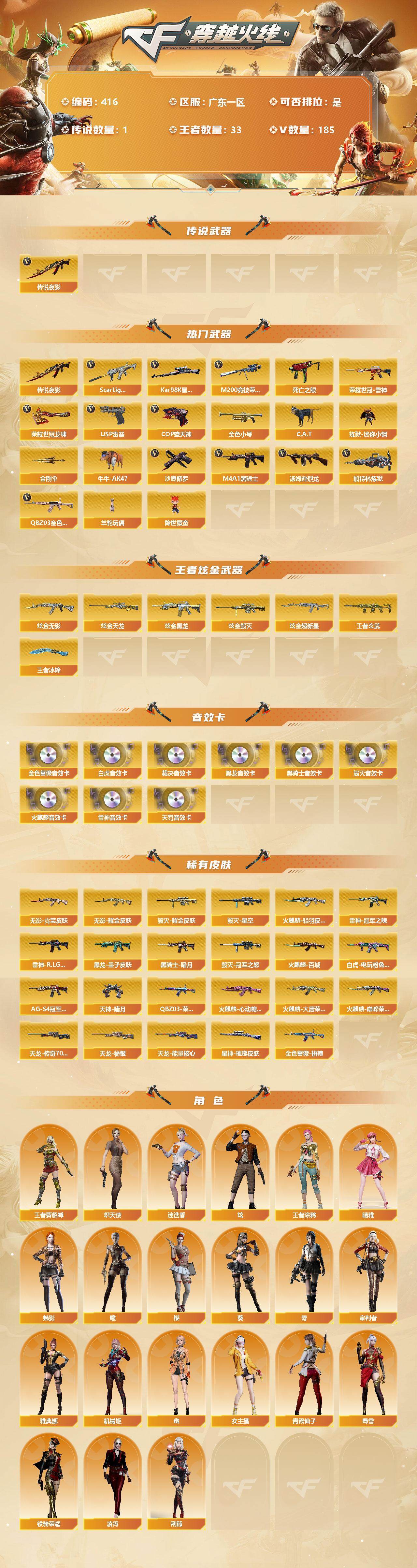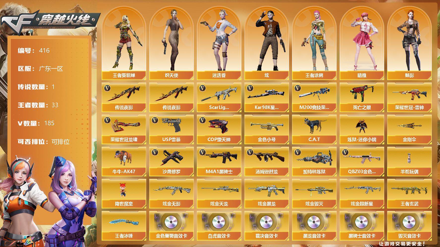 [13074389]【416】172V/102级/荣耀元首/1传说/33王者/6炫金/13英雄/传说夜影/QBZ03-金色蔷薇/Scar Light-白虎/M200-竞技荣光/死亡之眼/雷神-荣耀世冠/Kar98k-星神/金色小号/C.A.T/炼狱-迷你小钢/牛牛-AK47/M4A1-黑骑士/汤姆逊-烈龙/加特林-炼狱/羊驼玩偶/降世魔童/USP雷暴/COP-堕天神/沙鹰-修罗/龙啸-荣耀世冠/金刚伞/王者玄武/王者冰锋/炫金无影/炫金天龙/炫金黑龙/炫金毁灭/炫金超新星/AK47-火麒麟音效卡/M4A1-雷神音效卡/M4A1-黑龙音效卡/M4A1-黑骑士音效卡/Barrett-毁灭音效卡/金色蔷薇音效卡/AWM-裁决音效卡/白虎音效卡/QBZ03-天罚音效卡/Barrett-碧霄极光音效卡/炼狱-百战金芒-庆典舞曲音效卡/沙鹰-修罗-盛典舞曲音效卡/柯尔特-百战金芒-庆典舞曲音效卡/女战神梧桐语音包/白虎-电玩粉兔/白虎-百战金芒 皮肤/QBZ03-荣耀世冠白鲨/QBZ03-金色蔷薇-拼搏/AWM-裁决-凤灵皮肤/裁决-巅峰荣耀 皮肤/星神-璀璨皮肤/雷神-暗月/雷神冠军之魄/雷神-R.LGD-CFPLS18冠军/雷神-机甲刑天皮肤/M4A1-再燃火线/火麒麟-轻羽皮肤/火麒麟-百城/火麒麟-巅峰荣耀/火麒麟-大唐荣光/火麒麟-心动糖果/毁灭耀金皮肤/毁灭-星空/毁灭-冠军之怒/毁灭-航天科技皮肤/M4A1-千变-孔明皮肤/黑龙-能量核心/黑龙-暗月/黑龙-墨子皮肤/黑骑士-暗月/黑骑士-AG-S4冠军典藏/黑骑士-破浪10年皮肤/无影-能量核心/无影耀金皮肤/无影-霓裳皮肤/战神-粉色甜心皮肤/战神-紫绶金章皮肤/战神-流金岁月皮肤/天龙-秘银/天龙-能量核心/AWM-天龙-传奇70KG/极光-能量核心/修罗-能量核心/天神-暗月/天神-宇航兔皮肤/屠龙-巅峰荣耀 皮肤/轻型军用手斧-再燃火线/审判者/零/葵/樱/瞳/魅影/炫/迷迭香/凌霄/晴雅/机械姬/荆棘/王者-葵-貂蝉/王者涂鸦/雅典娜/幽/蜀雪/炽天使/女主播/铁骑荣耀/青霞仙子/火麒麟-灵狐/M4A1-雷神-精英刀锋/巴雷特-零-水下丽影/AWM-灵狐-15周年嘉年华/M37-葵/COP-旗袍/迷你艾比/迷你超能女侍/迷你牛魔王/夺魂/迷你生化手雷/闪光弹-小乔/超级对讲机/6烈龙/AK47-冰龙粉碎者/神圣爆裂者/冰