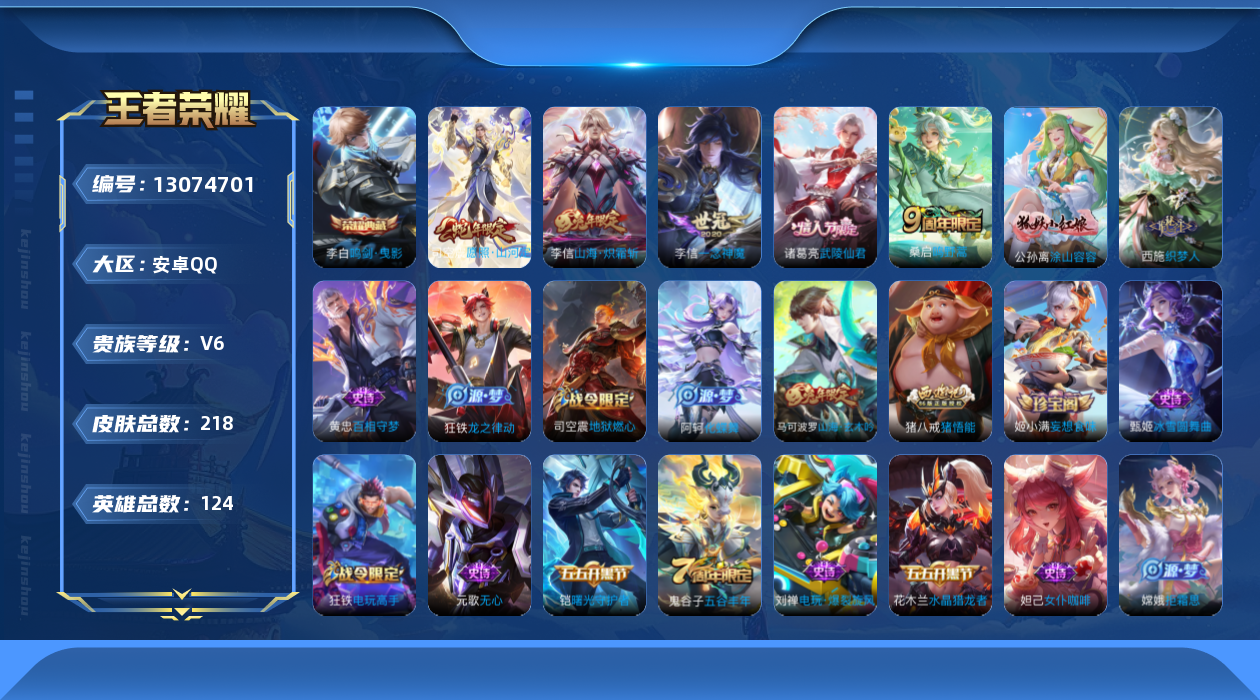 [13074701]安卓Q-V6-最强王者段位-124英雄-218皮肤-1典藏-0珍品无双-0无双-0珍品传说-5传说-52史诗