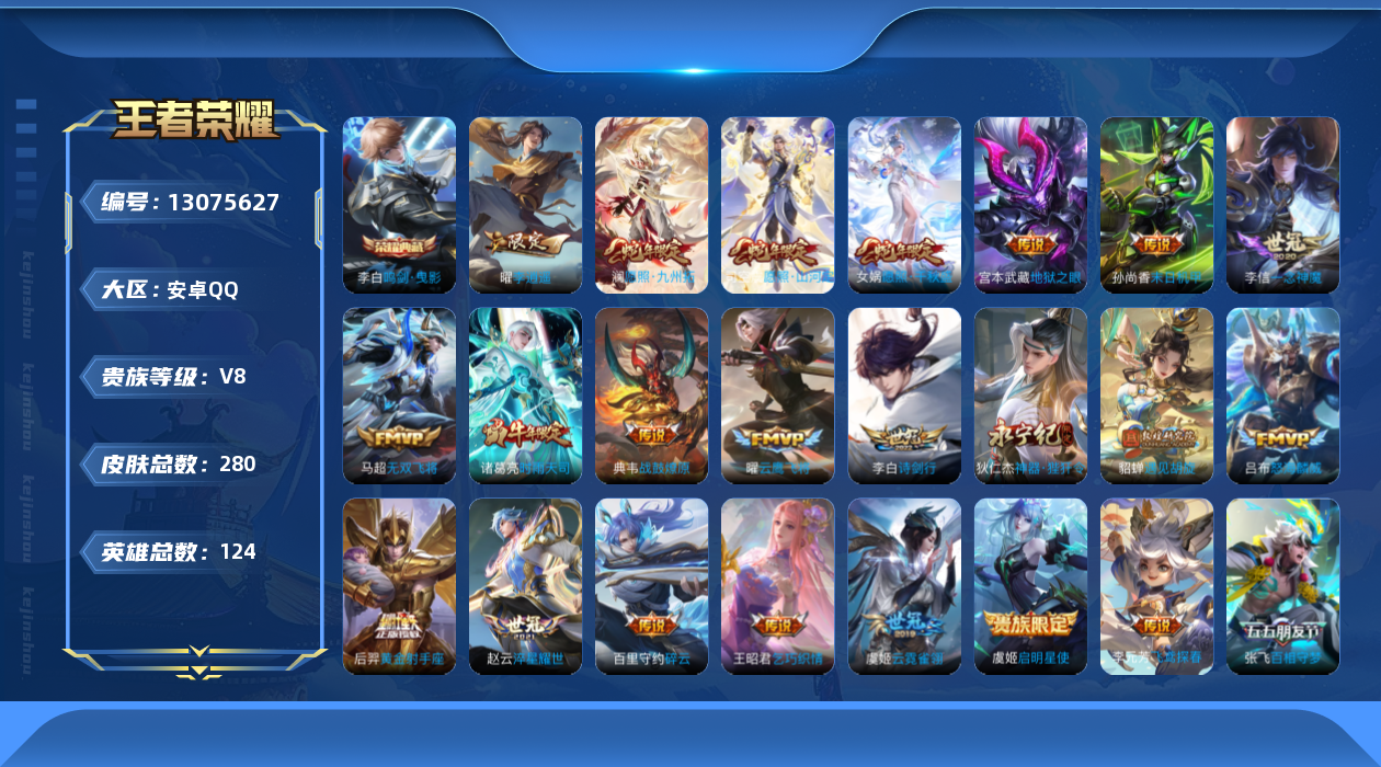 [13075627]安卓Q-V8-永恒钻石II段位-124英雄-280皮肤-1典藏-0珍品无双-0无双-0珍品传说-23传说-91史诗
