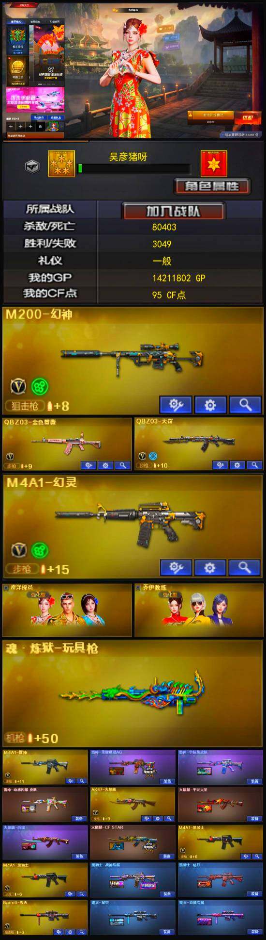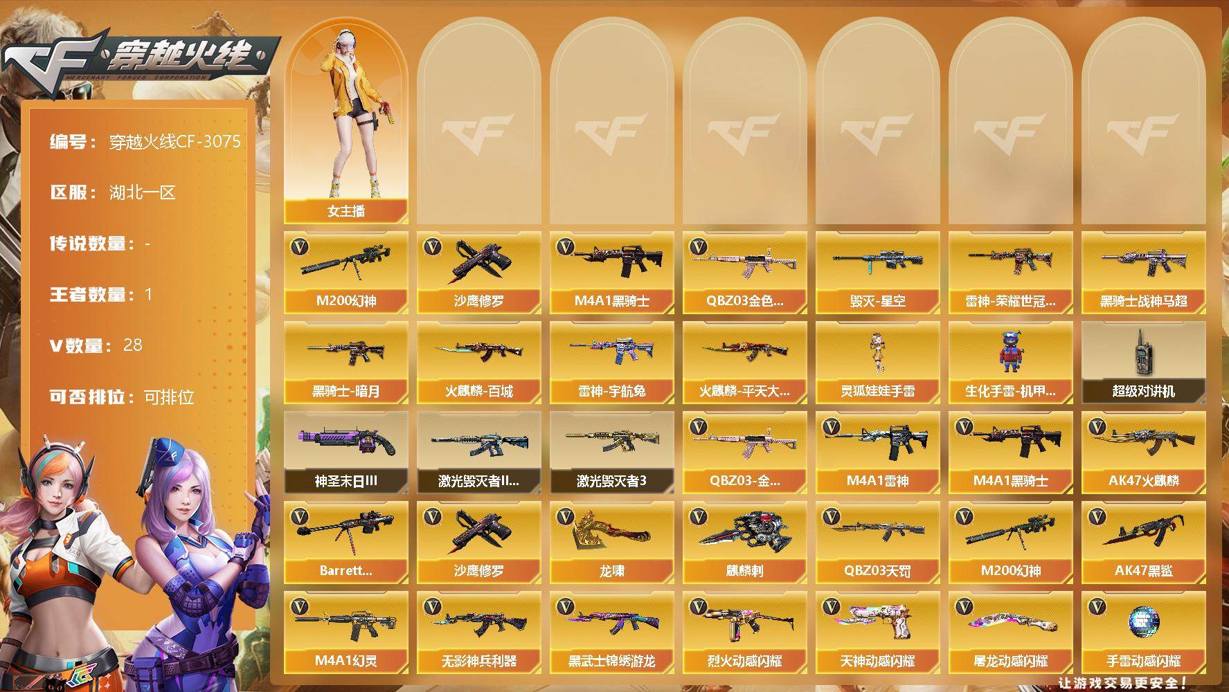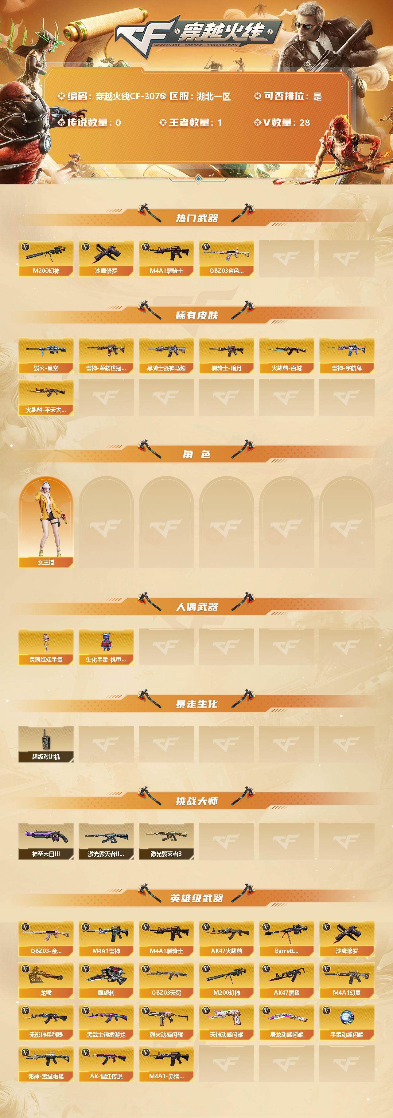 [13076405]湖北一区-28V-1王者-0炫金 【热门武器】:QBZ03-金色蔷薇,M200-幻神,M4A1-黑骑士*2,沙鹰-修罗*3 【音效卡】:死神-雪域霜狐-怀旧音效卡 【皮肤】:雷神-荣耀世冠AG,雷神-宇航兔皮肤,雷神-动感闪耀 皮肤,火麒麟-平天大圣,火麒麟-百城,毁灭-星空,M4A1-千变-孔明皮肤,黑骑士-暗月,黑骑士-战神马超 【角色】:女主播 【人偶武器】:灵狐娃娃手雷,生化手雷-机甲核心 【暴走生化】:超级对讲机 【挑战大师】:激光毁灭者III-白马银枪,激光毁灭者III,神圣爆裂者-末日III 【英雄级武器】:AK47-火麒麟,M4A1-雷神,M4A1-黑骑士*2,AK47-黑鲨,M4A1-幻灵,QBZ03-天罚,无影-神兵利器,黑武士-锦绣游龙,死神-雪域霜狐,QBZ03-金色蔷薇,烈火-动感闪耀,AK-47-猩红传说,Barrett-毁灭,M200-幻神,沙鹰-修罗*3,天神-动感闪耀,龙啸,麒麟刺,屠龙-动感闪耀,高爆手雷-幻灵*3,手雷-动感闪耀,手雷-热带奇洋,闪光弹-幻灵,M4A1-赤狱骑士 【特殊枪械】:2黑骑士