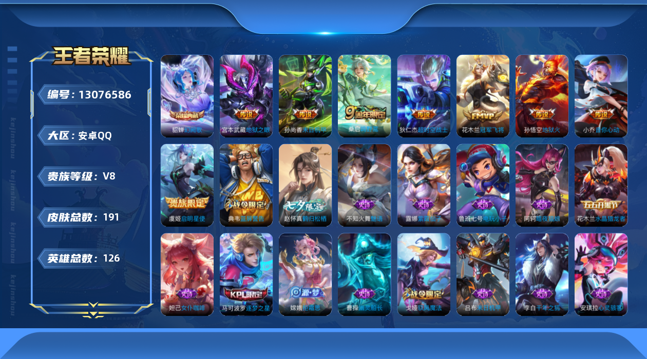 [13076586]安卓Q-V8-尊贵铂金IV段位-126英雄-191皮肤-1典藏-0珍品无双-0无双-0珍品传说-9传说-44史诗 【荣耀典藏】:貂蝉幻阙歌 【传说皮肤】:后羿神树通天,桑启鸣野蒿,小乔音你心动,虞姬启明星使,花木兰冠军飞将,孙尚香末日机甲,宫本武藏地狱之眼,孙悟空地狱火,狄仁杰超时空战士 【限定皮肤】:姜子牙天穹之誓,狄仁杰阴阳师,赵云皇家上将,嬴政白昼王子,鲁班七号狮舞东方,高渐离玩趣恶龙,吕布猎兽之王,夏侯惇朔风刀,典韦穷奇,典韦蓝屏警告,马可波罗逐梦之星,狄仁杰魔术师,狄仁杰万华元夜,项羽海滩派对,老夫子醍醐杖,程咬金演武夺筹,牛魔御旌,李元芳匿光侦查者,虞姬启明星使,钟馗神迹守卫,杨玉环遇见飞天,女娲朔望之晖,弈星混沌棋,明世隐疑决卦,裴擒虎擒涛扼浪,狂铁御狮,米莱狄御霄,云中君纤云弄巧,盾山御銮,上官婉儿梁祝,嫦娥拒霜思,西施玲珑珍味,鲁班大师探海日志,戈娅驭风魔法,赵怀真鹤归松栖,张良古海寻踪,鬼谷子天穹祈灯,刘邦剑破天穹,周瑜熔金海岸 【赛季限定】:夏侯惇朔风刀,典韦穷奇,狄仁杰万华元夜,老夫子醍醐杖,程咬金演武夺筹,张良古海寻踪,牛魔御旌,弈星混沌棋,明世隐疑决卦,裴擒虎擒涛扼浪,狂铁御狮,米莱狄御霄,盾山御銮,鲁班大师探海日志,鬼谷子天穹祈灯,刘邦剑破天穹,姜子牙天穹之誓 【战令限定】:嬴政白昼王子,鲁班七号狮舞东方,吕布猎兽之王,典韦蓝屏警告,钟馗神迹守卫,女娲朔望之晖,西施玲珑珍味,戈娅驭风魔法 【史诗皮肤】:鲁班七号电玩小子,项羽苍穹之光,露娜紫霞仙子,阿轲暗夜猫娘,赵云皇家上将,赵云未来纪元,貂蝉圣诞恋歌,王昭君偶像歌手,狄仁杰魔术师,孙尚香水果甜心,嬴政摇滚巨星,妲己魅力维加斯,妲己女仆咖啡,墨子金属风暴,吕布圣诞狂欢,刘禅绅士熊喵,曹操幽灵船长,李白千年之狐,吕布末日机甲,张飞乱世虎臣,花木兰水晶猎龙者,小乔缤纷独角兽,兰陵王暗隐猎兽者,马可波罗逐梦之星,亚瑟心灵战警,安琪拉心灵骇客,李元芳逐浪之夏,程咬金功夫厨神,白起星夜王子,阿轲节奏热浪,杨玉环遇见飞天,嬴政白昼王子,孙策猫狗日记,典韦蓝屏警告,鲁班七号狮舞东方,狄仁杰鹰眼统帅,上官婉儿梁祝,不知火舞魅语,云中君纤云弄巧,嫦娥拒霜思,戈娅驭风魔法,百里守约真我赫兹,赵怀真鹤归松栖,李元芳匿光侦查者 【其他皮肤】:项羽海滩派对,韩信教廷特使,韩信街头霸王,阿轲爱心护理,达摩大发明家