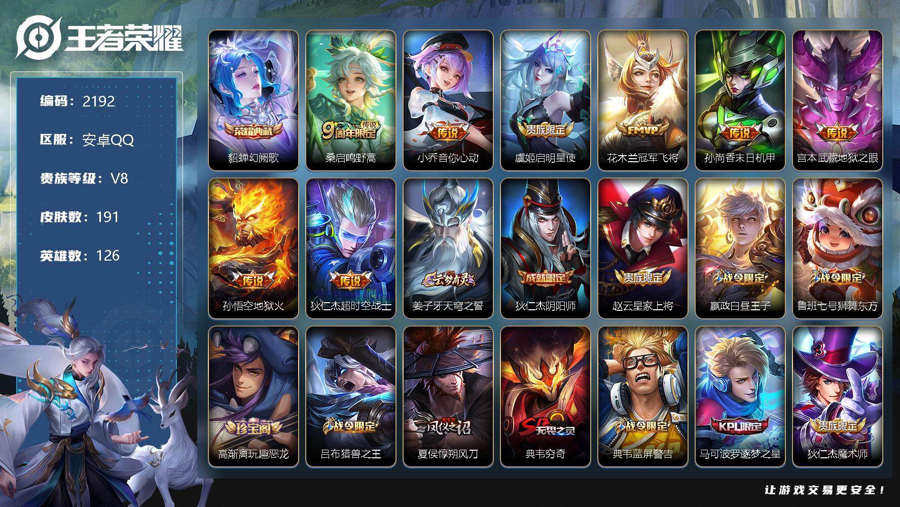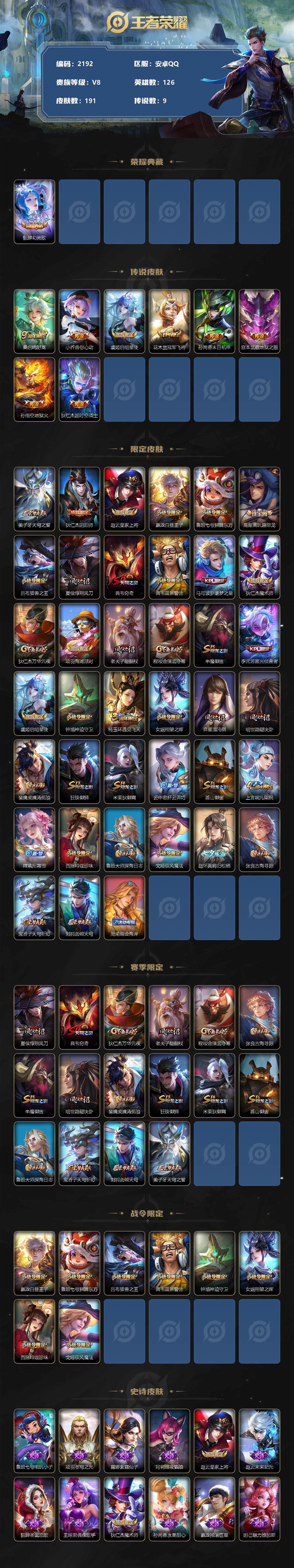 [13076586]安卓Q-V8-尊贵铂金IV段位-126英雄-191皮肤-1典藏-0珍品无双-0无双-0珍品传说-9传说-44史诗