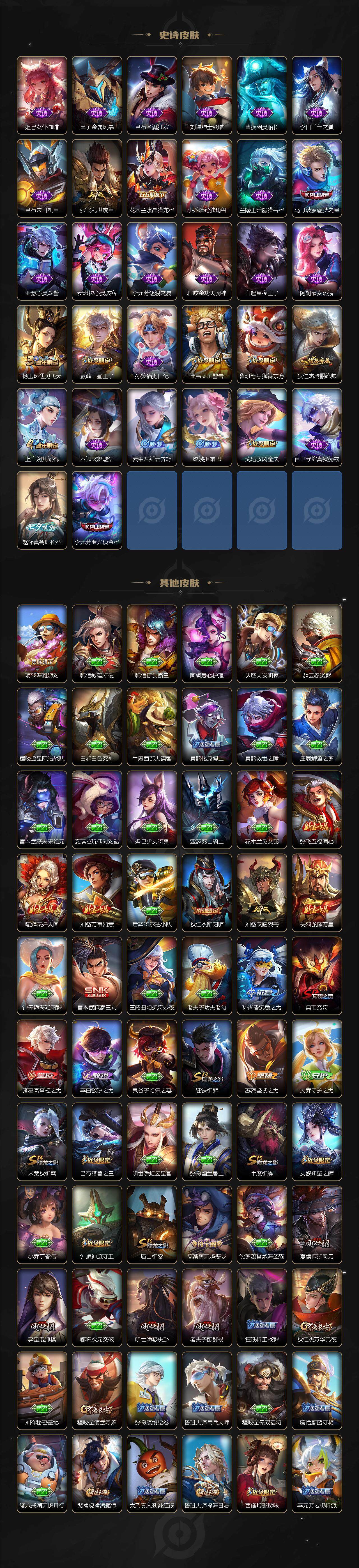 【史诗皮肤】:鲁班七号电玩小子,项羽苍穹之光,露娜紫霞仙子,阿轲暗夜猫娘,赵云皇家上将,赵云未来纪元,貂蝉圣诞恋歌,王昭君偶像歌手,狄仁杰魔术师,孙尚香水果甜心,嬴政摇滚巨星,妲己魅力维加斯,妲己女仆咖啡,墨子金属风暴,吕布圣诞狂欢,刘禅绅士熊喵,曹操幽灵船长,李白千年之狐,吕布末日机甲,张飞乱世虎臣,花木兰水晶猎龙者,小乔缤纷独角兽,兰陵王暗隐猎兽者,马可波罗逐梦之星,亚瑟心灵战警,安琪拉心灵骇客,李元芳逐浪之夏,程咬金功夫厨神,白起星夜王子,阿轲节奏热浪,杨玉环遇见飞天,嬴政白昼王子,孙策猫狗日记,典韦蓝屏警告,鲁班七号狮舞东方,狄仁杰鹰眼统帅,上官婉儿梁祝,不知火舞魅语,云中君纤云弄巧,嫦娥拒霜思,戈娅驭风魔法,百里守约真我赫兹,赵怀真鹤归松栖,李元芳匿光侦查者