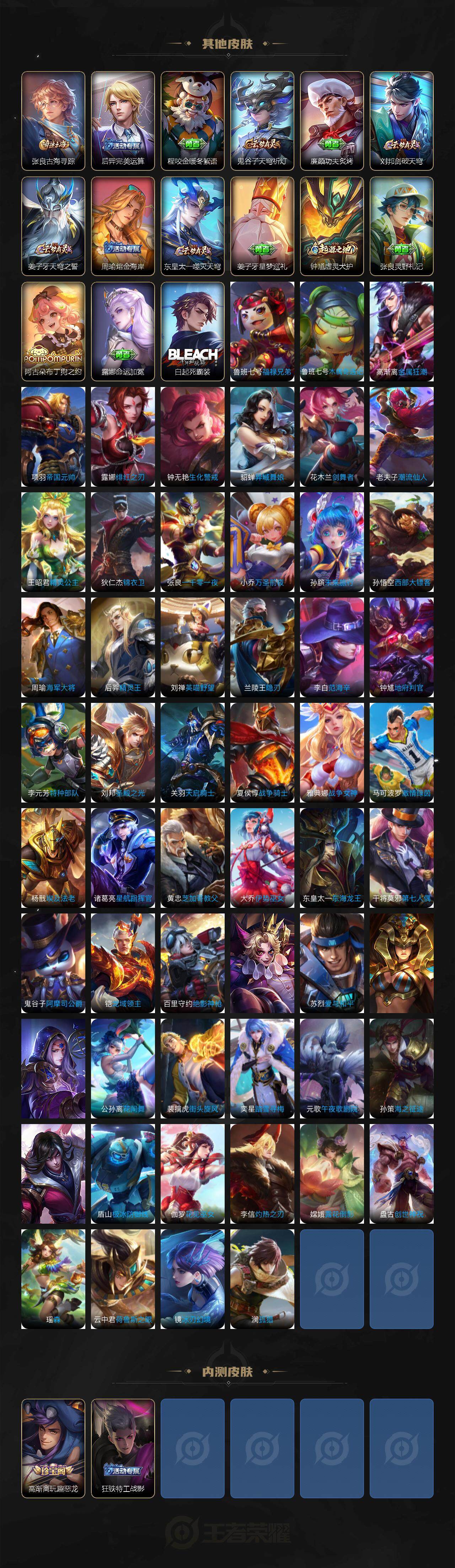 【限定皮肤】:姜子牙天穹之誓,狄仁杰阴阳师,赵云皇家上将,嬴政白昼王子,鲁班七号狮舞东方,高渐离玩趣恶龙,吕布猎兽之王,夏侯惇朔风刀,典韦穷奇,典韦蓝屏警告,马可波罗逐梦之星,狄仁杰魔术师,狄仁杰万华元夜,项羽海滩派对,老夫子醍醐杖,程咬金演武夺筹,牛魔御旌,李元芳匿光侦查者,虞姬启明星使,钟馗神迹守卫,杨玉环遇见飞天,女娲朔望之晖,弈星混沌棋,明世隐疑决卦,裴擒虎擒涛扼浪,狂铁御狮,米莱狄御霄,云中君纤云弄巧,盾山御銮,上官婉儿梁祝,嫦娥拒霜思,西施玲珑珍味,鲁班大师探海日志,戈娅驭风魔法,赵怀真鹤归松栖,张良古海寻踪,鬼谷子天穹祈灯,刘邦剑破天穹,周瑜熔金海岸
