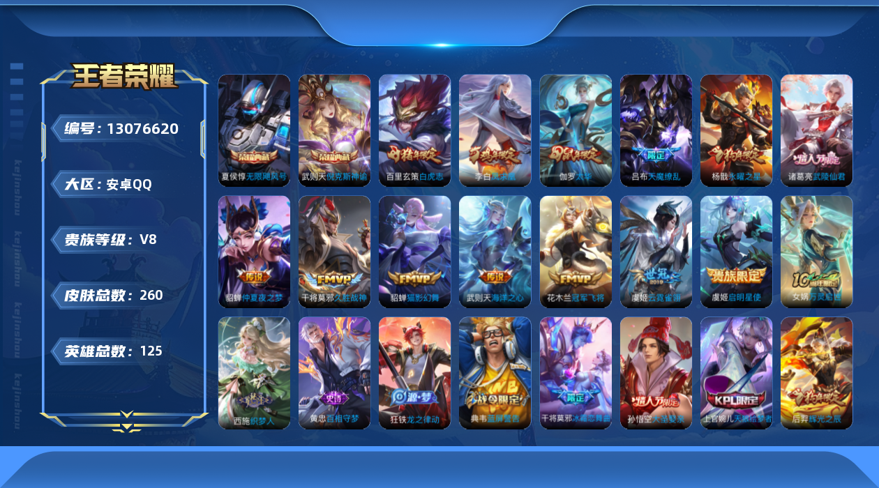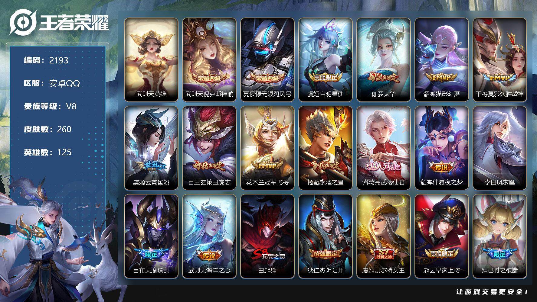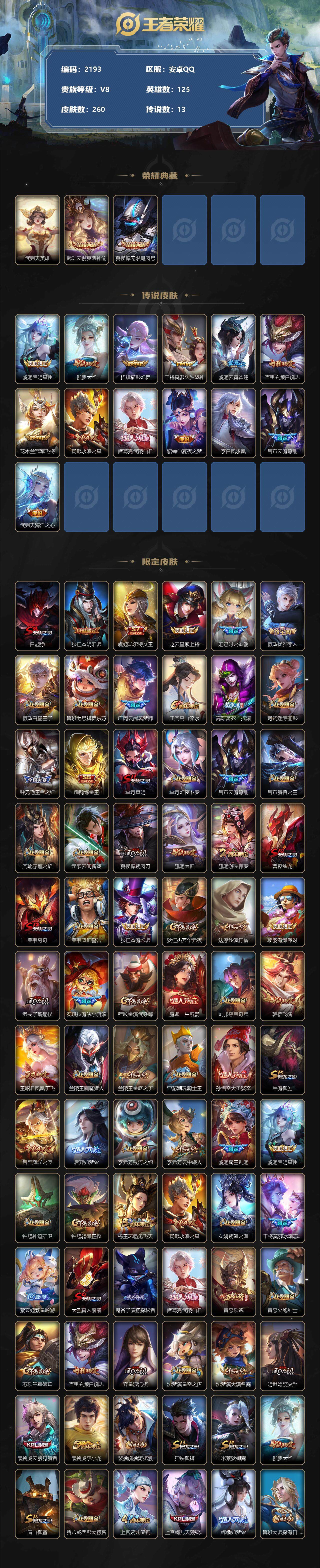 [13076620]安卓Q-V8-永恒钻石I段位-125英雄-260皮肤-2典藏-0珍品无双-0无双-0珍品传说-13传说-78史诗
