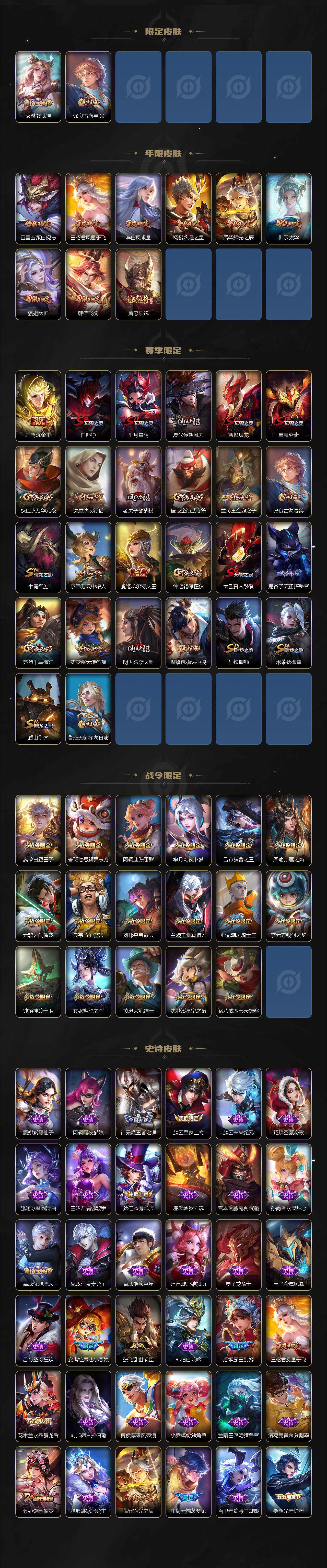 【限定皮肤】:白起狰,狄仁杰阴阳师,虞姬凯尔特女王,赵云皇家上将,妲己时之彼端,嬴政优雅恋人,嬴政白昼王子,鲁班七号狮舞东方,庄周云端筑梦师,庄周高山流水,高渐离死亡摇滚,阿轲迷踪丽影,钟无艳王者之锤,扁鹊炼金王,芈月重明,芈月幻夜卜梦,吕布天魔缭乱,吕布猎兽之王,周瑜赤莲之焰,元歌云间偶戏,夏侯惇朔风刀,甄姬幽恒,甄姬游园惊梦,曹操烛龙,典韦穷奇,典韦蓝屏警告,狄仁杰魔术师,狄仁杰万华元夜,达摩沙漠行僧,项羽海滩派对,老夫子醍醐杖,安琪拉魔法小厨娘,程咬金演武夺筹,露娜一生所爱,刘邦夺宝奇兵,韩信飞衡,王昭君凤凰于飞,兰陵王驯魔猎人,兰陵王金庭之子,亚瑟潮玩骑士王,孙悟空大圣娶亲,牛魔御旌,后羿辉光之辰,后羿如梦令,李元芳银河之约,李元芳云中旅人,虞姬霸王别姬,虞姬启明星使,钟馗神迹守卫,钟馗驱傩正仪,杨玉环遇见飞天,杨戬永曜之星,女娲朔望之晖,干将莫邪冰霜恋舞曲,蔡文姬繁星吟游,太乙真人饕餮,鬼谷子原初探秘者,诸葛亮武陵仙君,黄忠烈魂,黄忠火炮绅士,苏烈千军破阵,百里玄策白虎志,弈星混沌棋,沈梦溪星空之诺,沈梦溪大漠名商,明世隐疑决卦,裴擒虎天狼狩猎者,裴擒虎李小龙,裴擒虎擒涛扼浪,狂铁御狮,米莱狄御霄,伽罗太华,盾山御銮,猪八戒西部大镖客,上官婉儿梁祝,上官婉儿天狼绘梦者,嫦娥如梦令,鲁班大师探海日志,艾琳女武神,张良古海寻踪