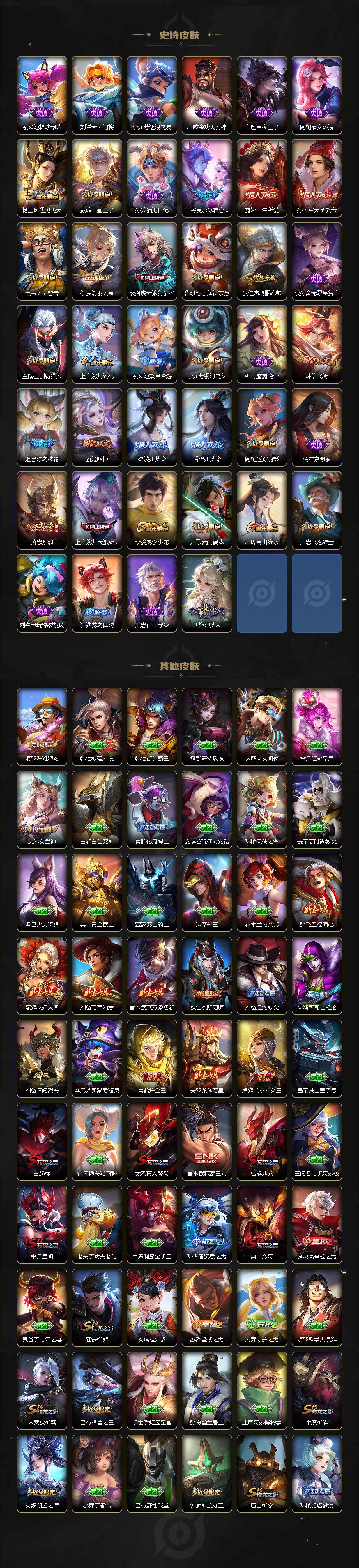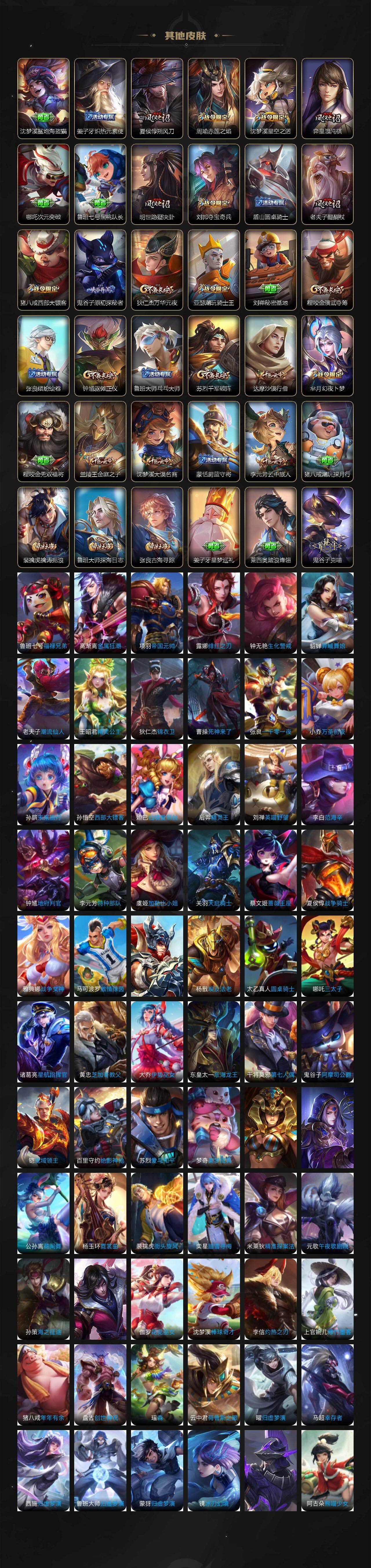 扁鹊炼金王,虞姬凯尔特女王,白起狰,太乙真人饕餮,曹操烛龙,芈月重明,典韦穷奇,狂铁御狮,米莱狄御霄,牛魔御旌,盾山御銮,夏侯惇朔风刀,明世隐疑决卦,老夫子醍醐杖,鬼谷子原初探秘者,狄仁杰万华元夜,程咬金演武夺筹,钟馗驱傩正仪,苏烈千军破阵,吕布猎兽之王,嬴政白昼王子,女娲朔望之晖,典韦蓝屏警告,钟馗神迹守卫,鲁班七号狮舞东方,沈梦溪星空之诺,李元芳银河之约,刘邦夺宝奇兵,元歌云间偶戏,弈星混沌棋,达摩沙漠行僧,兰陵王金庭之子,沈梦溪大漠名商,李元芳云中旅人,裴擒虎擒涛扼浪,鲁班大师探海日志,张良古海寻踪